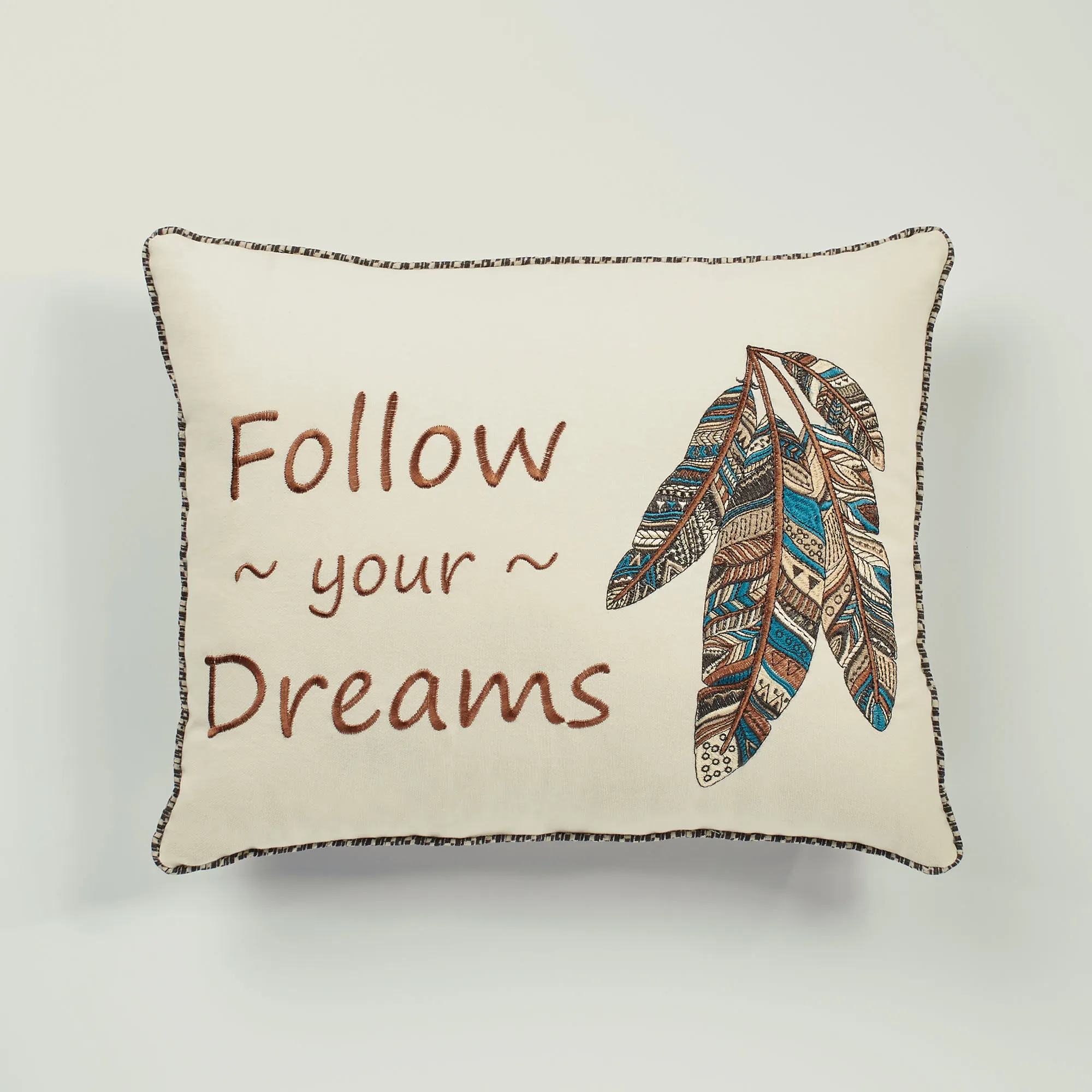 The Maverick Rectangle Pillow will decorate your space with a rustic Southwestern vibe. The piped, cotton pillow features embroidered feathers and the words "Follow your Dreams" on light cream. Accent colors include mocha, straw, vivid blue, saddle brown, black, and light cream. Measures 14"x20". Fill is polyester. Spot clean. Imported.