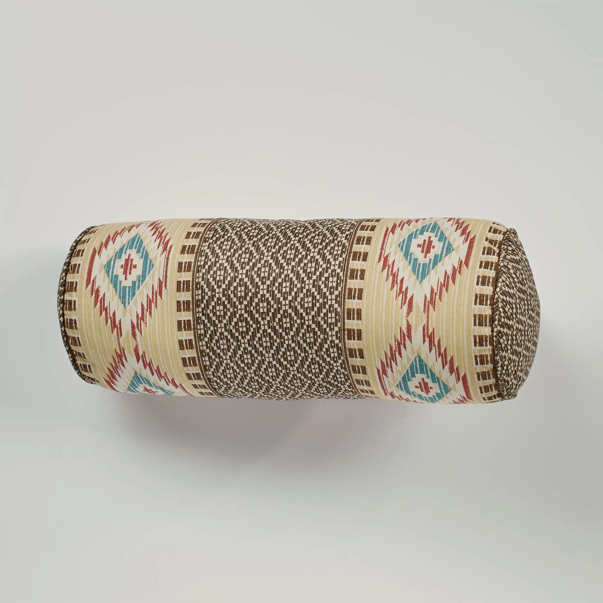 The Southwestern designs on the Maverick Bedding Accessories will decorate your sleeping space with a rustic vibe. The cotton/polyester European Sham and Neckroll Pillow feature printed geometrics and diamonds in ecru, dark chocolate, dark red, mocha, straw, and blue. The tailored and pieced European Sham also has quilting, decorative wood buttons, and ties; French back closure. The piped, pieced Neckroll Pillow, 7"x20", has Southwestern prints. The piped, cotton Rectangle Pillow, 14"x20", has embroidered feathers and the words "Follow your Dreams" on light cream. Machine wash the European sham. Spot clean the pillows; pillow fill is polyester. Imported.