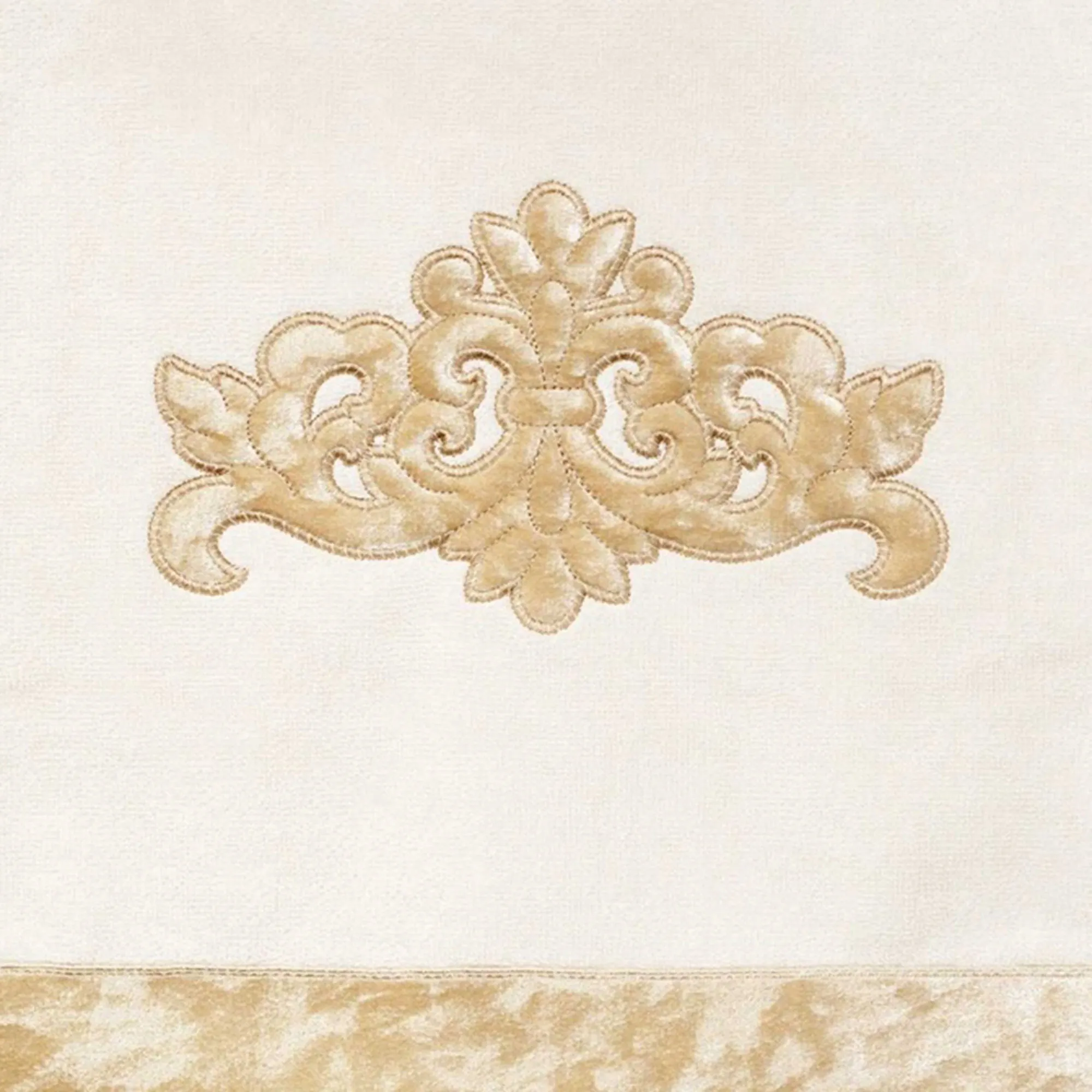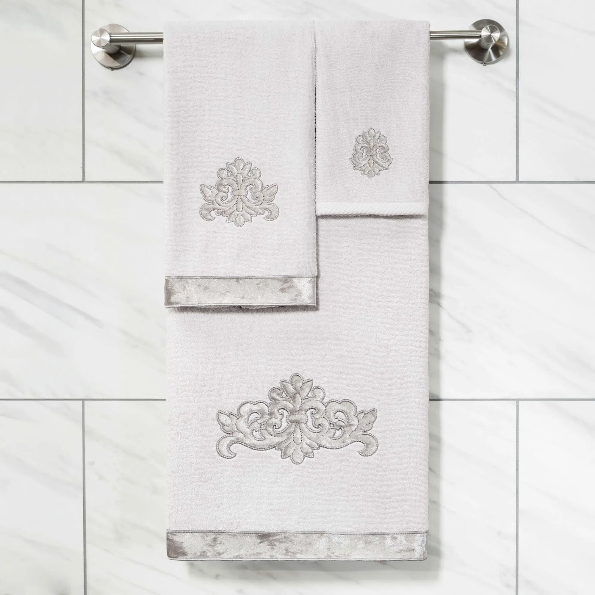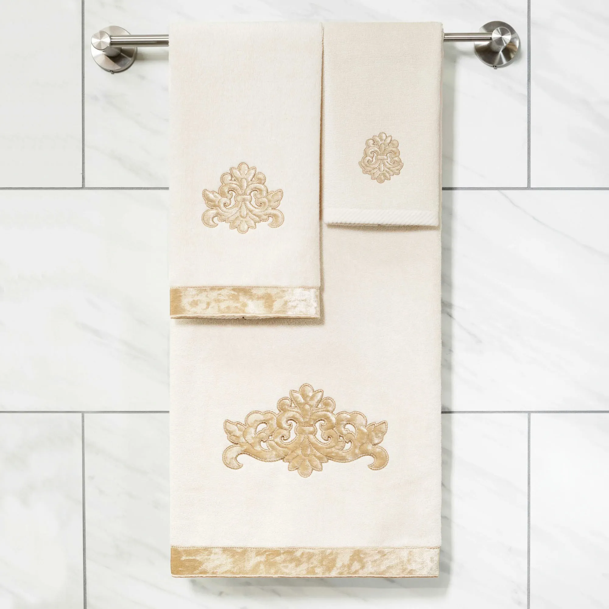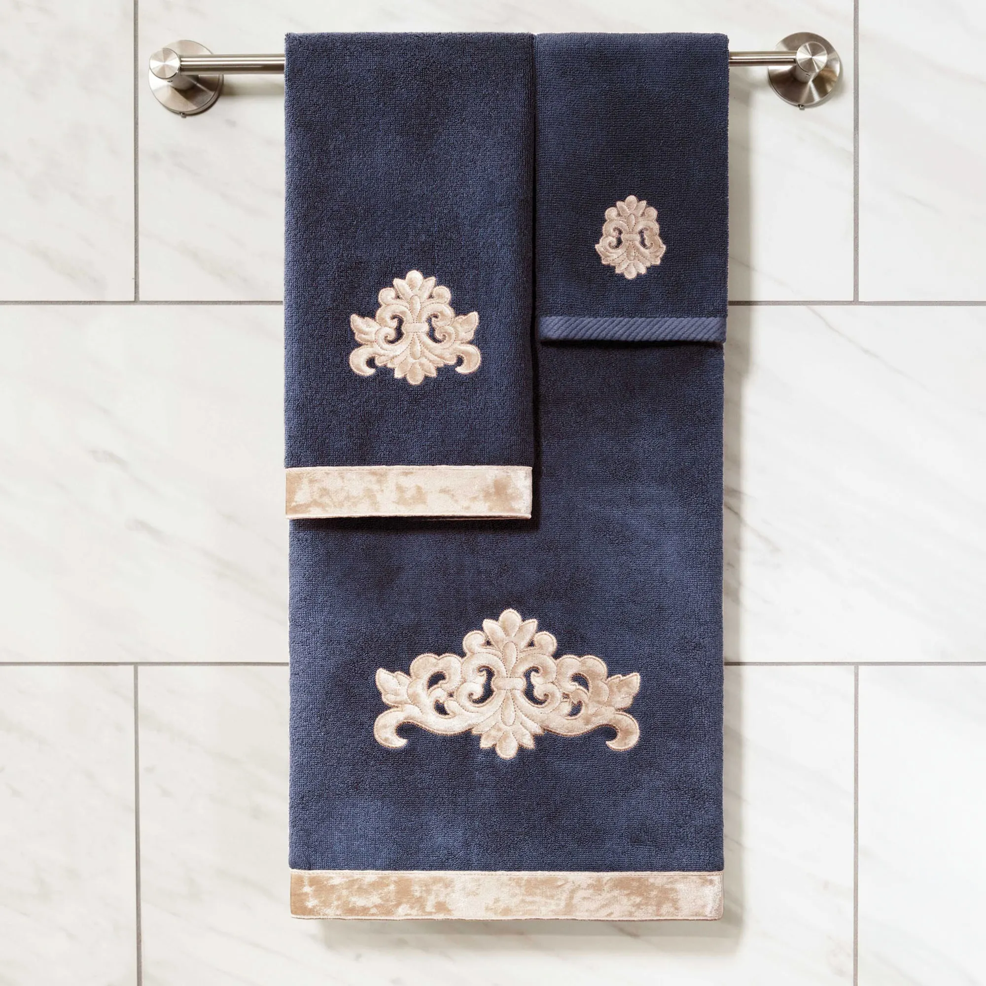 The May Bath Towel Set decorates with a luxurious flourish. These super-absorbent and quick-drying towels are made from premium Turkish cotton and have 500 GSM. Towels feature classic fleur-style, velvet crest applique designs; most have a matching, lustrous velvet bottom border. Beige has a gold applique and border; Dark Blue has a light gold applique and border; and Silver has a silver applique and border. These super-soft towels are durable and keep their plush appearance after washing. The three-piece towel set includes one bath towel, 27"x54"; one hand towel, 16"x30"; and one fingertip towel, 11"x18". Machine washable. Imported/USA.