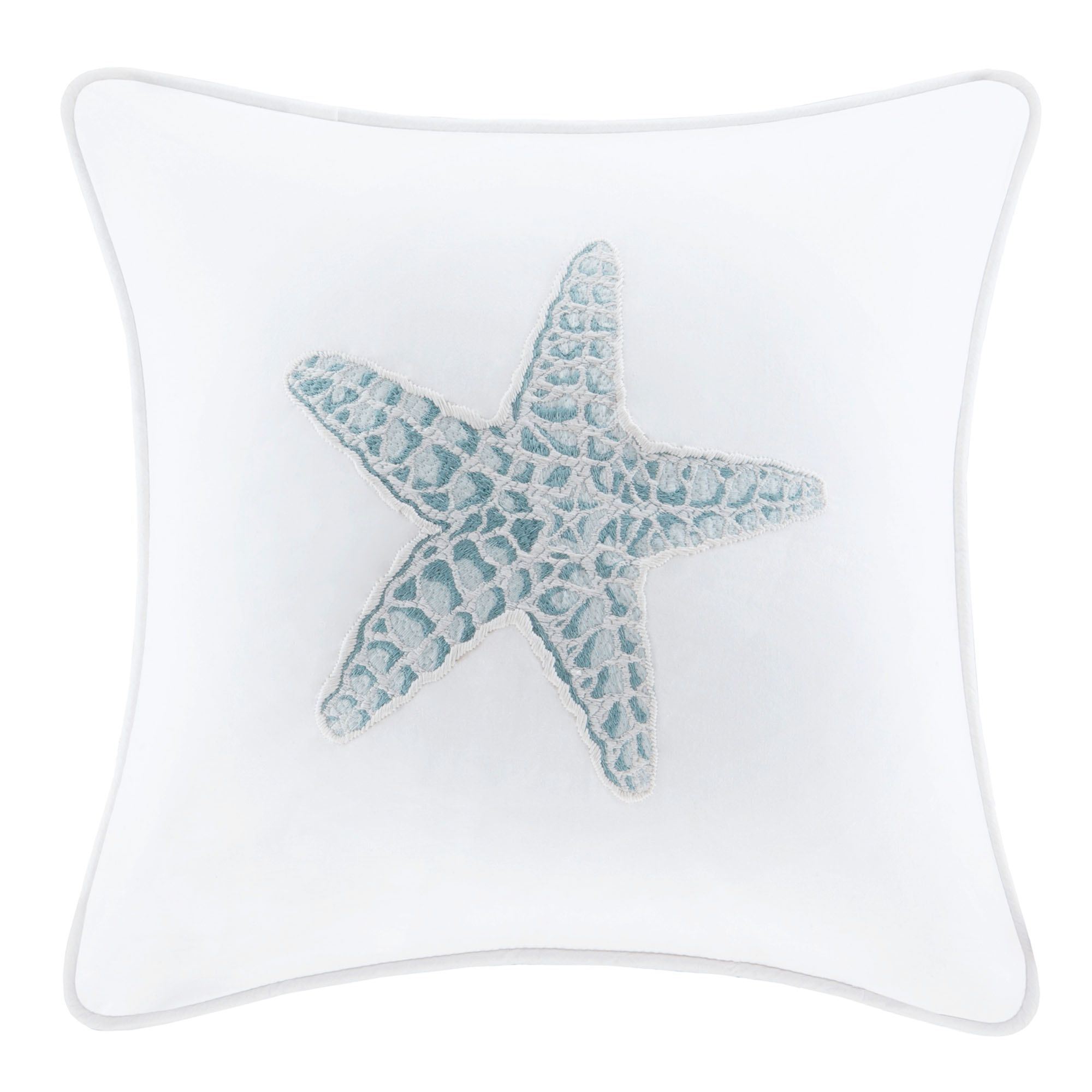 Pillows have polyester forms and zipper closures. Spot clean. Piped Square has an embroidered starfish in aqua mist and ivory set on a white ground. Tailored Rectangle features an embroidered wave design in white alternating with aqua mist waves.