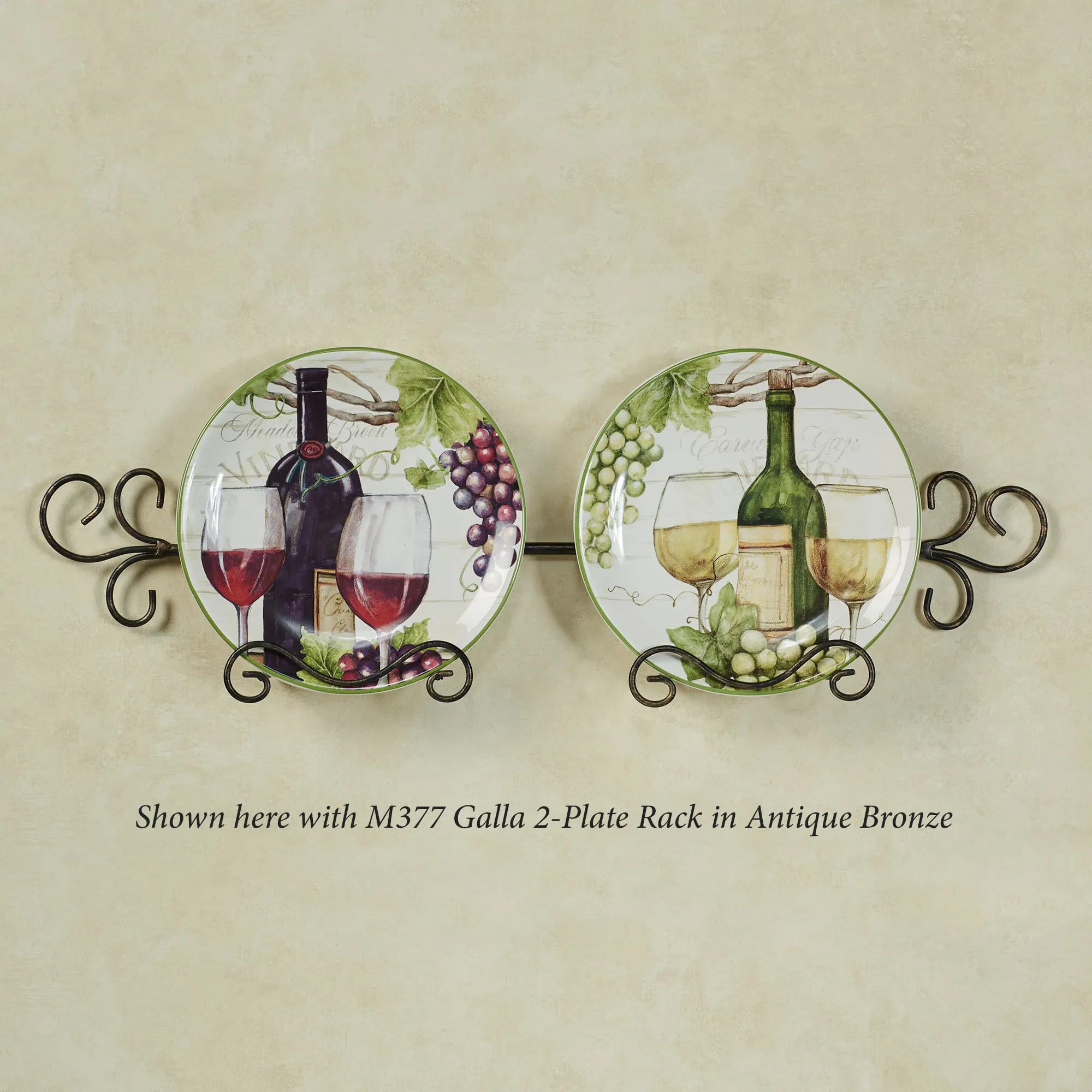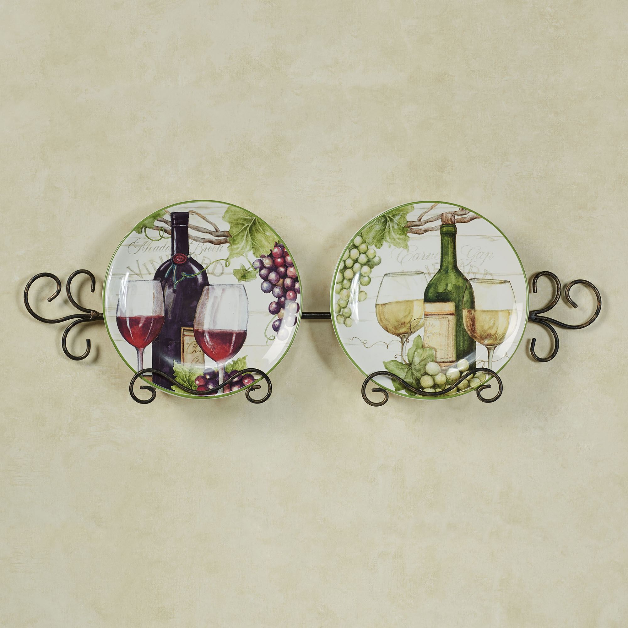 Grapes are one of the delectable ingredients used to create fine wine from the Meadow Brook Vineyard. The handpainted ceramic Dessert Plate Set, by (C)Susan Winget, has decal accents, script writing, wine bottles, and wine glasses on an aged white background with a gloss finish. Colors include shades of brown, ivory, green, wine, and merlot. Each dessert plate is 9"dia.x1"H. Food safe. Microwave safe. Dishwasher safe. Plate rack is not included.