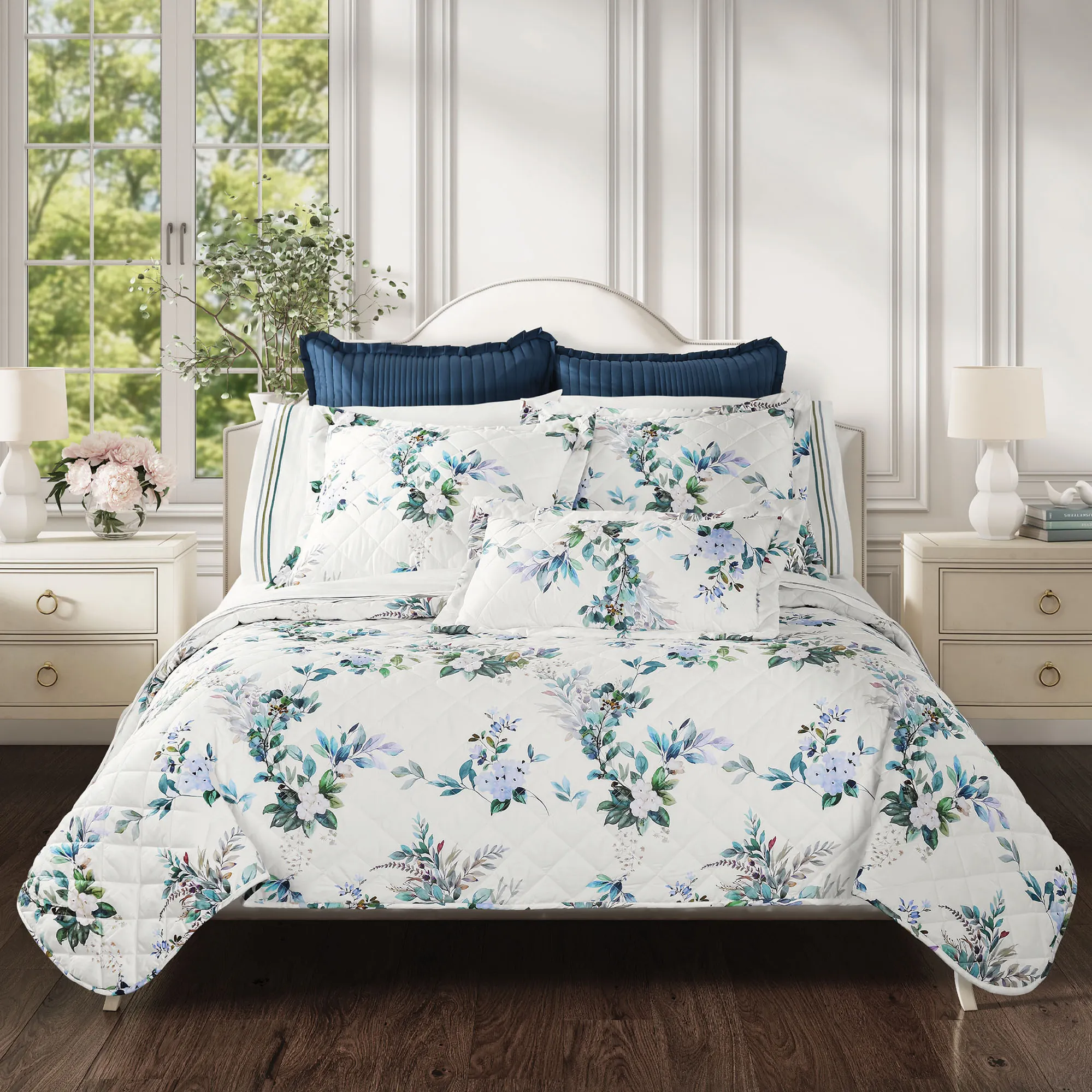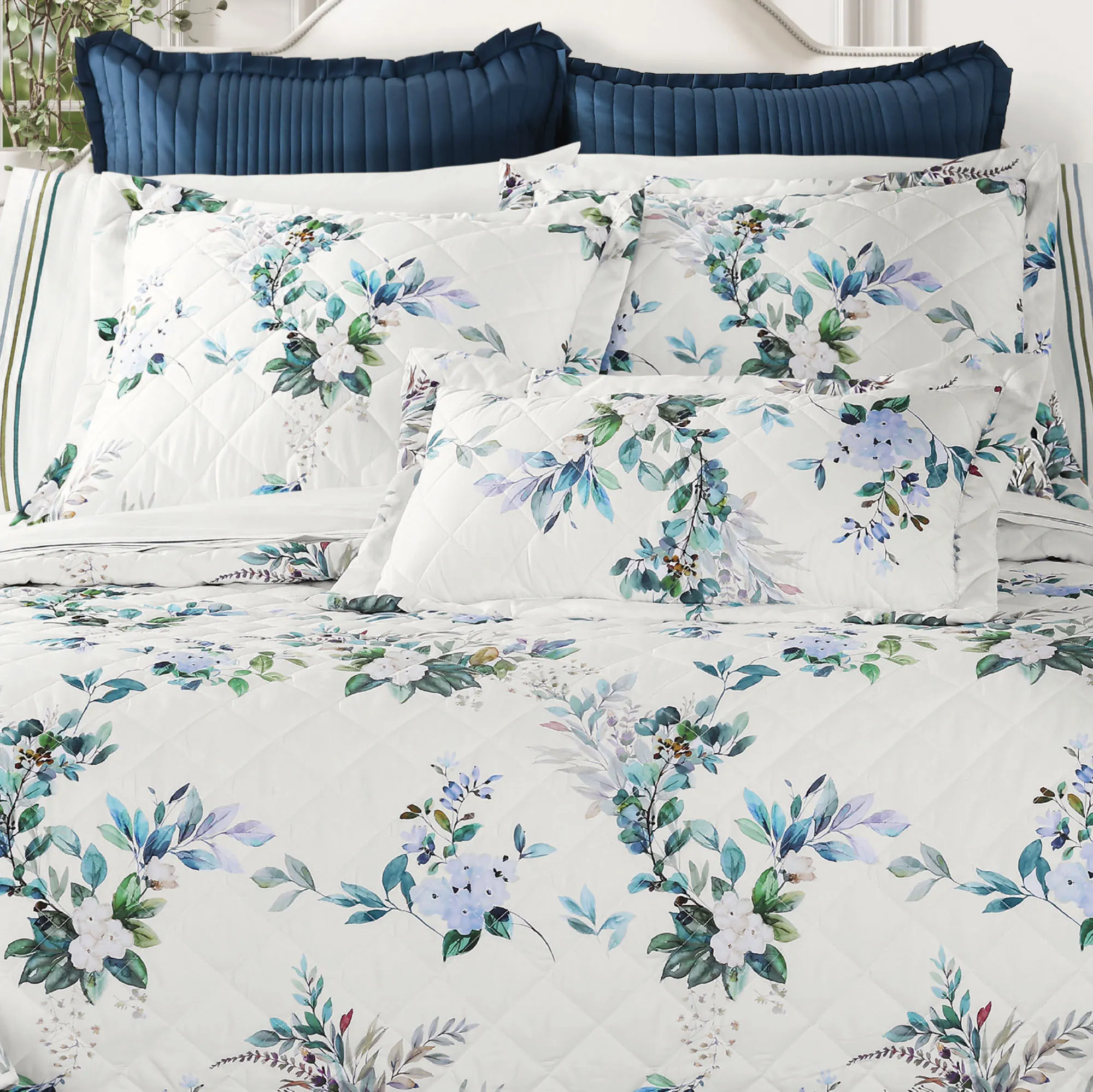 A Meadow Floral arrangement combines delicate flower blossoms with flourishing greenery to create a beautiful display. From J. Queen Cottage, the lovely cotton sateen ensemble features a variety of enchanting flora in shades of teal, green, blue, white, gold, and lavender across a crisp white ground. Coordinating embroidered teal, green, and blue stripes add a chic, defining finish to the solid white complementary elements. Offering comfort and durability, the bedding designs are ideal for year-round use.