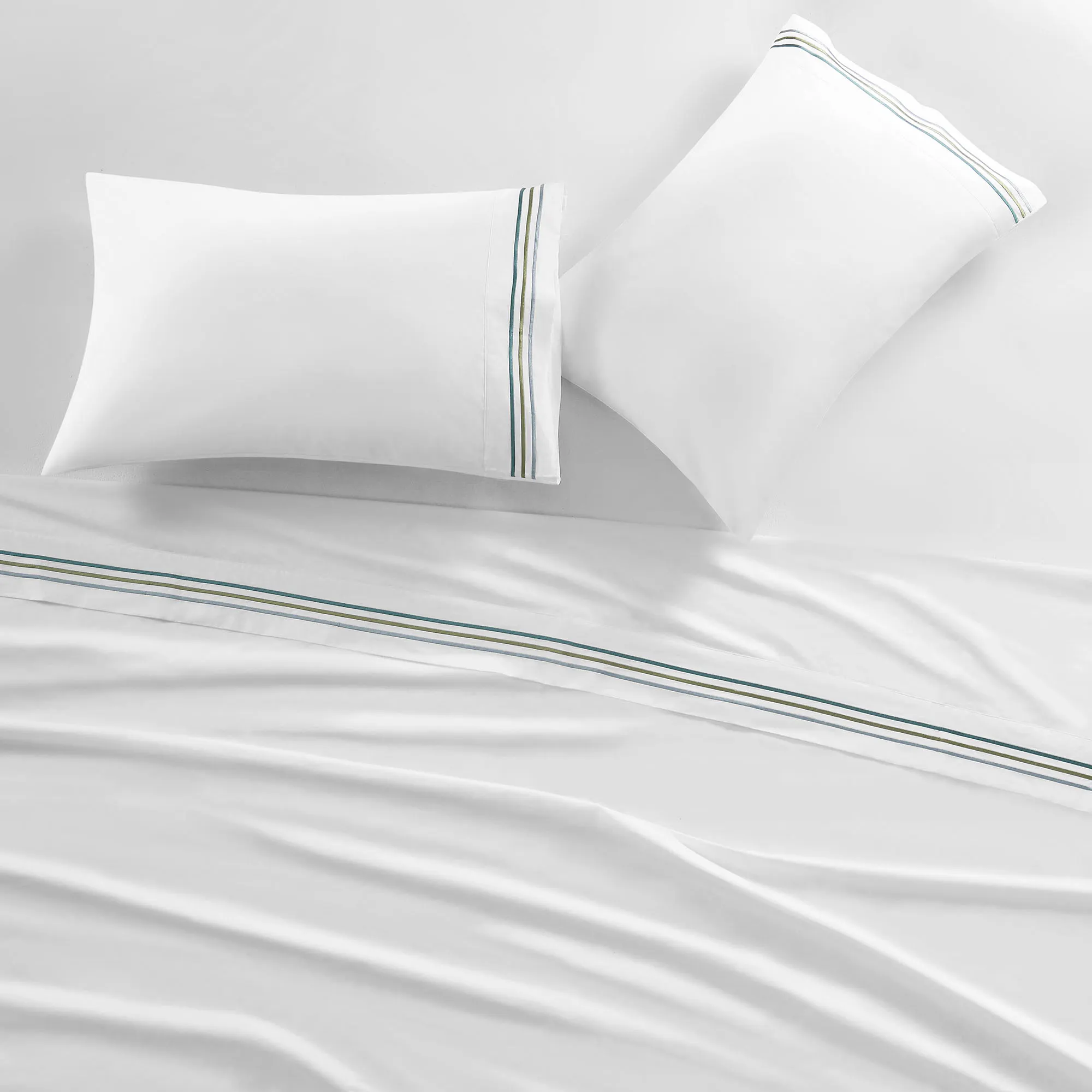 The white 300 T.C. Sheet Set includes one flat sheet, one fitted sheet, and two pillowcases. Flat sheet and pillowcases have embroidered stripes on the hem. Fitted sheet has 16" deep pockets to fit a mattress up to 18" deep. For sheet set, choose Full, Queen, King, or Cal King.