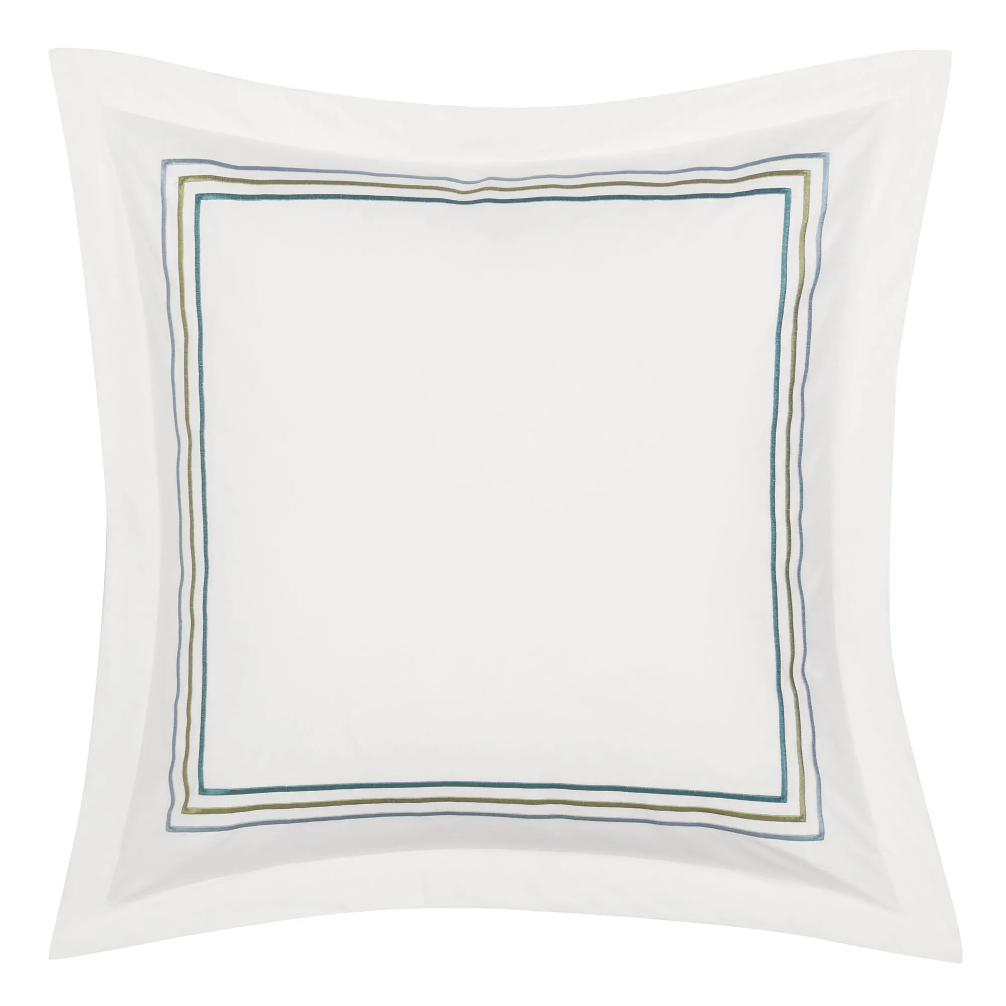 European Sham is white with an embroidered stripe frame and flanged edges; zipper closure.