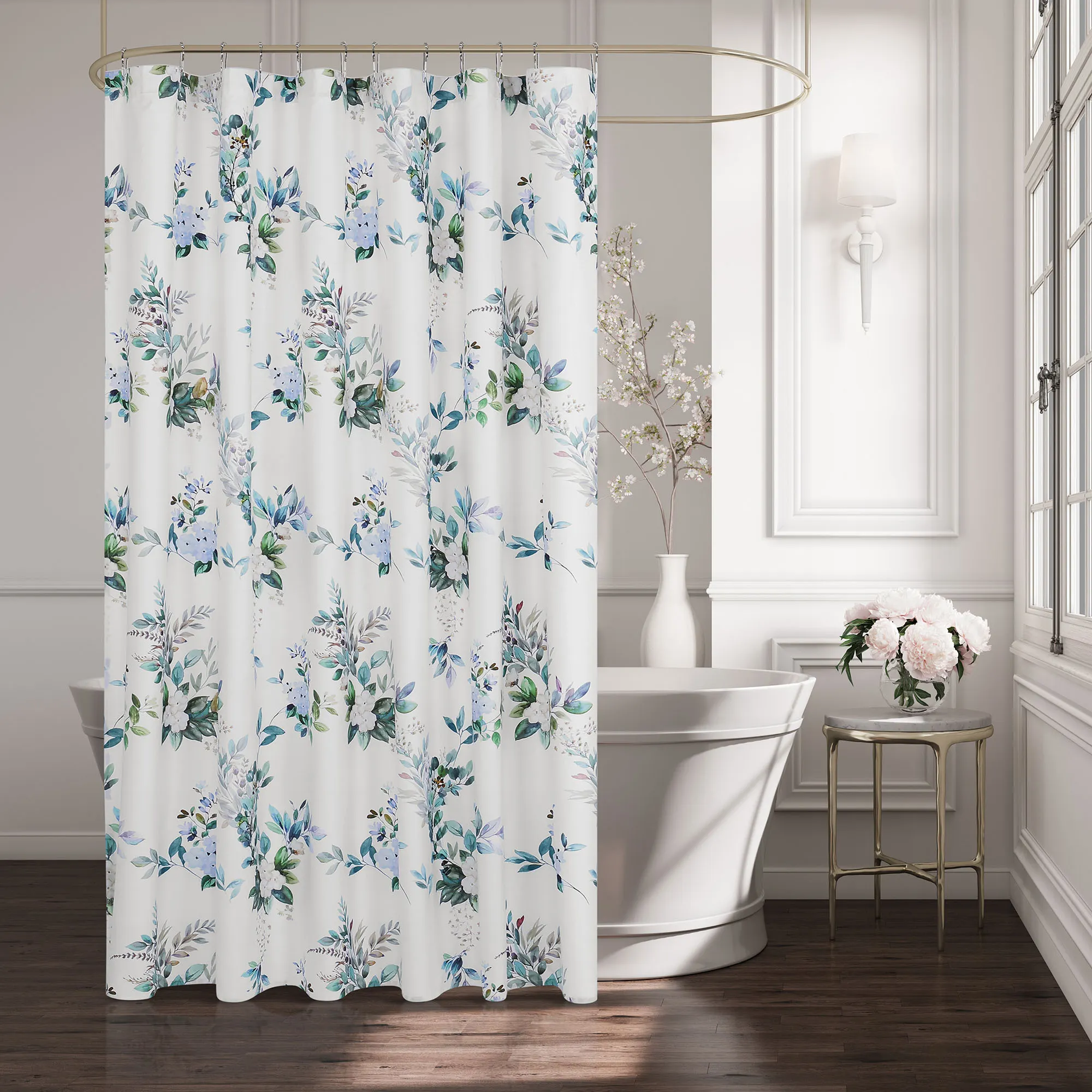 The charming Meadow Floral Shower Curtain displays sweet flower blossoms and greenery. This cotton sateen shower curtain, from J. Queen Cottage, includes shades of teal, blue, green, and ivory with hints of gold and lavender on a white background. We recommend the use of a waterproof shower curtain liner. Measures 72"x72". Machine washable. Imported.