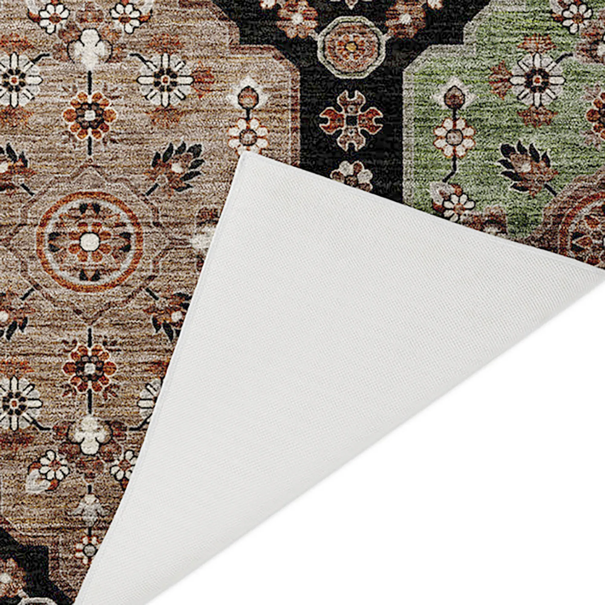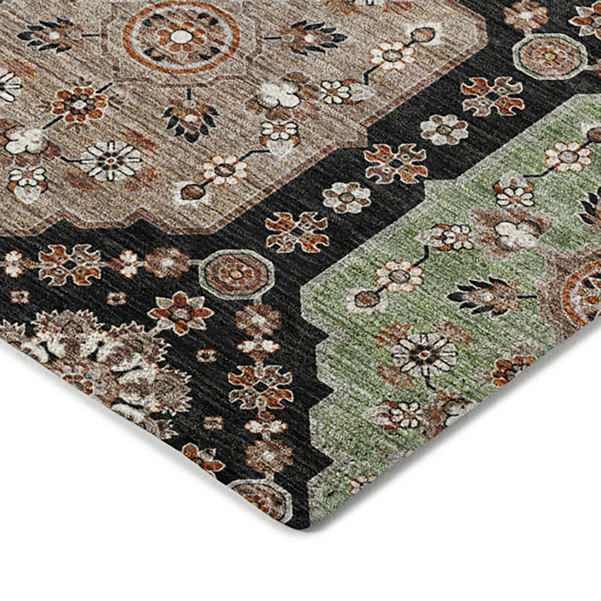 A Medallion Muse, flowers, and ornate motifs invite intrigue into any setting. This power-loomed and printed polyester area rug, .19" thick, has a plush pile and has a rubber backing. The black coloration has shades of black, ivory, paprika, sage, gold, and gray. This medallion rug may be used indoors or outdoors under a covered area. Machine wash or hose off to clean. Imported/USA.