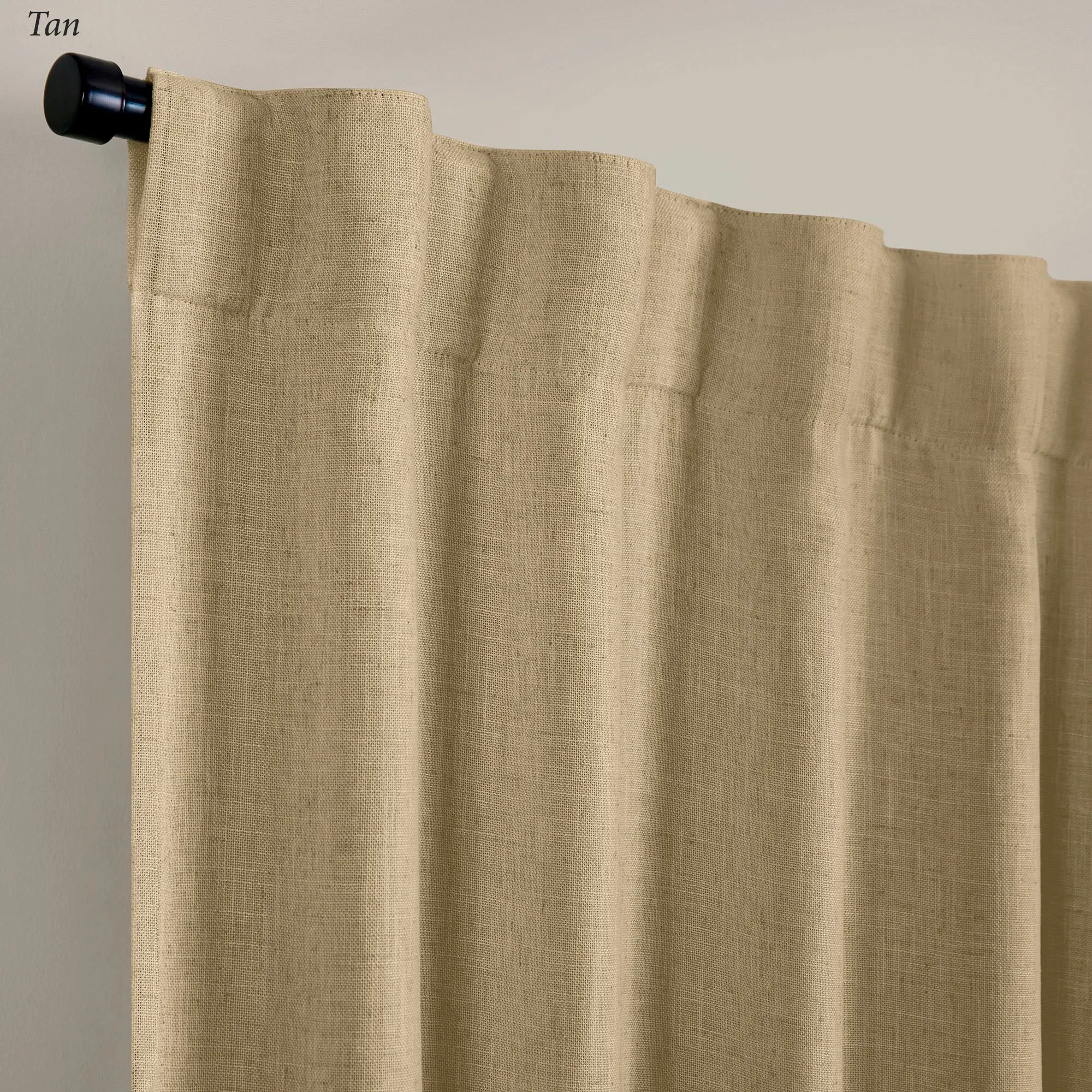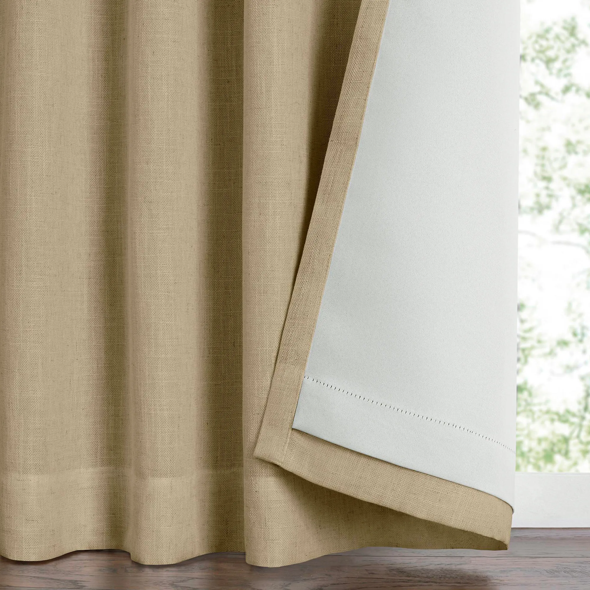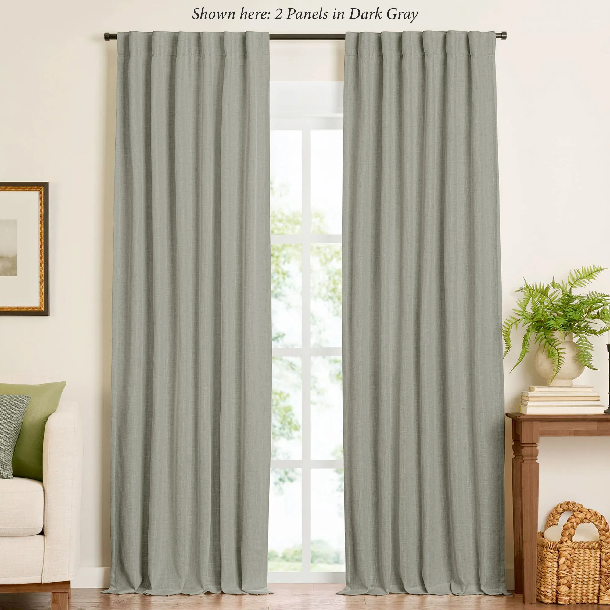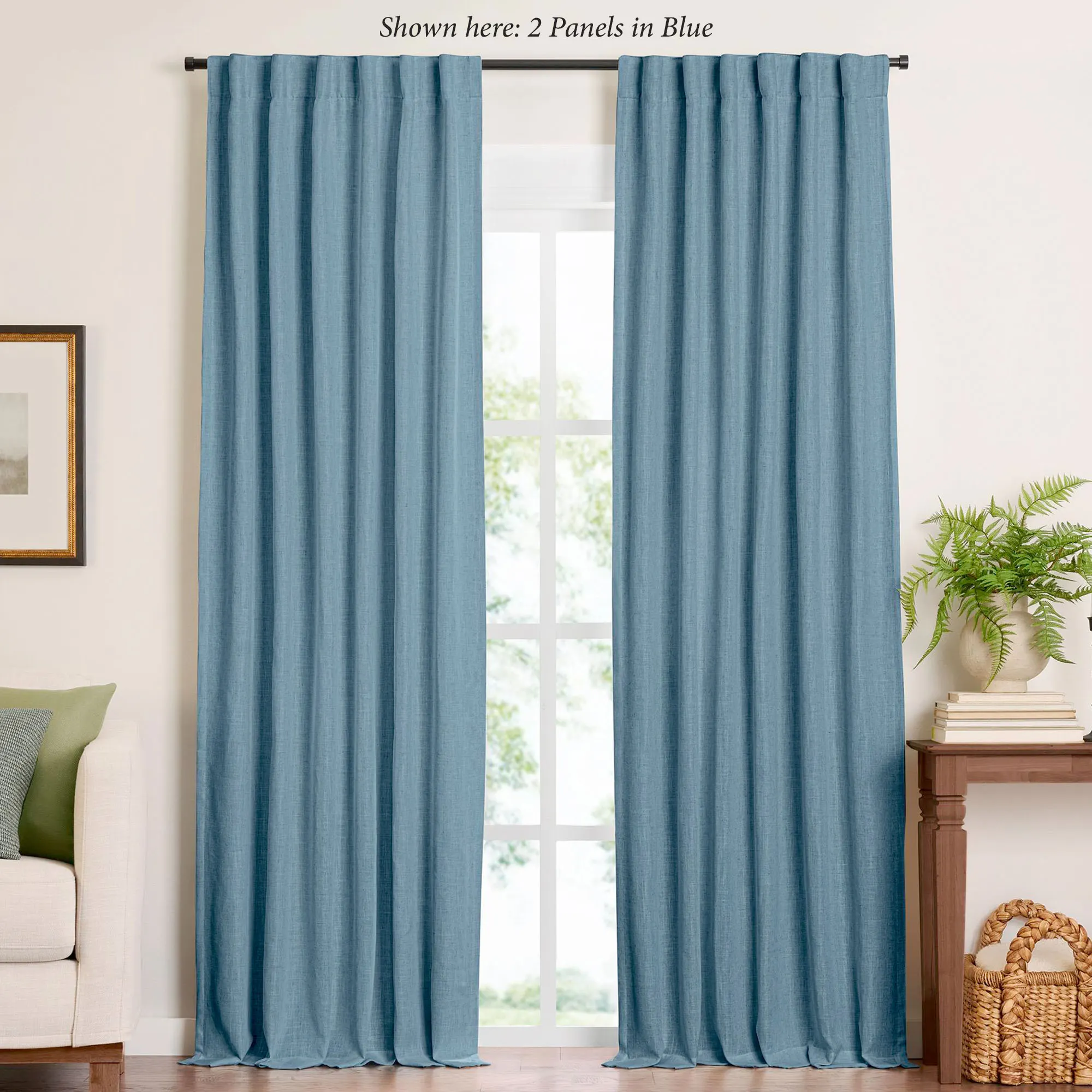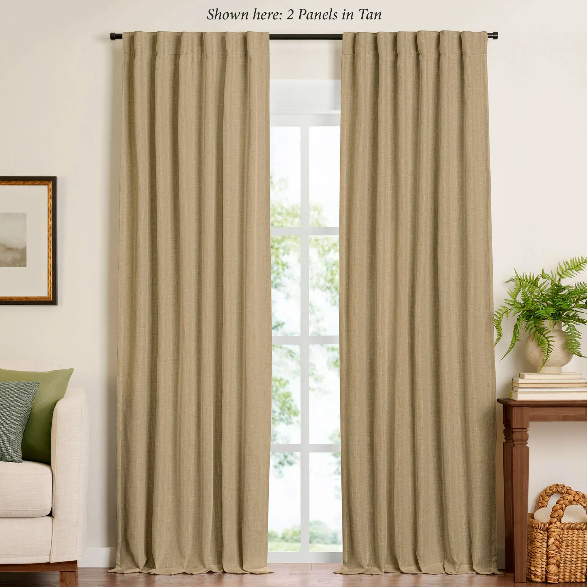 The Medlin Curtain Panel has a soft and luxurious drape that looks so sleek. The solid color, room darkening, polyester/linen panel has a backing made from layers of black yarns woven between layers of colored yarns, which helps to reduce noise and save energy. Hang the panel with the 4" rod pocket or the 4"L back tabs. Sold individually, each panel is 52"W. Machine washable. Imported.
