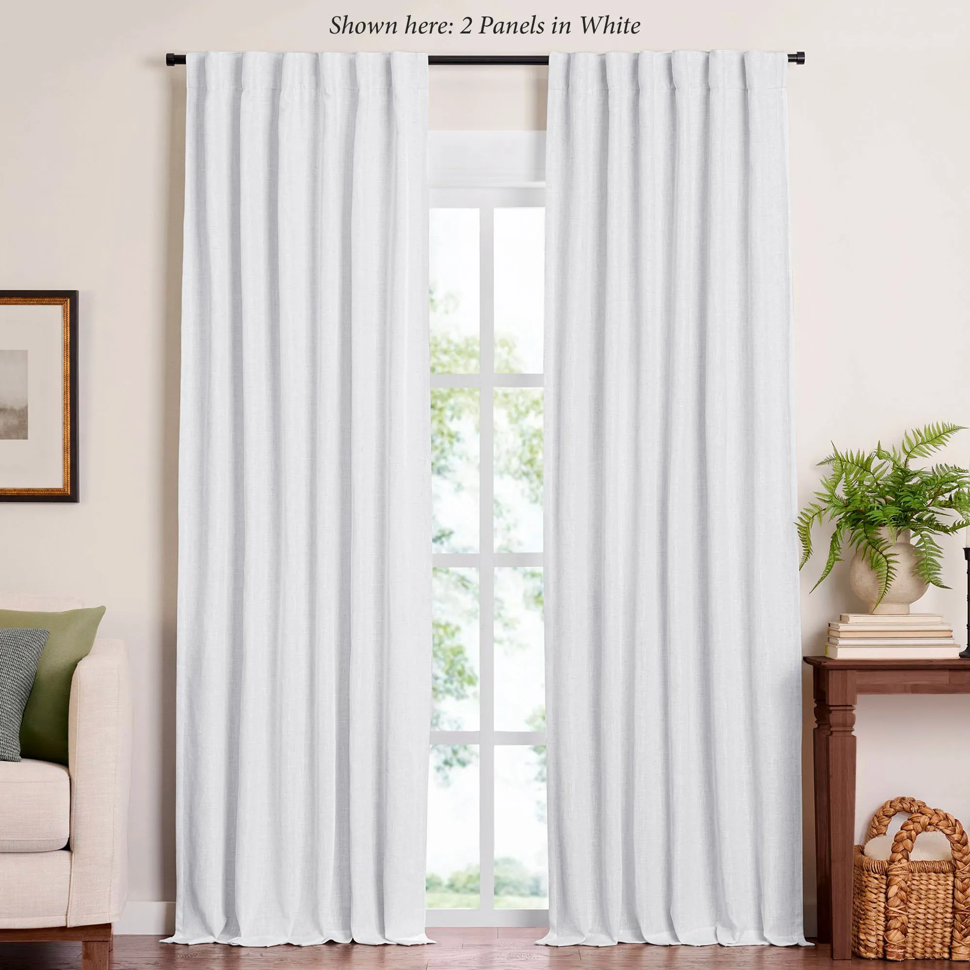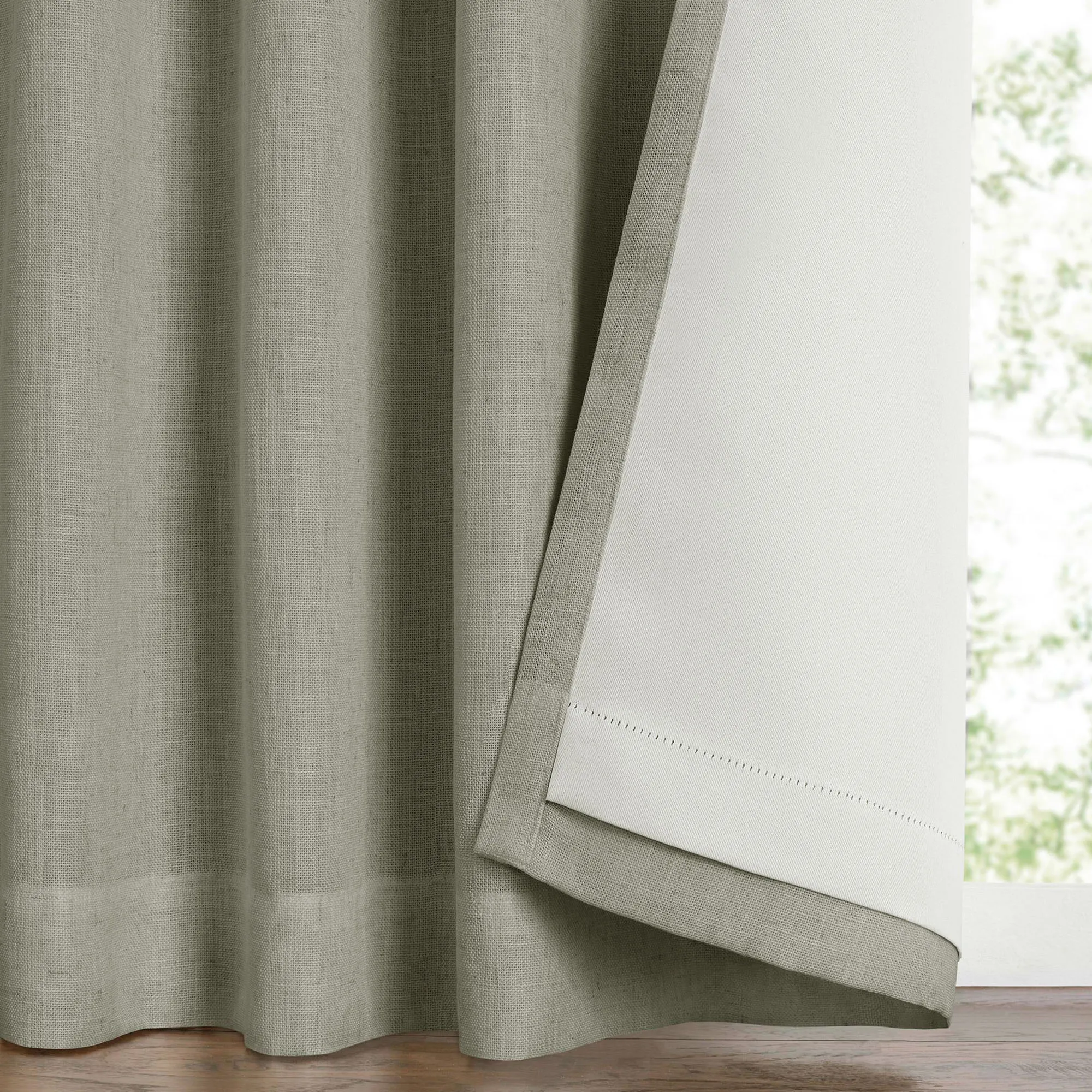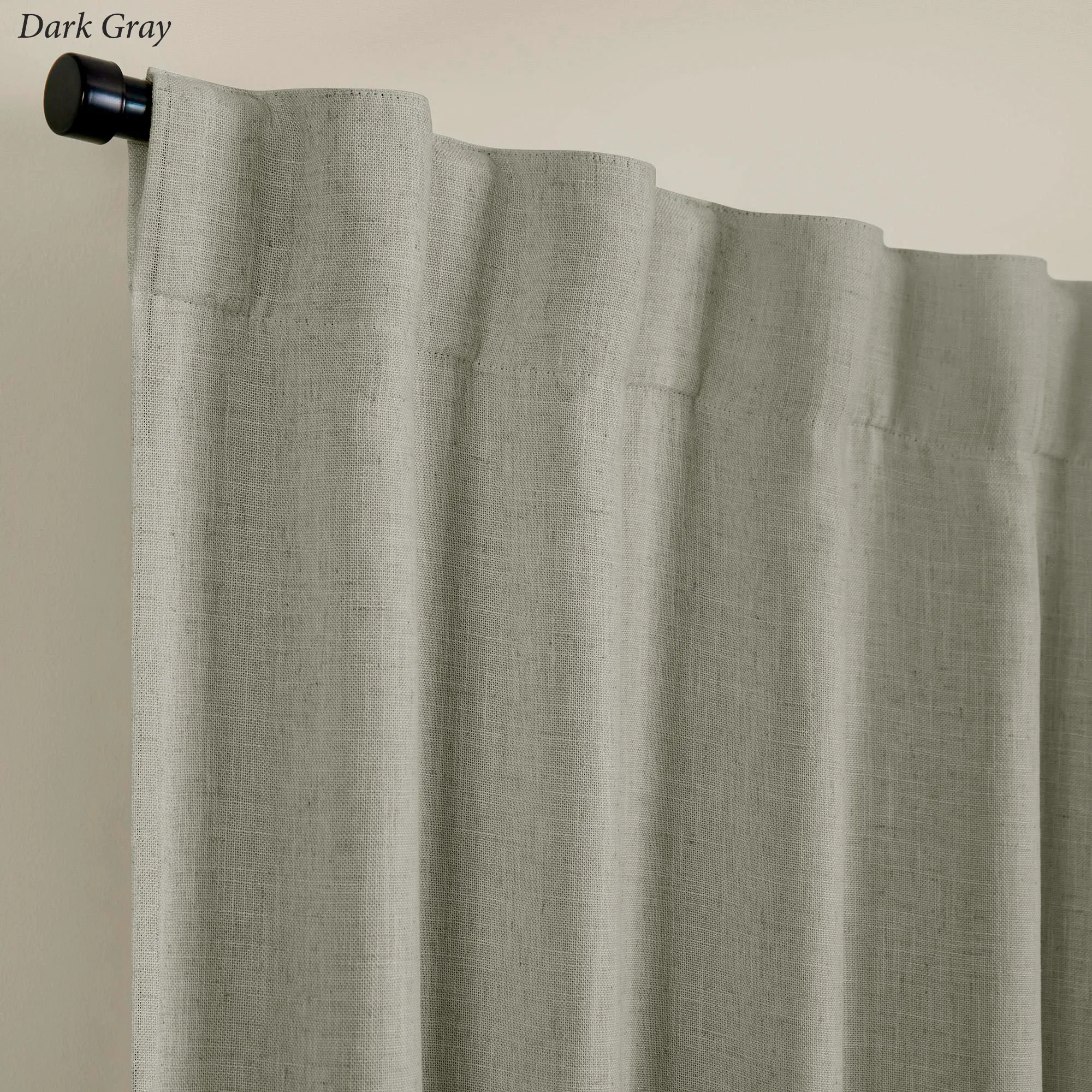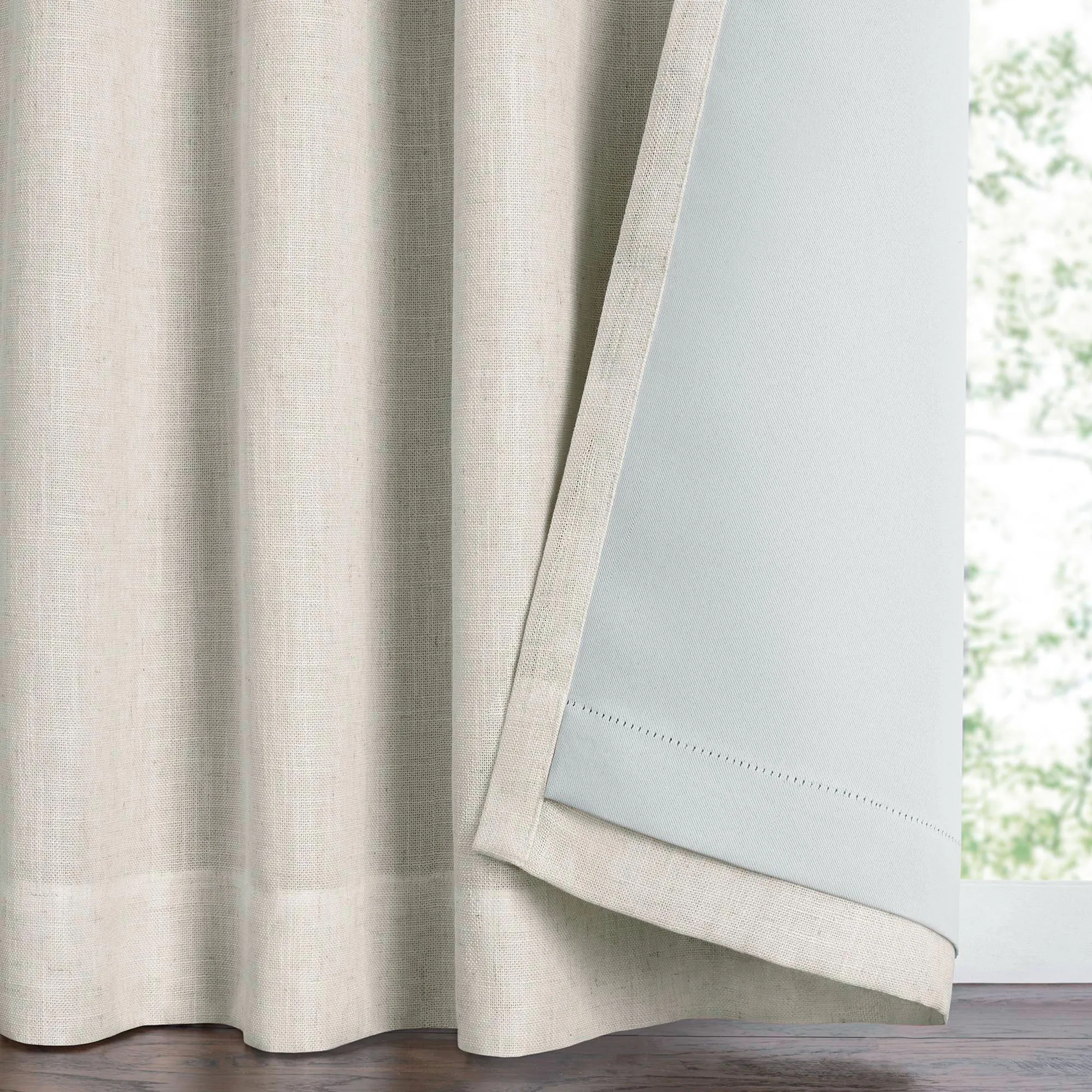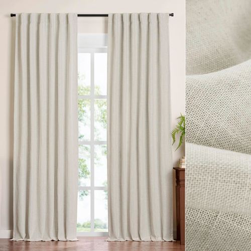 The Medlin Curtain Panel has a soft and luxurious drape that looks so sleek. The solid color, room darkening, polyester/linen panel has a backing made from layers of black yarns woven between layers of colored yarns, which helps to reduce noise and save energy. Hang the panel with the 4" rod pocket or the 4"L back tabs. Sold individually, each panel is 52"W. Machine washable. Imported.