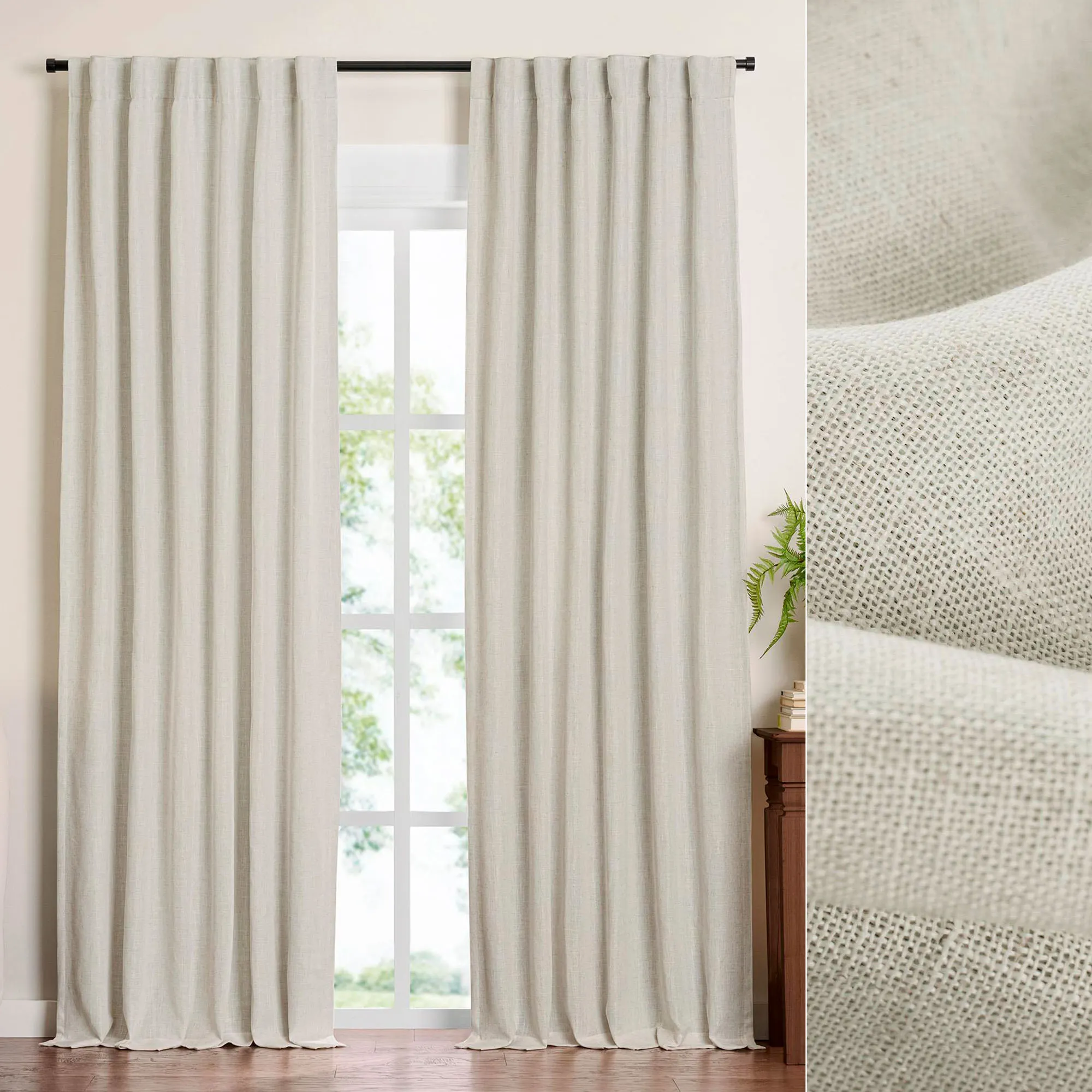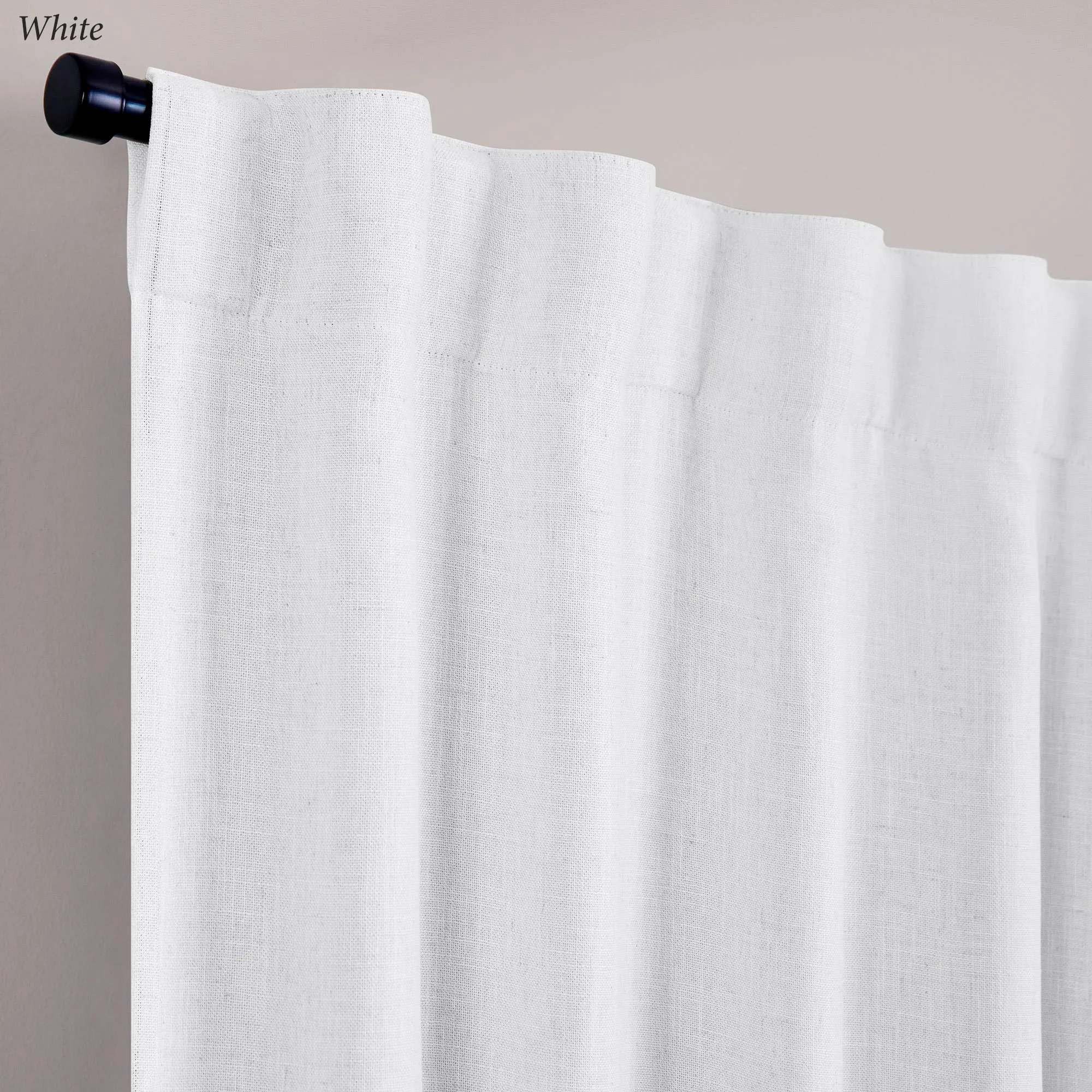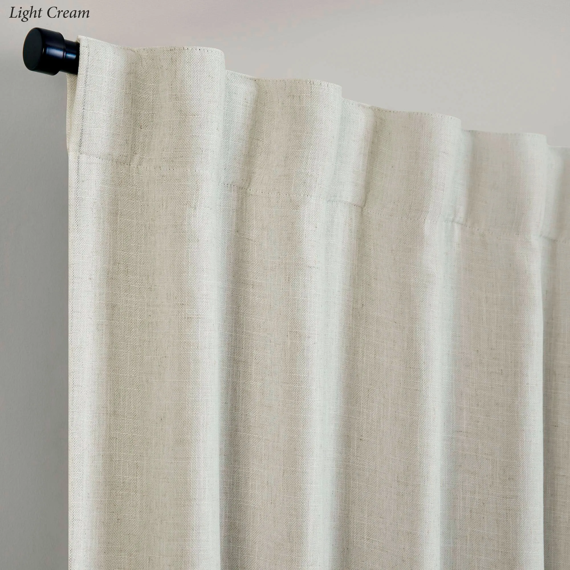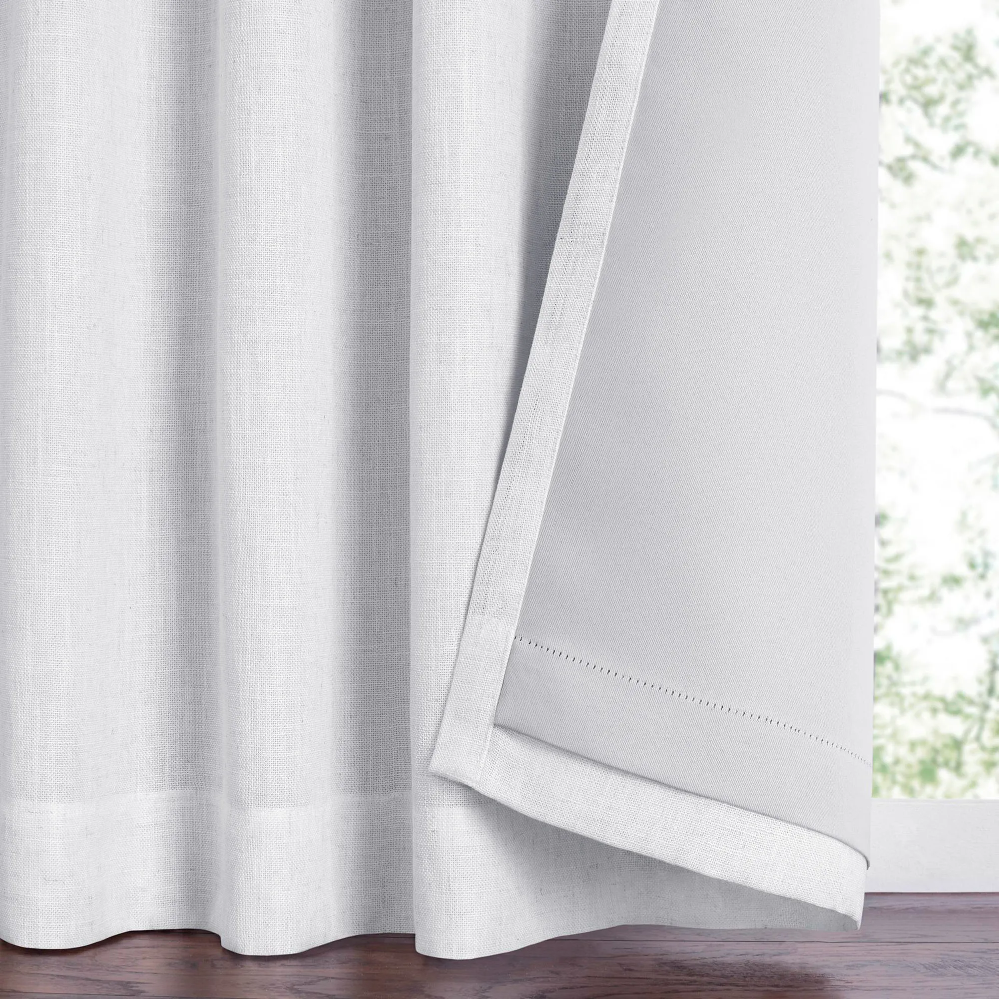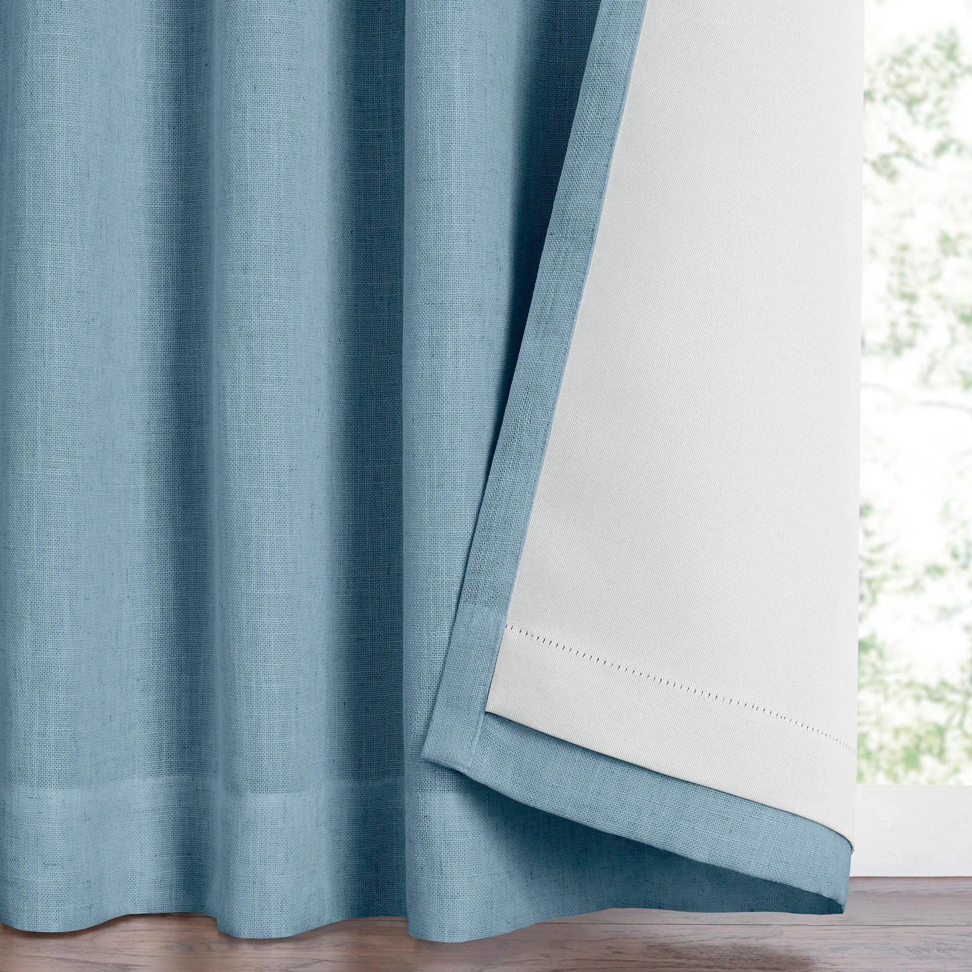 The Medlin Curtain Panel has a soft and luxurious drape that looks so sleek. The solid color, room darkening, polyester/linen panel has a backing made from layers of black yarns woven between layers of colored yarns, which helps to reduce noise and save energy. Hang the panel with the 4" rod pocket or the 4"L back tabs. Sold individually, each panel is 52"W. Machine washable. Imported.