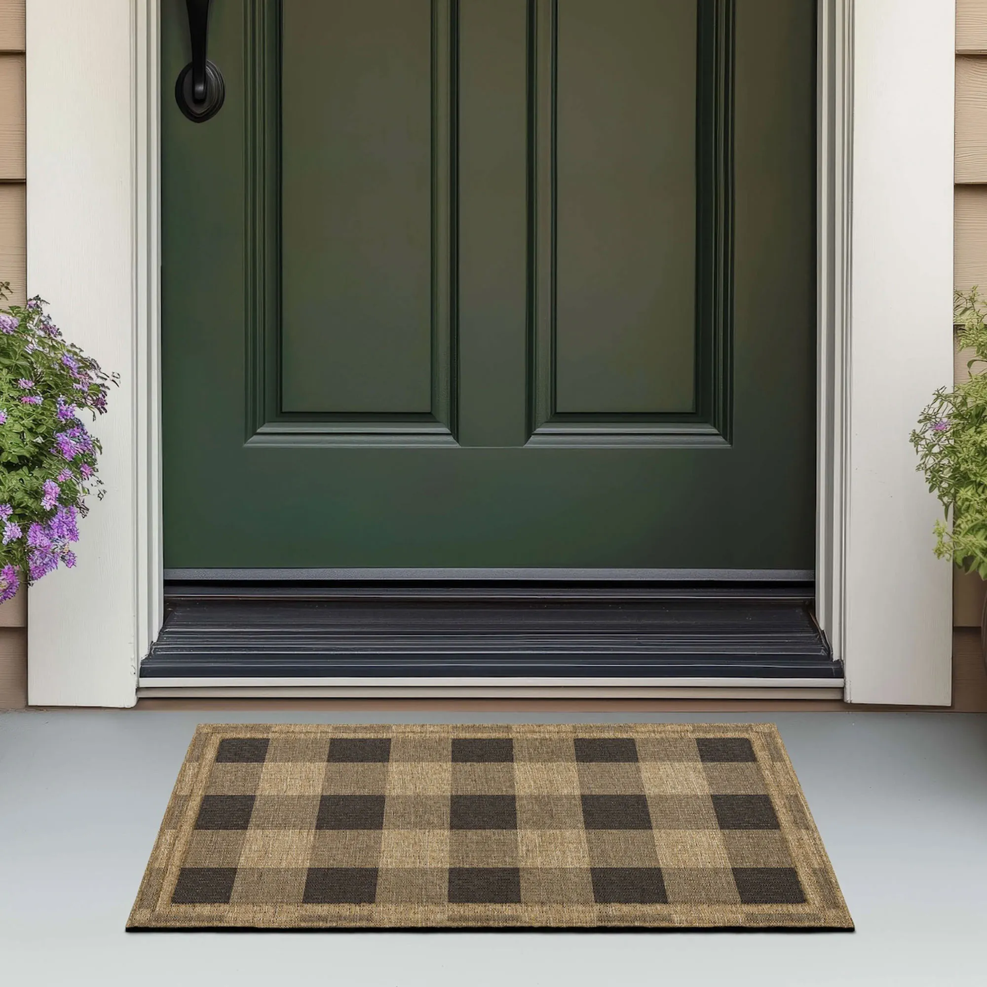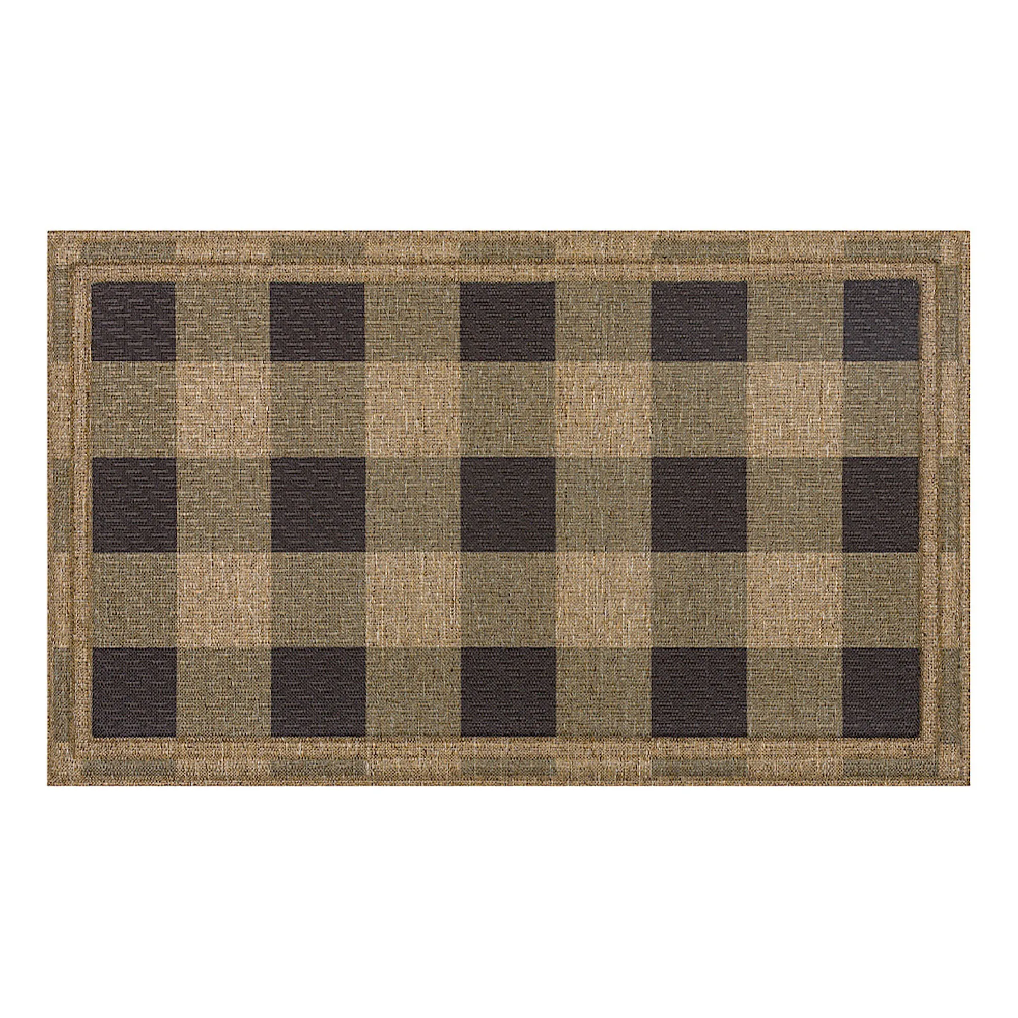 The Mega Checkered Doormat charms your guests just as they come through your front door. Designed to withstand everyday wear indoors or outdoors year round, the .32" thick, durable doormat features a heat-transfer printed polyester face patterned with neutral brown, light taupe, and natural buffalo plaid. The slip-resistant recycled rubber backing provides extra grip to minimize slipping and sliding in a high-traffic entryway and all weather conditions. Doormat measures 30"x18" overall. Shake, sweep, or rinse with a garden hose.