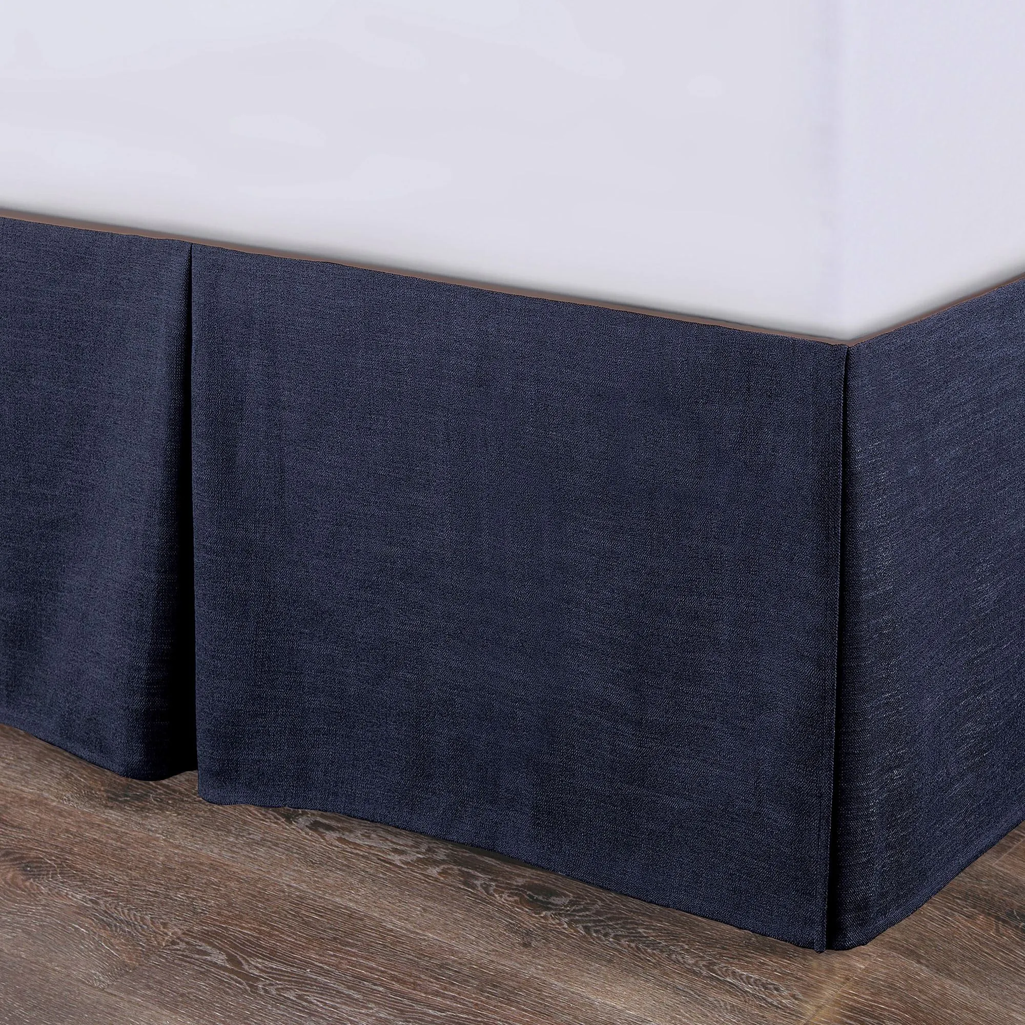 The 18" drop Bedskirt is woven navy with kick pleats and split corners. Choose Queen or King.