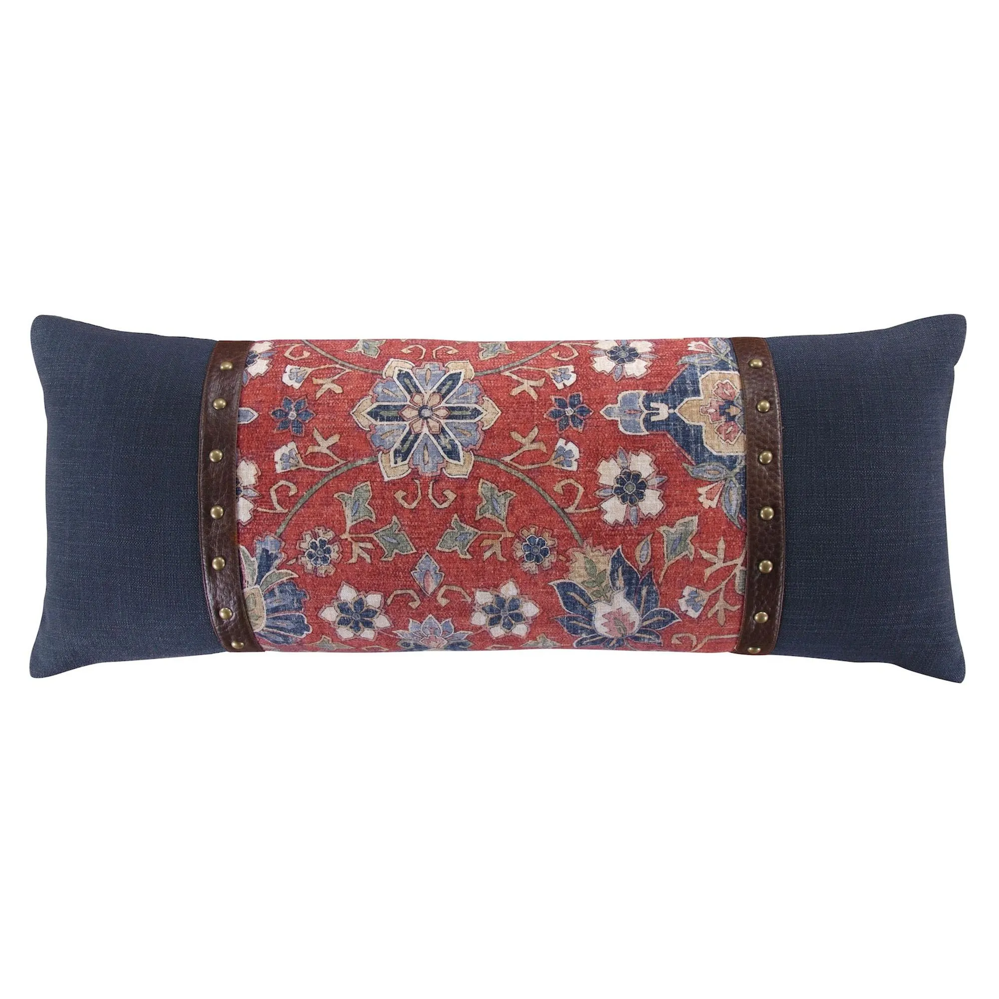 Pieced Jumbo Rectangle Pillow has a medallion and floral center, woven navy sides, faux leather bands with antique gold metal studs, tailored edges, and waterfowl feather fill. Spot clean.