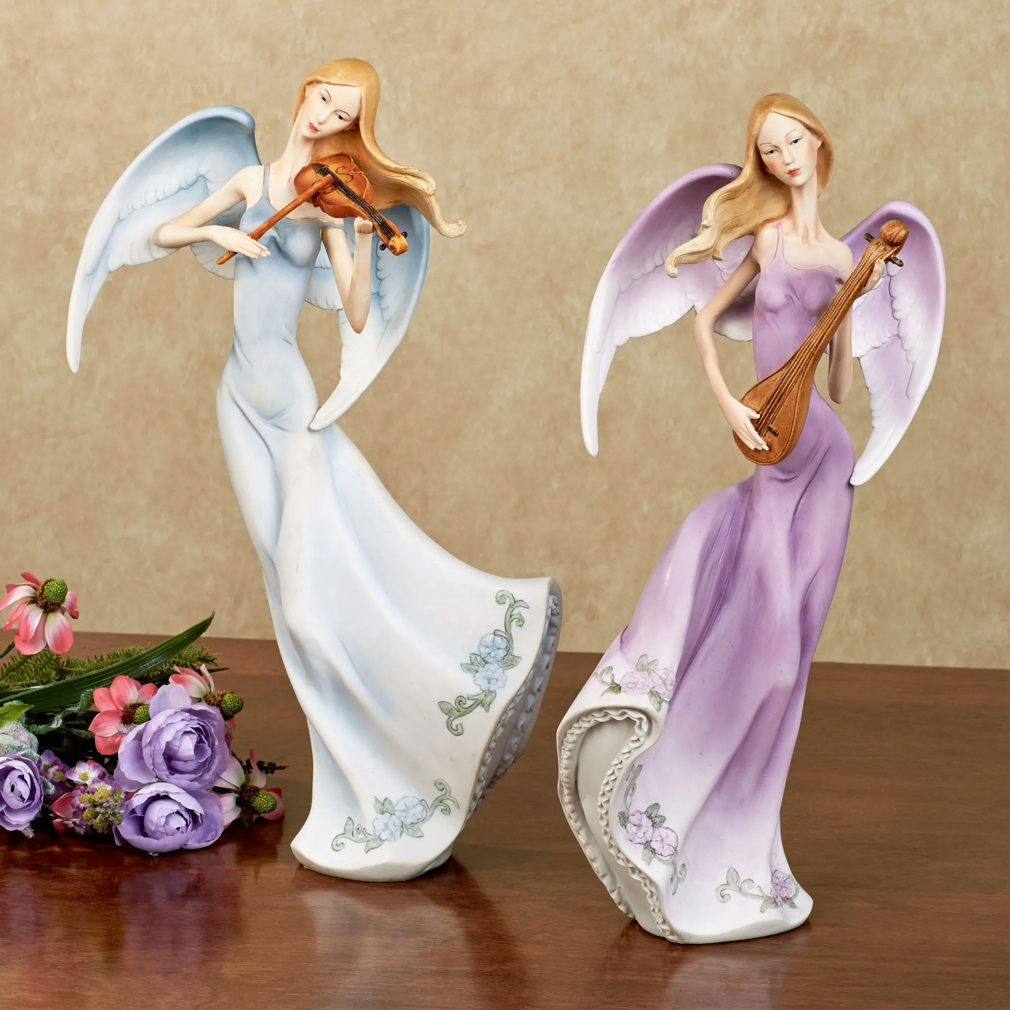 Combining sweet harmony, the resin angels in this figurine set appear to serenade you with their Melodious tunes. One angel wears a blue dress, and the other wears a purple dress, both with flower accents. Each angel figurine is 6.5"Wx5.5"Dx15"H.