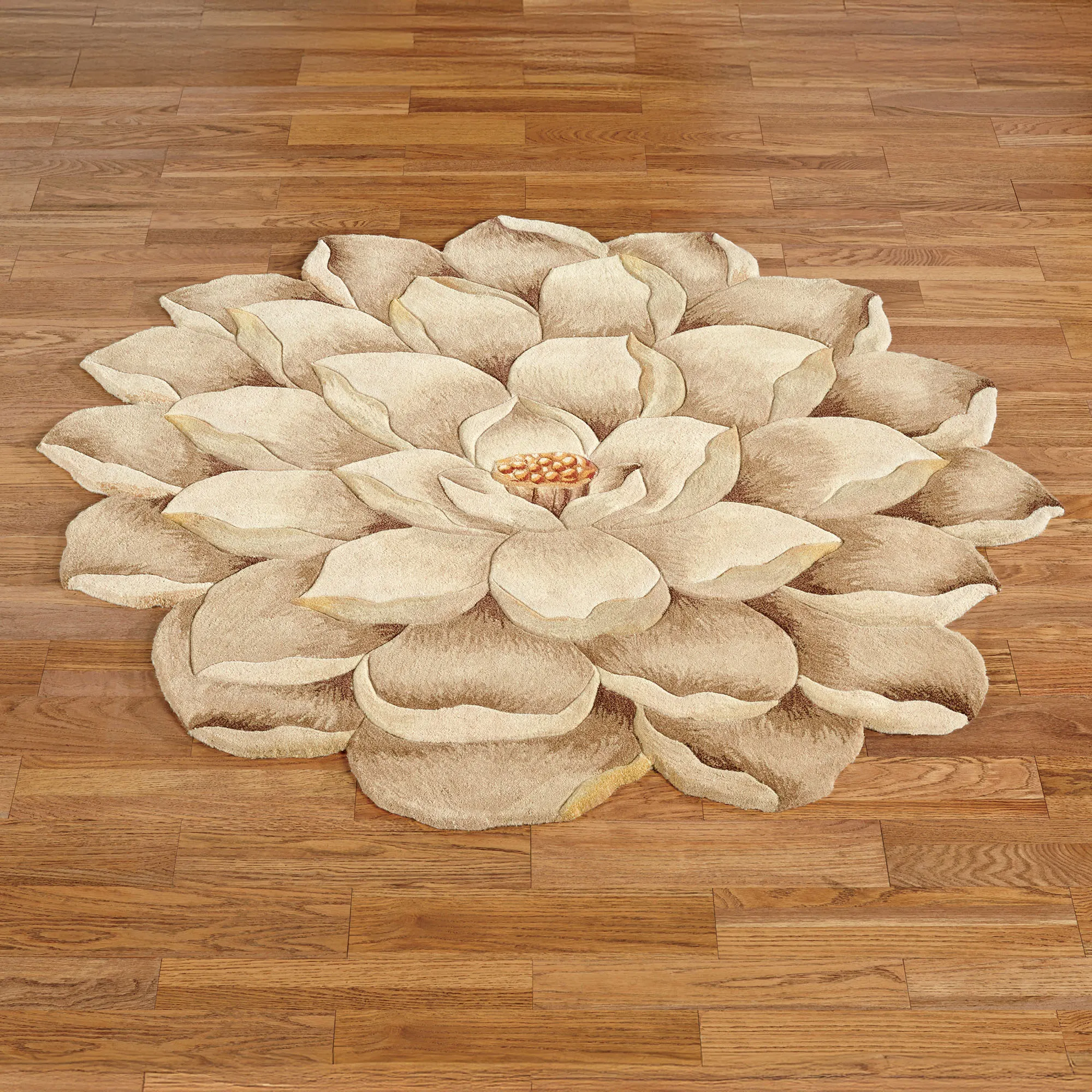 The Melody Flower-Shaped Rug captures the timeless beauty of a magnolia in full bloom. Hand-tufted and handcarved, the .625" thick polyester rug features a realistic free-form, shaped floral design in hues of moonlight, whisper white, double cream, powder puff, silver mink, stone, and beige. Round rugs resemble one bloom. Runner has two flowers side by side. Backing is cloth-covered latex. We recommend professional cleaning by a rug cleaner. Imported.