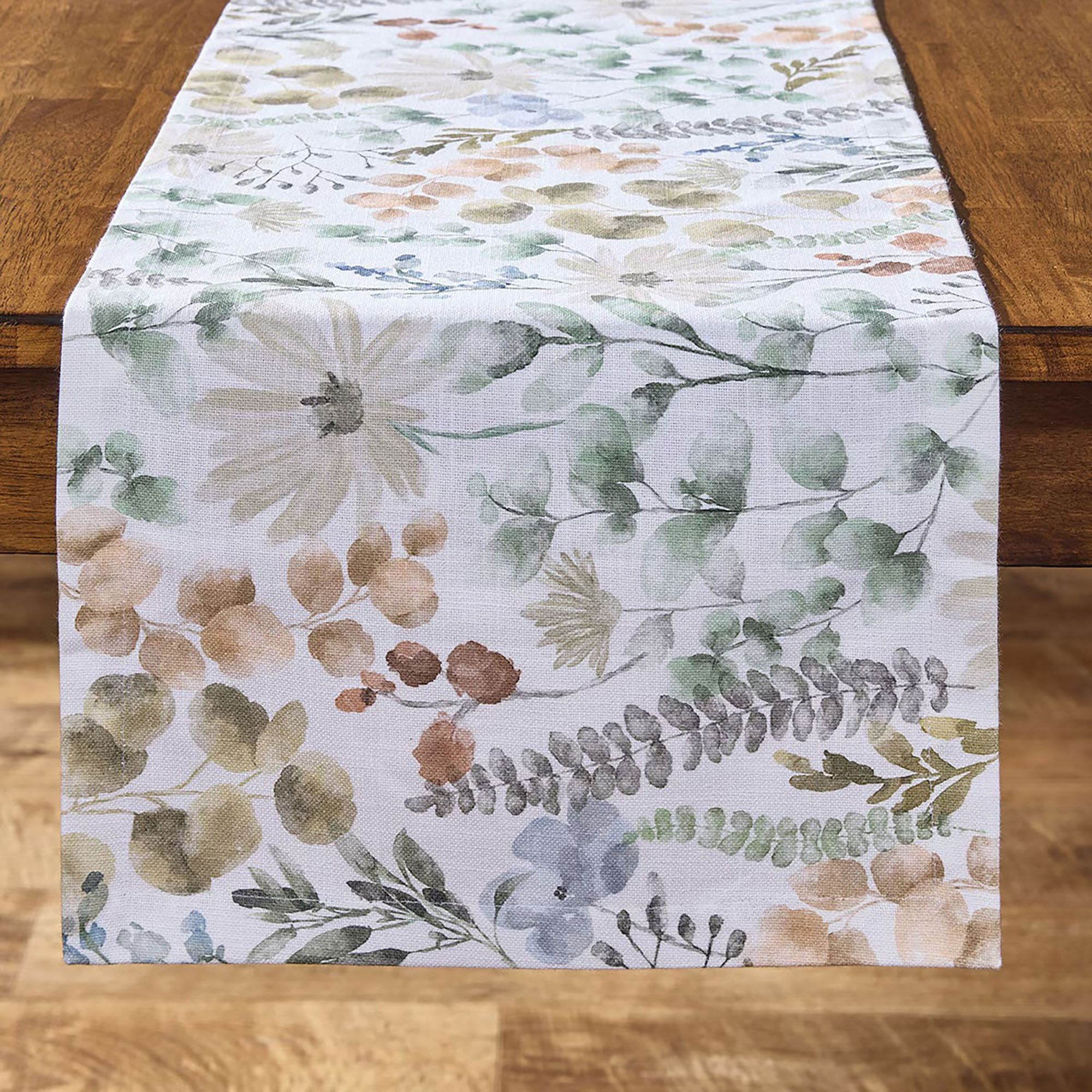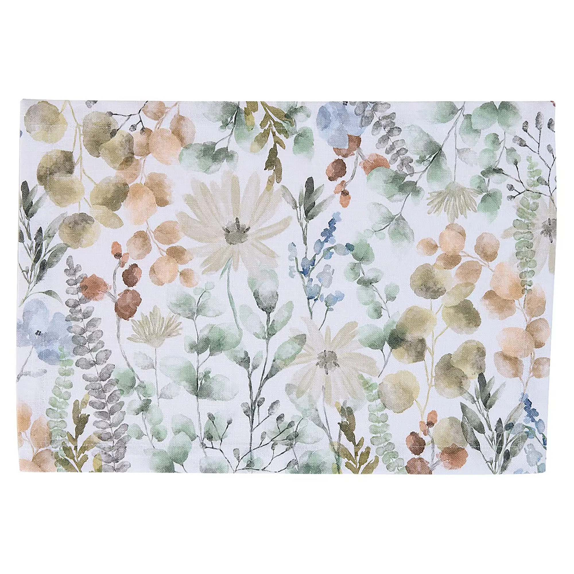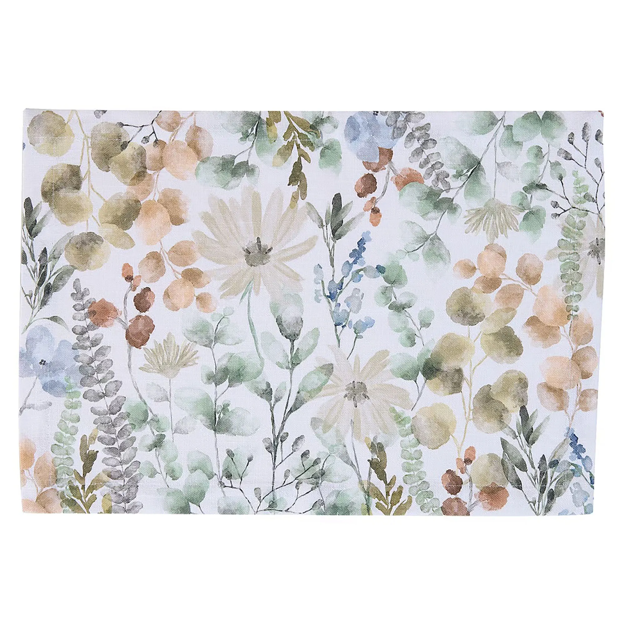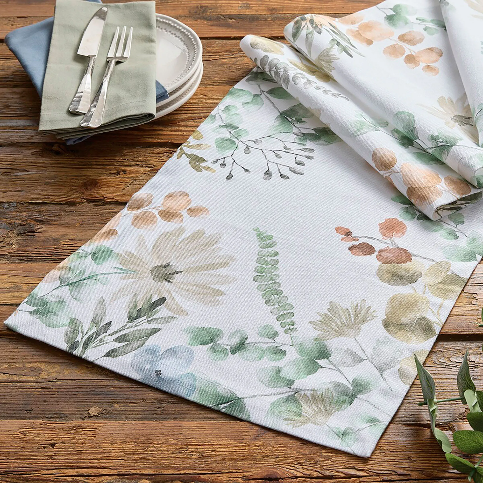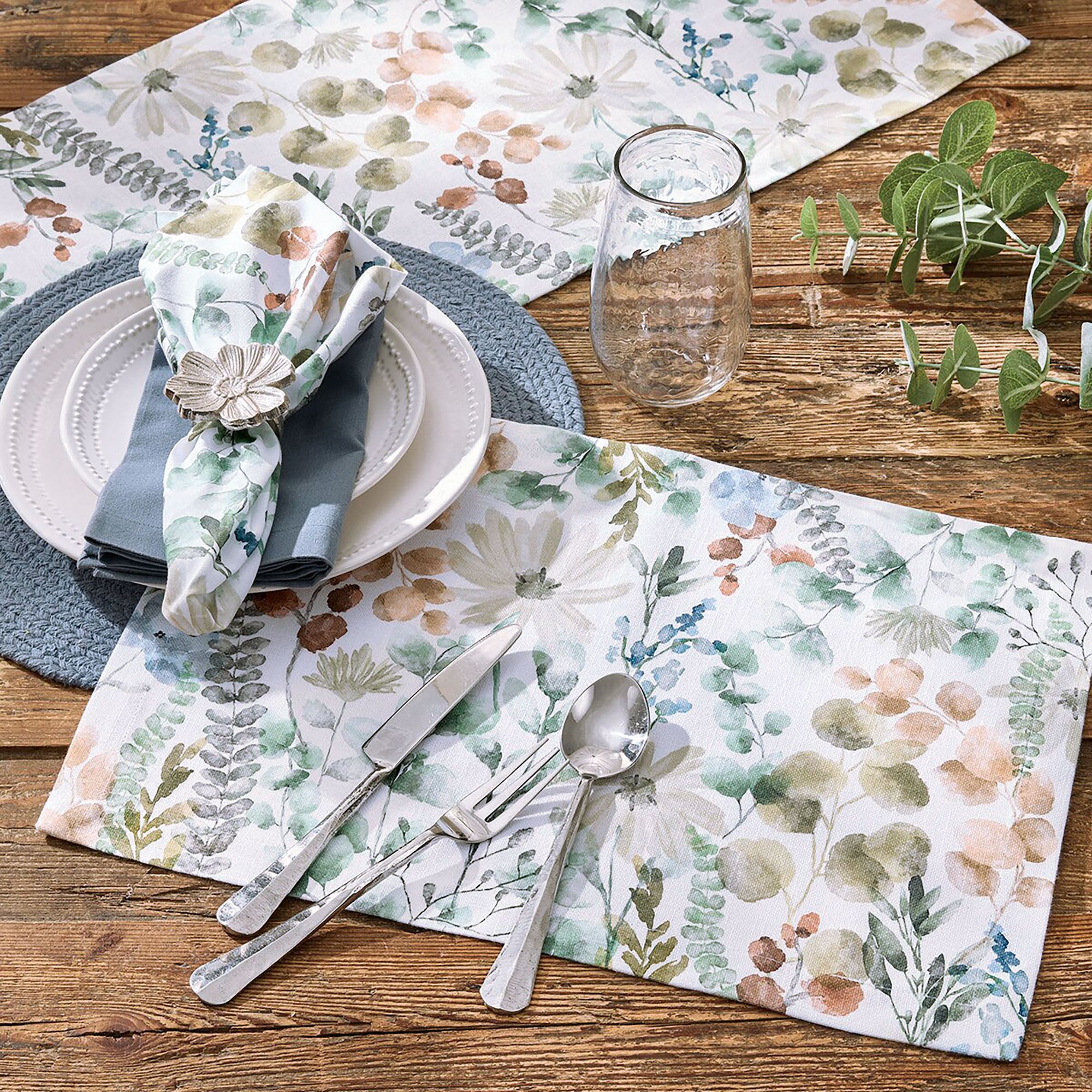 Allow this floral Melody to change the tune of your tablescape. Printed in a watercolor style, the light cotton table linens feature charming botanical flowers and leaves in green hues, sage, amber, cinnamon, and blue. Table Runner is available in two sizes; the 15"x72" size features botanical designs along the edges. Placemats are 19"x13"; sold as a four-piece set. Napkins are 20" sq.; sold as a four-piece set. Machine washable. Imported.