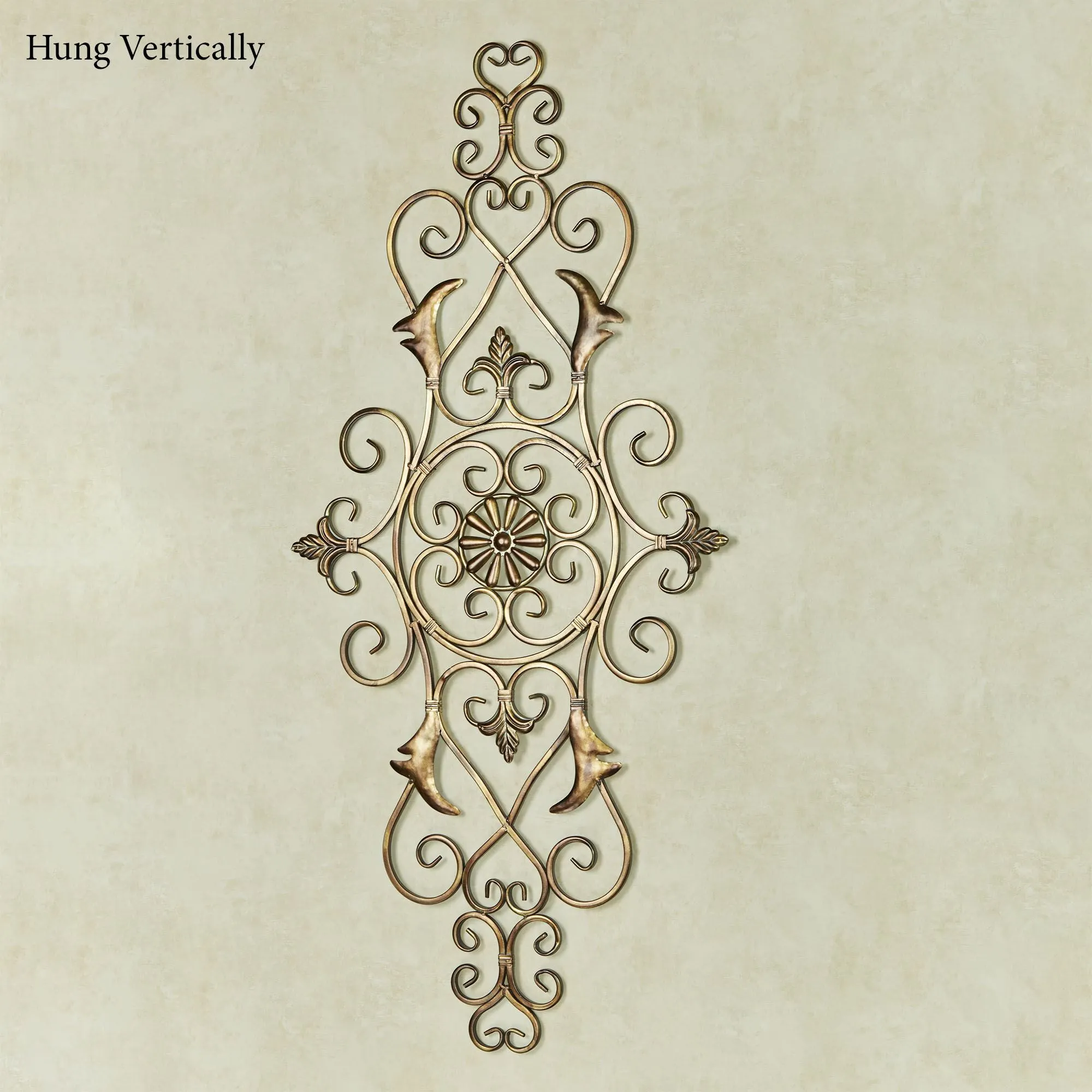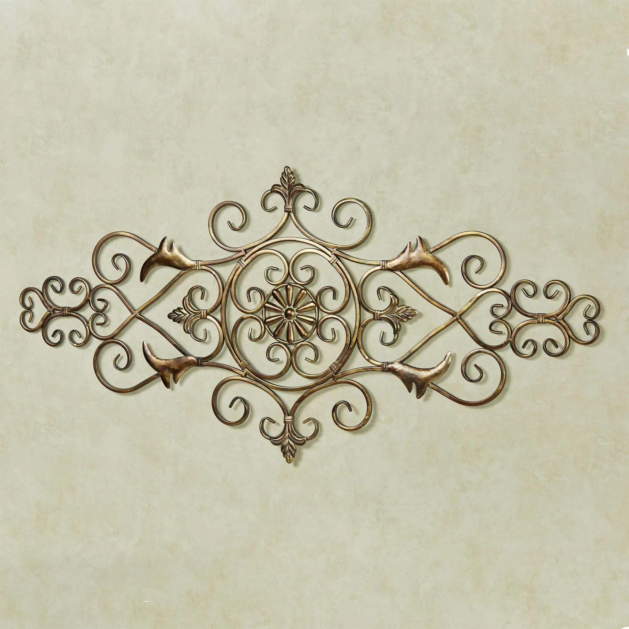 The Merano II Scrolling Wall Grille provides a sophisticated touch with an elegant flourish. With an openwork style and an antique gold finish, the metal wall grille features a lovely scrollwork design accented with heart shapes, leaves, fleurs-de-lis, and a center floral medallion. Artwork may hang horizontally or vertically. Measures 56"Wx1"Dx25"H.