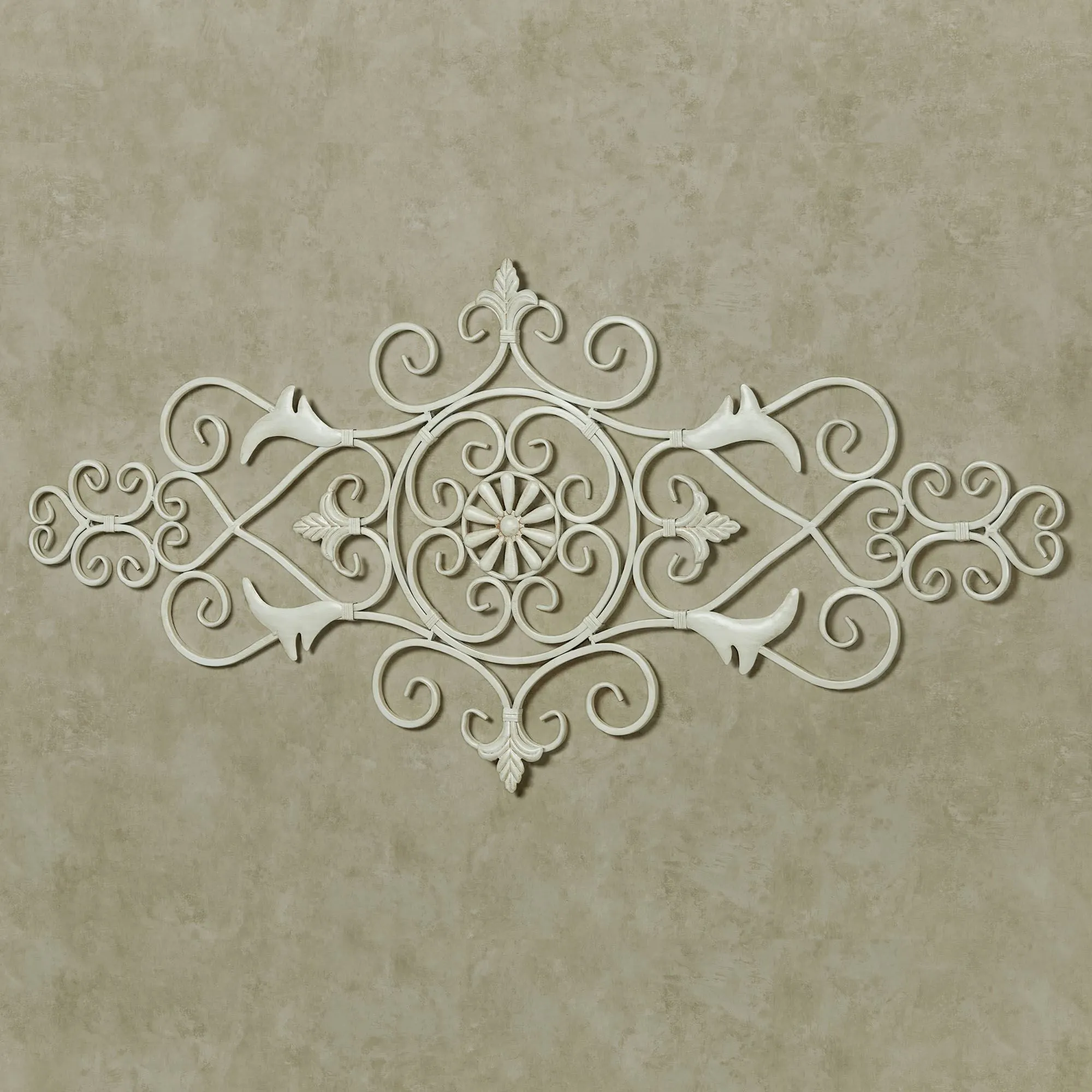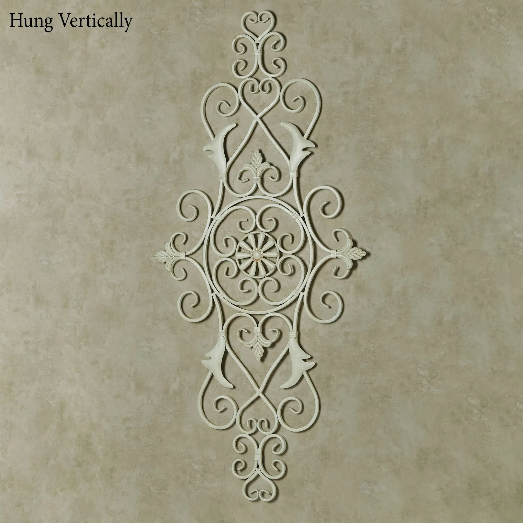 The Merano II Scrolling Wall Grille provides a sophisticated touch with an elegant flourish. With an openwork style and an ivory finish, the metal wall grille features a lovely scrollwork design accented with heart shapes, leaves, fleurs-de-lis, and a center floral medallion. Artwork may hang horizontally or vertically. Measures 56"Wx1"Dx25"H.