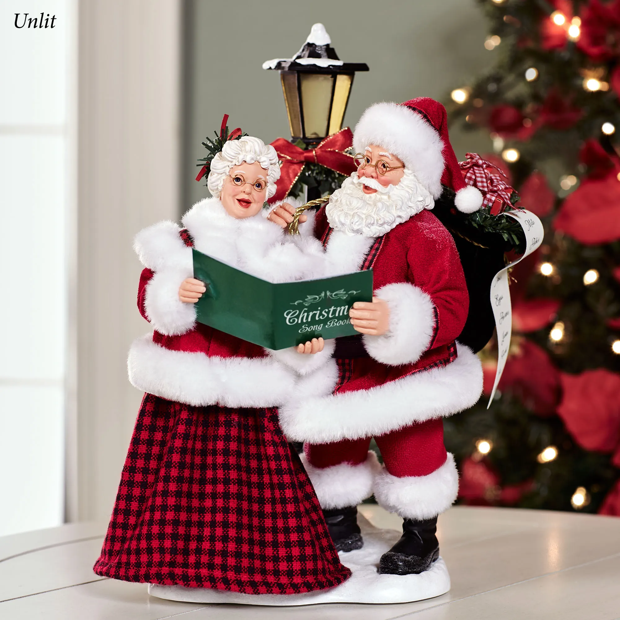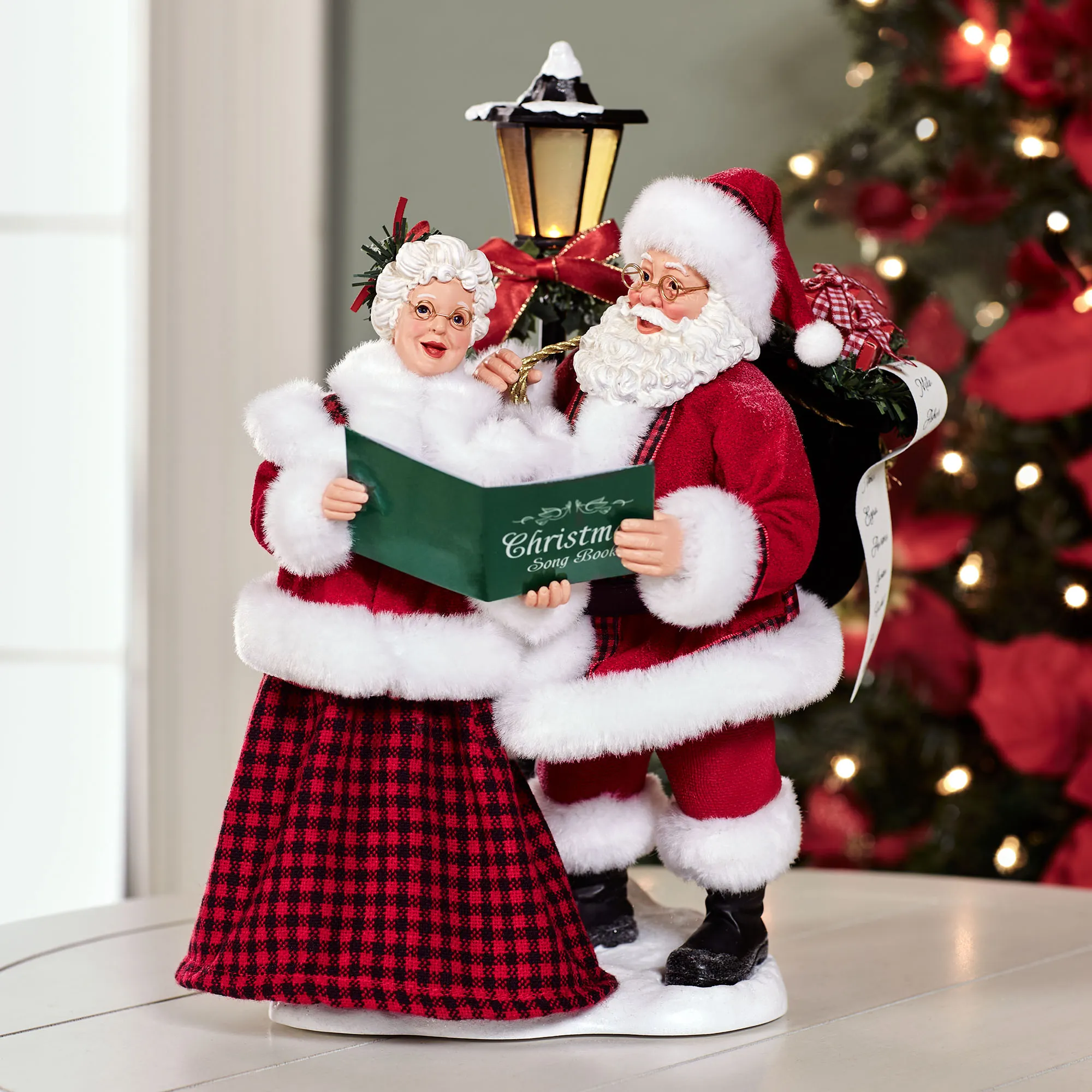 Blending together in harmony, Santa and Mrs. Claus make Merry Carolers. Standing out in the glittering snow, they hold the green "Christmas Song Book" and are dressed in coordinating red outfits with white faux fur trim and black plaid details. Eight classic holiday songs play from the design in a continuous loop: "Jingle Bells," "Silent Night," "Deck the Halls," "Joy to the World," "The First Noel," "Hark! The Herald Angels Sing," "O' Christmas Tree," and "We Wish You a Merry Christmas." The black lamppost also lights up and is decorated with a holly wreath. Requires three of your AAA batteries and operates from a Lights Only/Lights and Music switch on the bottom. Designed by Ann Dezendorf, the finely detailed Possible Dreams(R) Santas are dressed in hand-sewn polyester Clothtique(R) costumes, which are specially stiffened to add realism. The handpainted resin faces express the sincere emotions prized by collectors. Overall, measures 9.5"Wx10"Dx13.5"H. Imported.