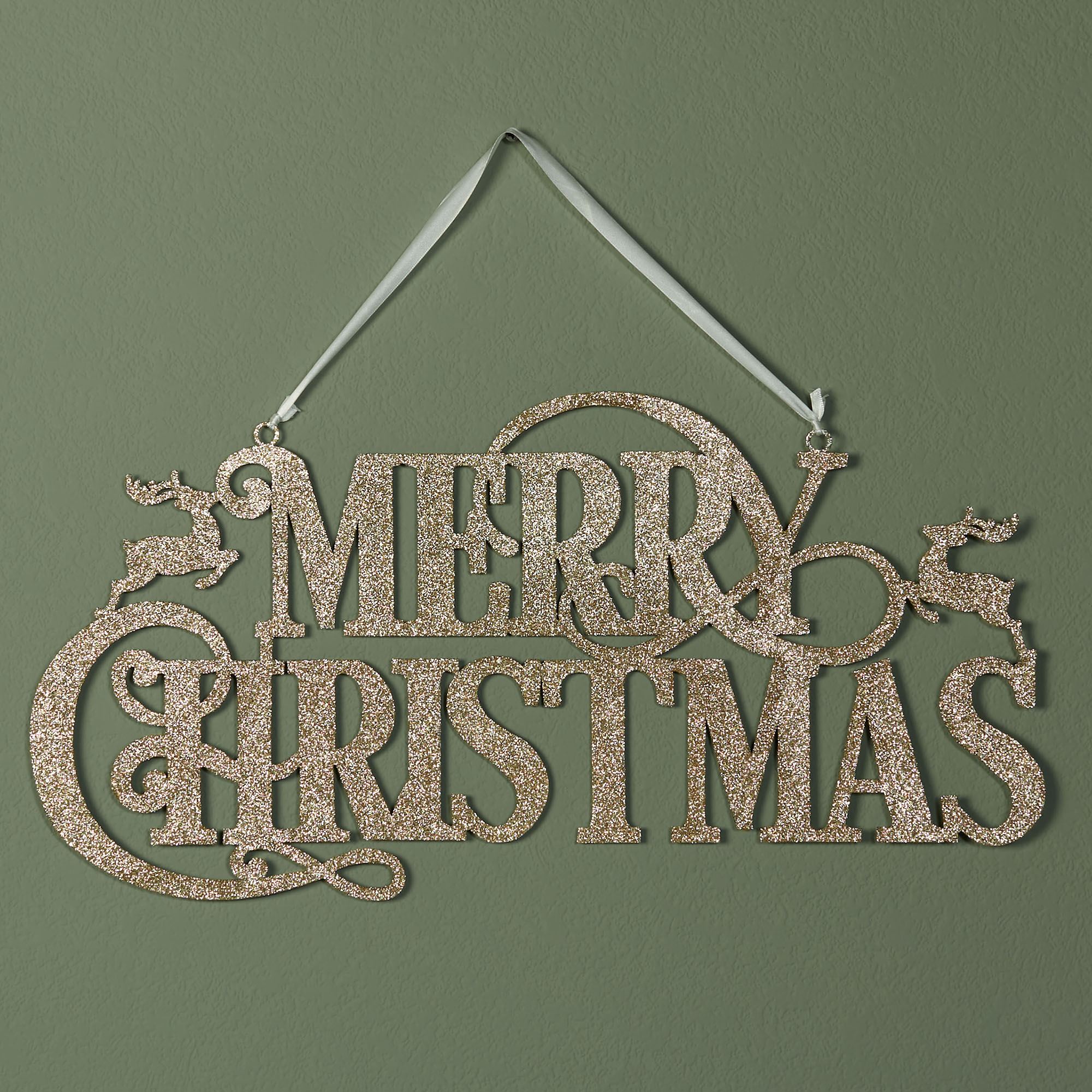 Merry Christmas greetings are always friendly and welcoming. This metal sign has the words "Merry Christmas" in a metallic glittered champagne gold finish and a leaping deer on each side. A connected ivory ribbon is at the top for hanging. Overall, measures approx. 23.5"Wx18"H, including the ribbon.