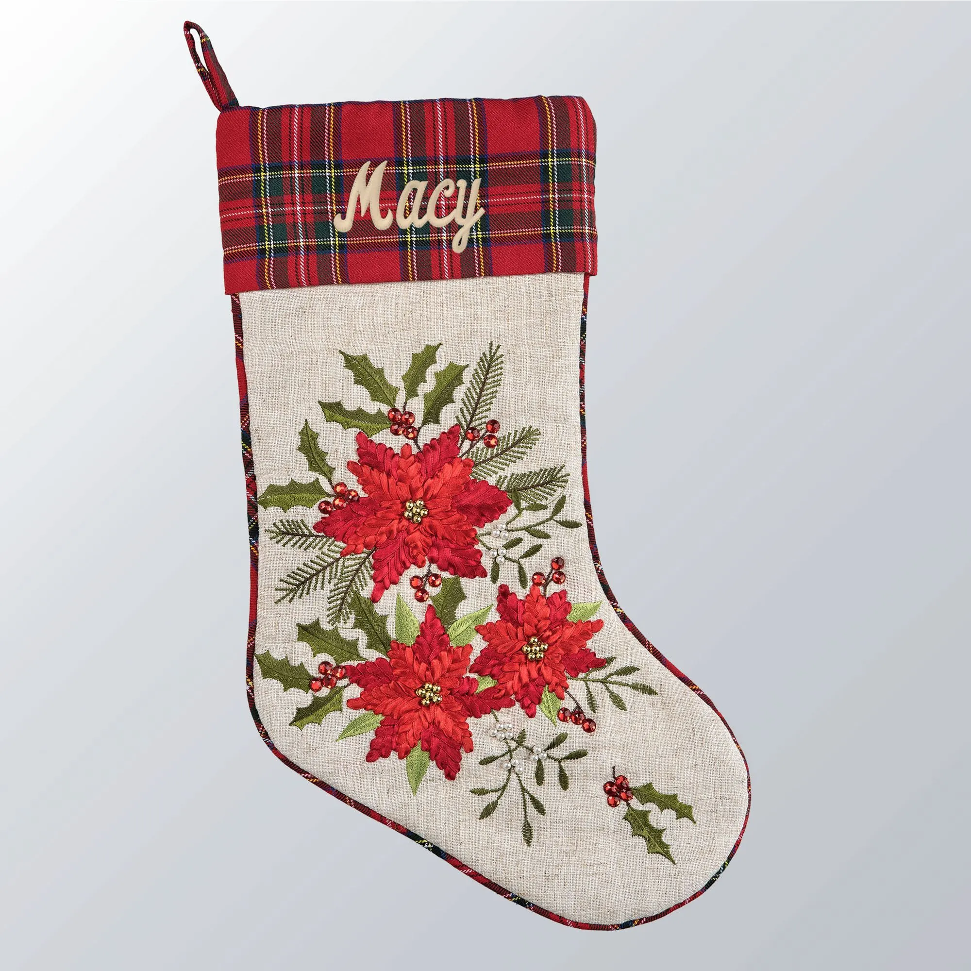 The Merry Poinsettia Christmas Stocking joyfully decorates with festive flowers. This polyester stocking features handcrafted red ribbon poinsettias, faux jewels, and embroidered holly leaves and pine branches on a linen background. Gold beads accent the center of each flower. The cuff and attached loop for hanging are plaid. Personalization is available, as shown, for FREE! Click on the burgundy "i" icon below the item name for more information. Due to the handcrafted nature, no two stockings are exactly alike. Variations may occur. Measures 8"Wx19"L. Spot clean. Imported.