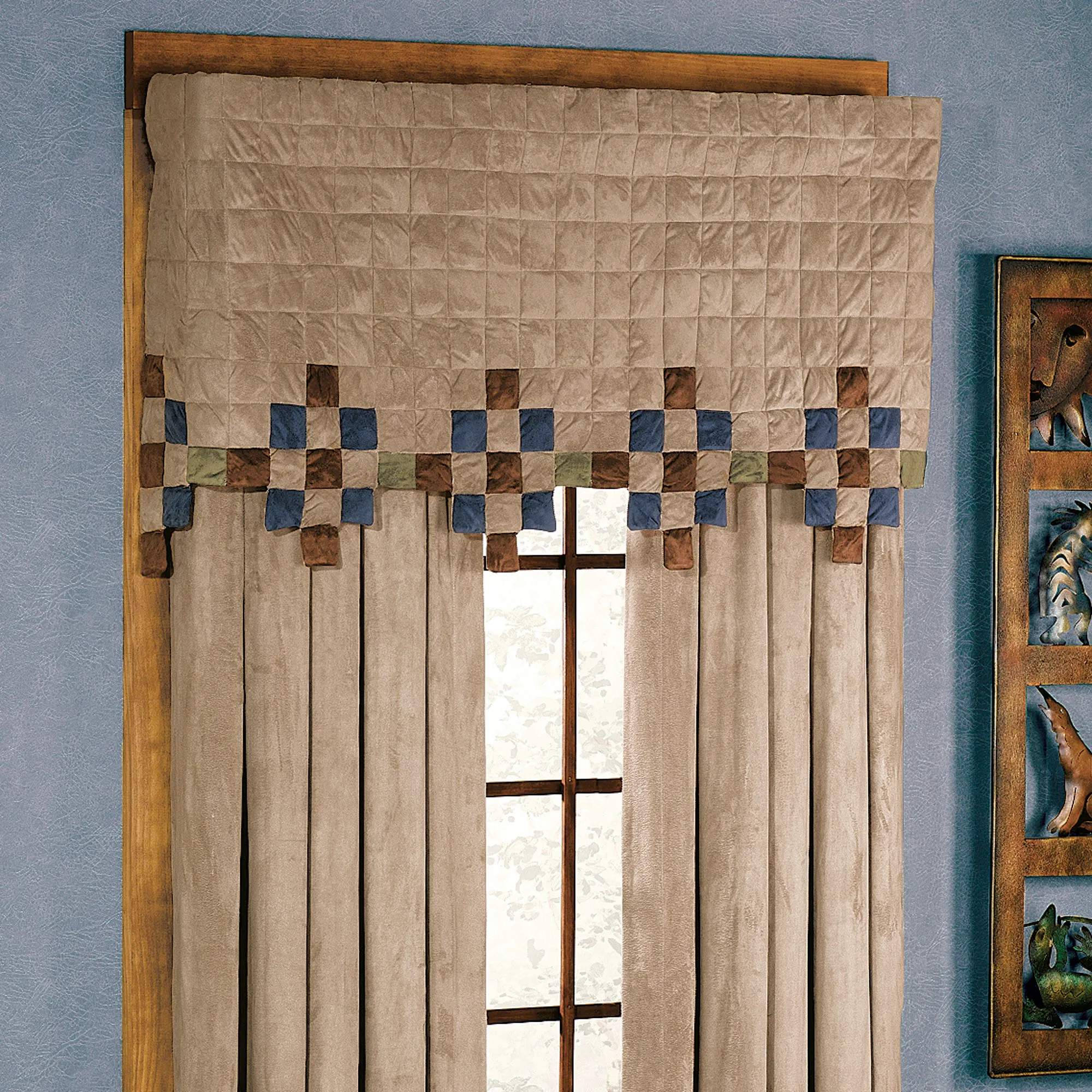 The Mesa Indigo/Sand Contour Valance features soft, polyester faux suede fabric in Southwest colors. Sand-colored window treatment has squares of chocolate, sage, and indigo that form patterns along the bottom. Contour Valance is box-quilted and has a 3" rod pocket. 52"Wx22"L.