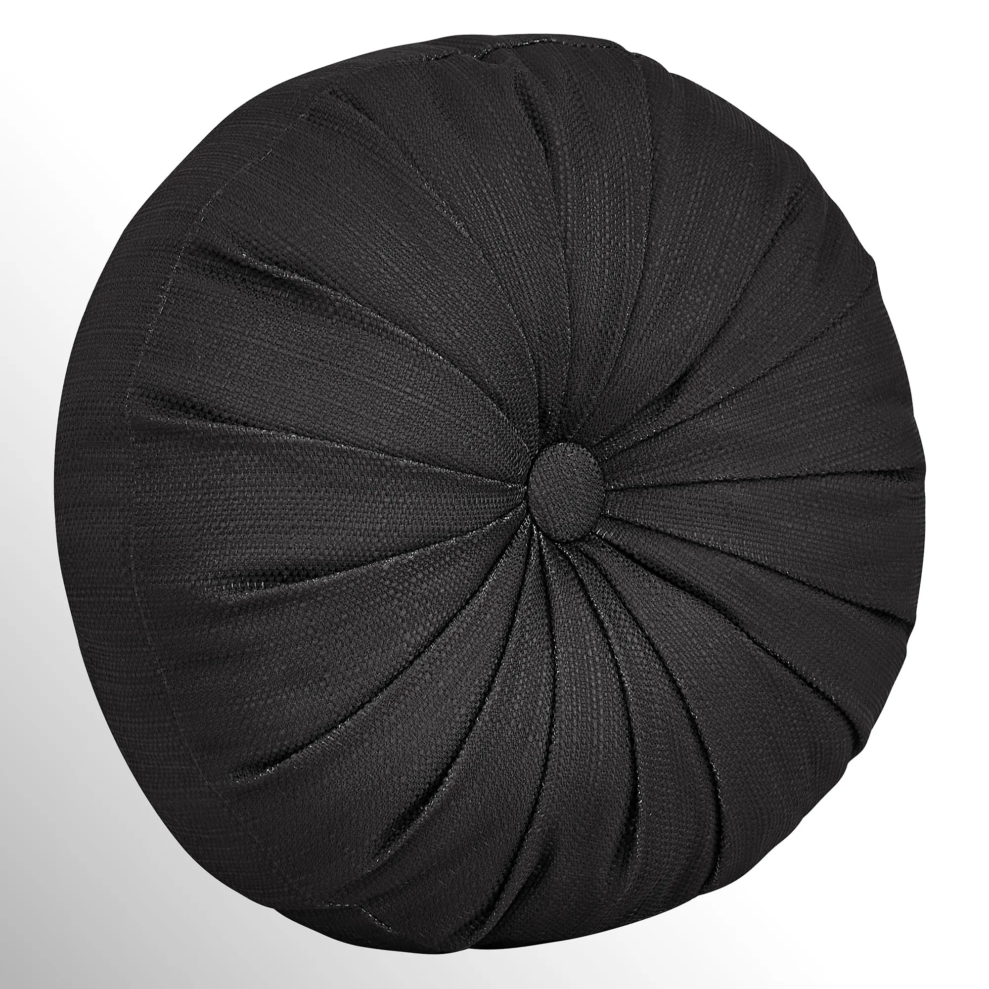 Pillows: Spot clean. Square has damask and flanged edges. Rectangle is black with a scrollwork trim center and piped edges. Reversible, handmade Round is pleated black with a button-tuft center and a 2" side gusset.