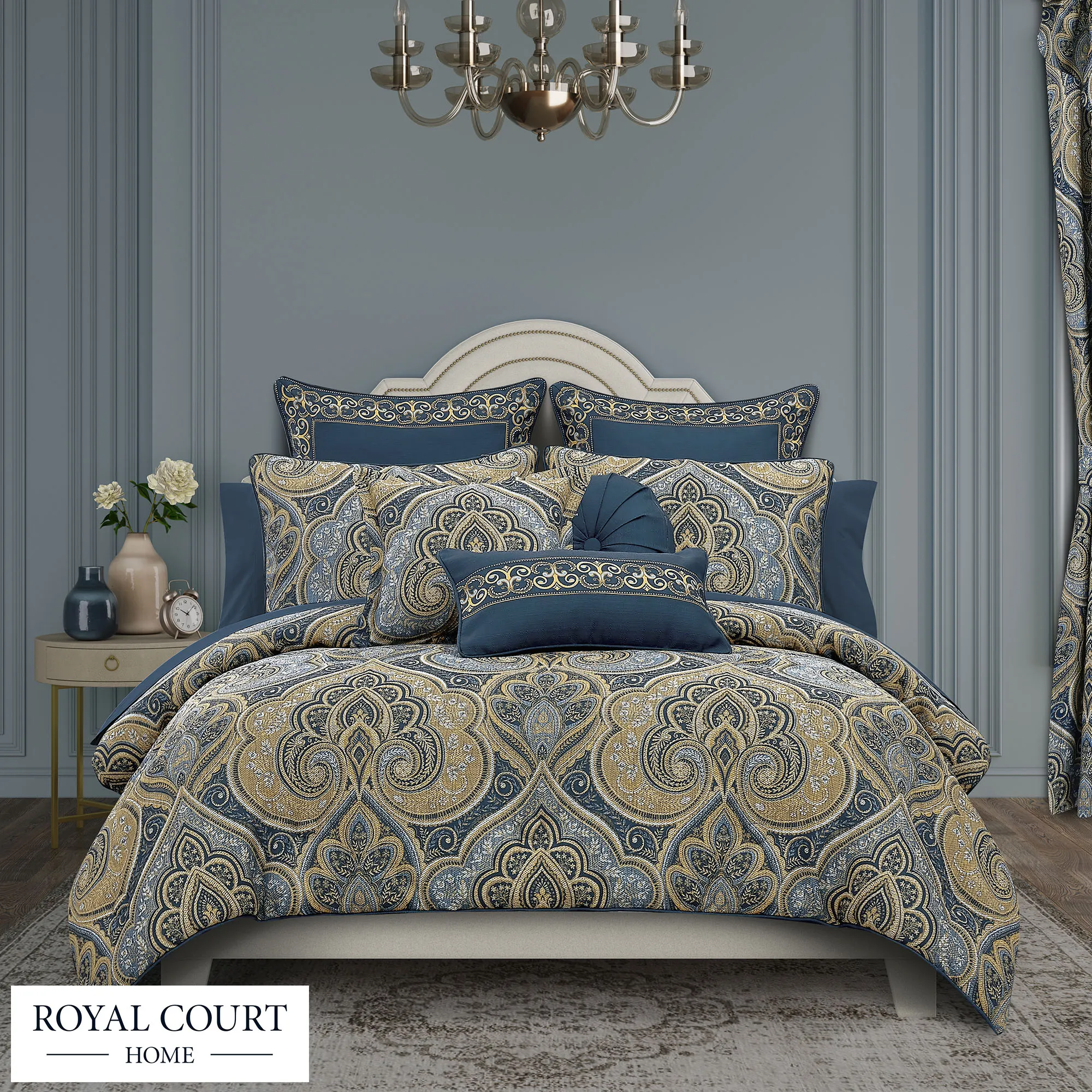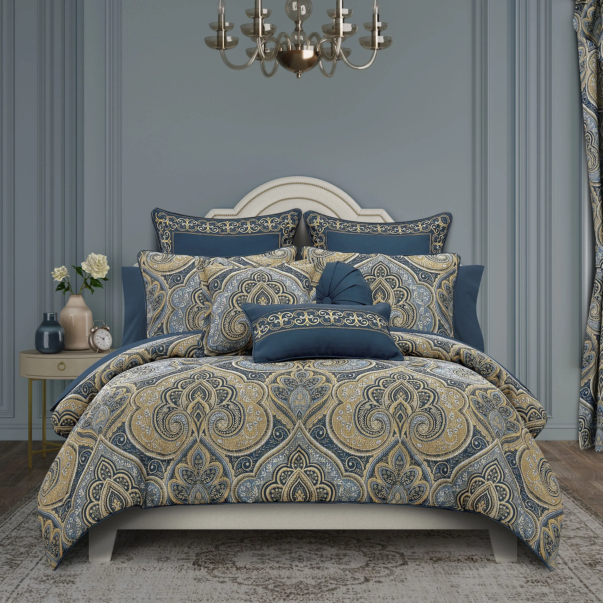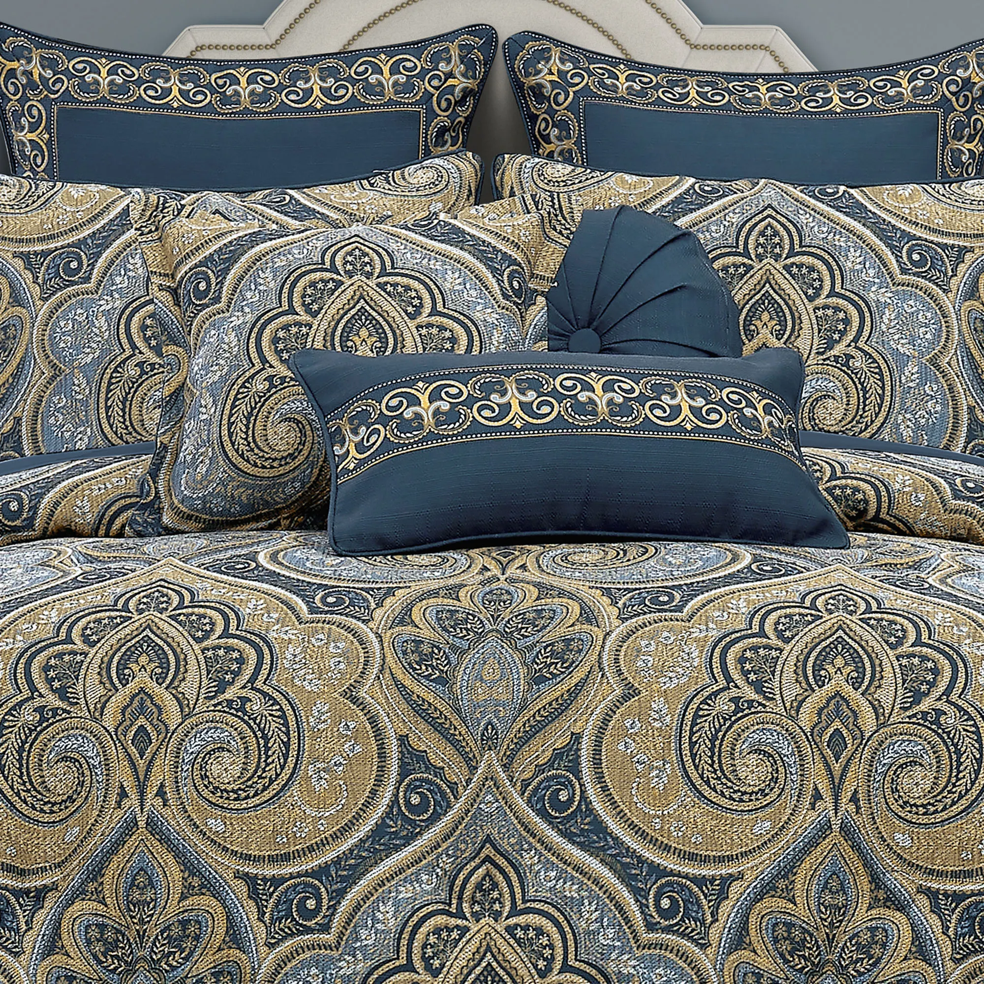 Messina II Navy Blue and Gold Damask Comforter Set Luxury Bedding by Royal Court