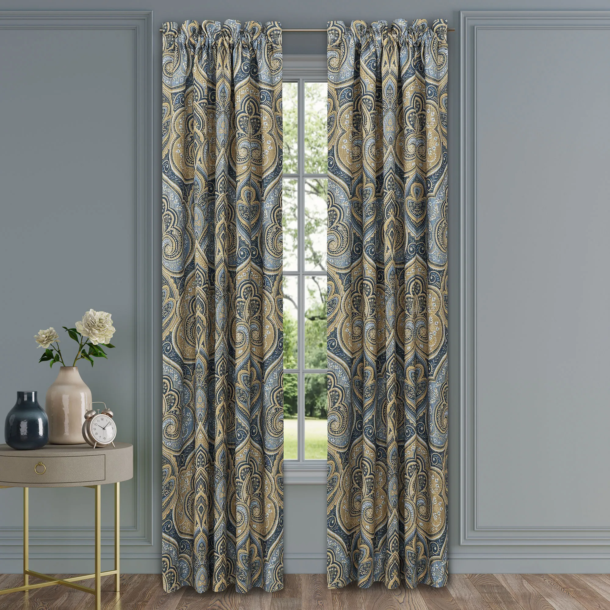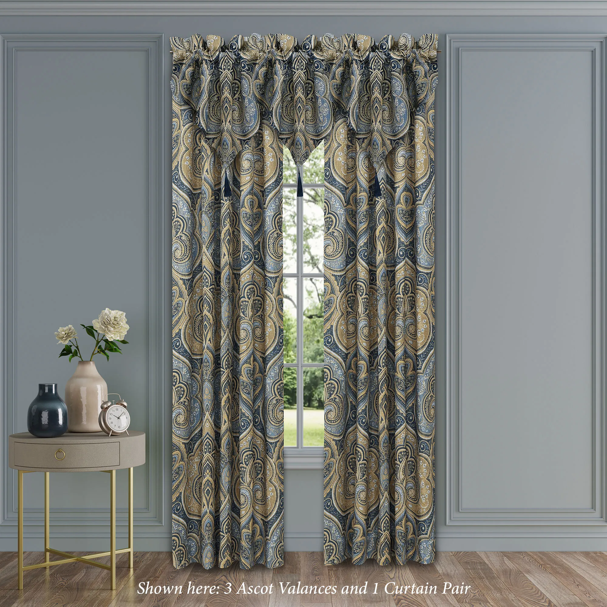 Window Treatment: Wide Curtain Pair has a 3" rod pocket and is 100"Wx84"L. Each Ascot Valance has a 3.25" rod pocket and is 40"Wx21"L.