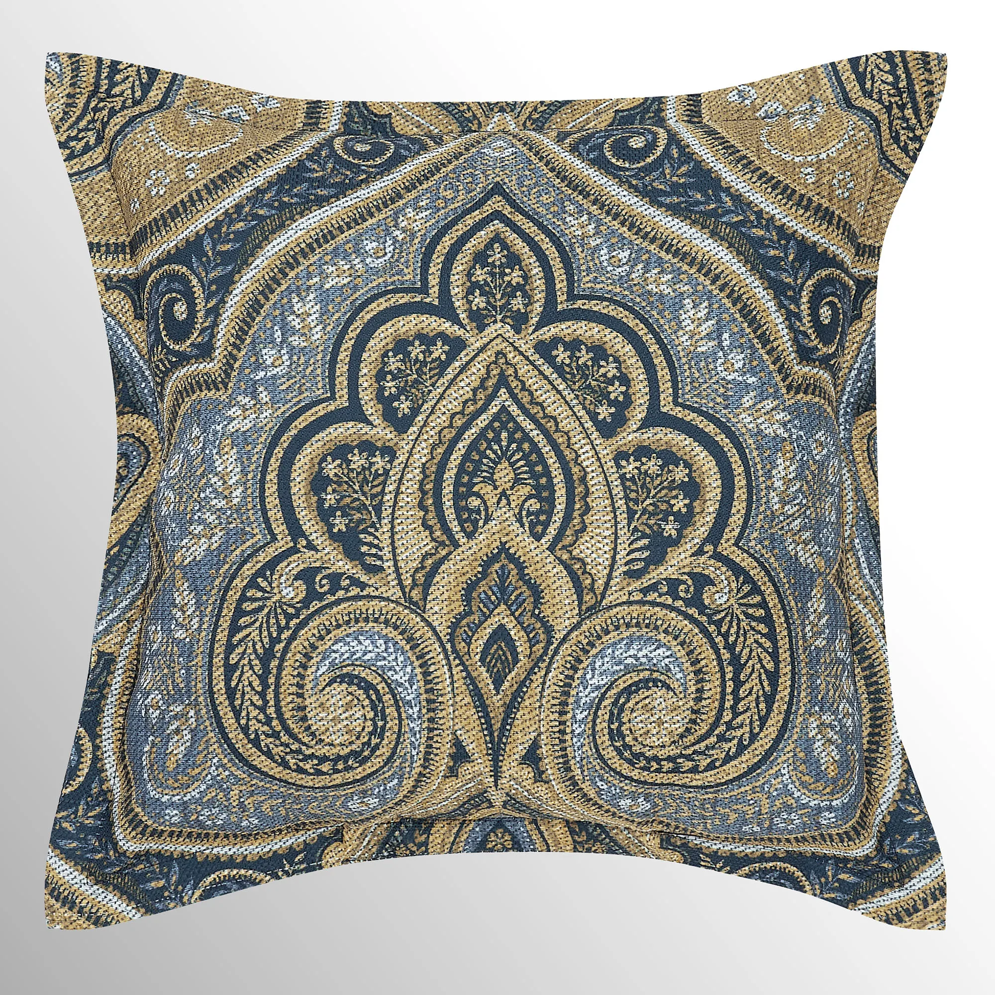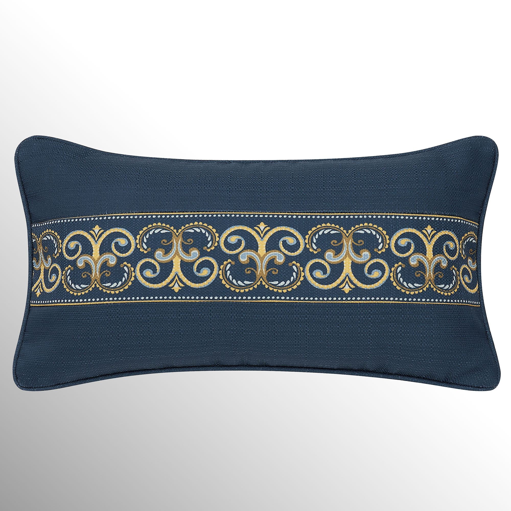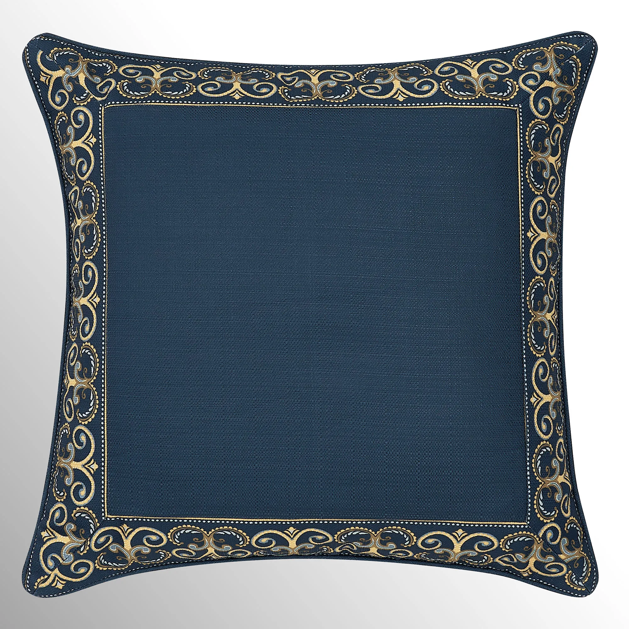 Piped European Sham has a navy center framed in scrollwork trim; zipper closure.