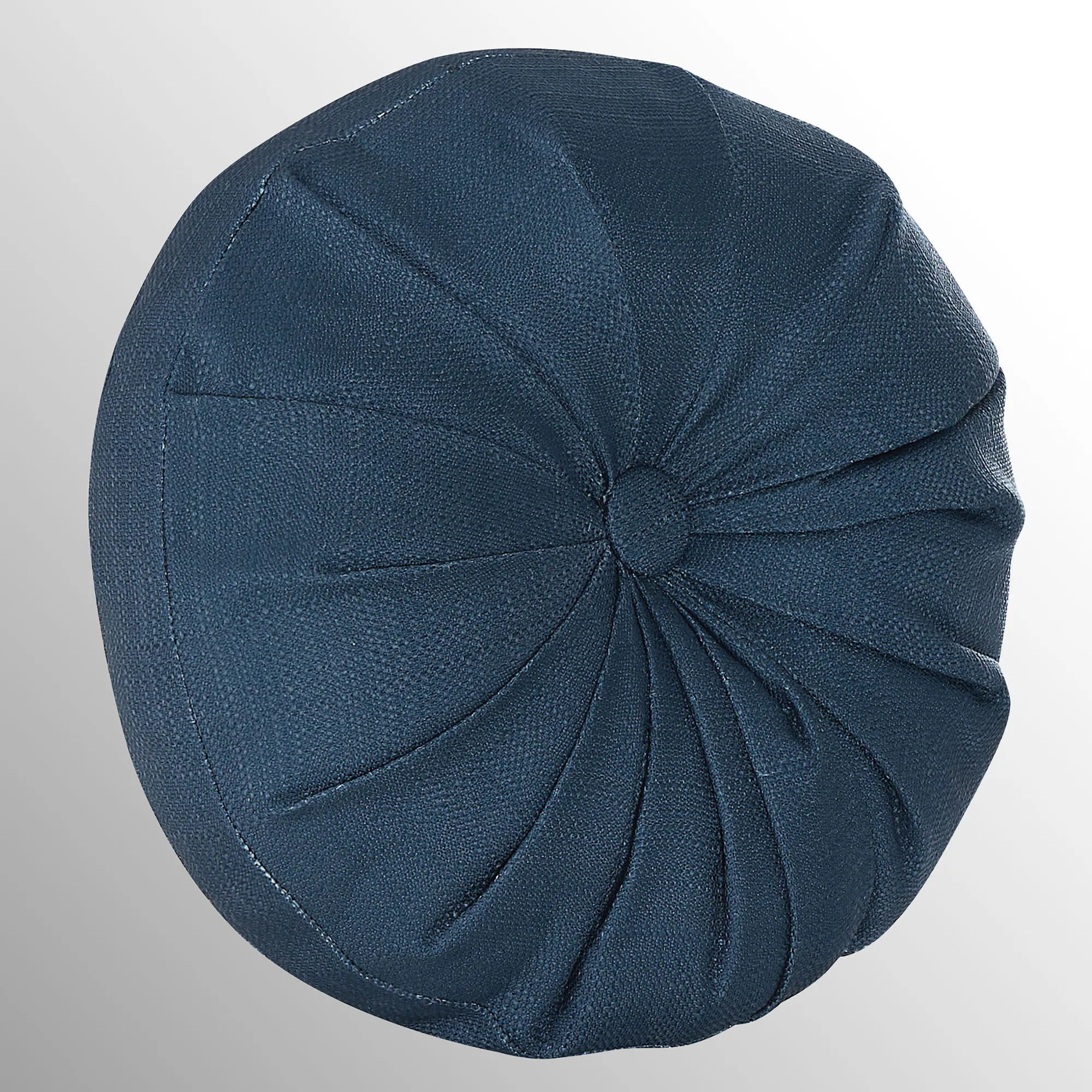 Pillows: Spot clean. Square has damask and flanged edges. Rectangle is navy with a scrollwork trim center and piped edges. The reversible, handmade Round is pleated navy with a button-tuft center and a 2" side gusset.