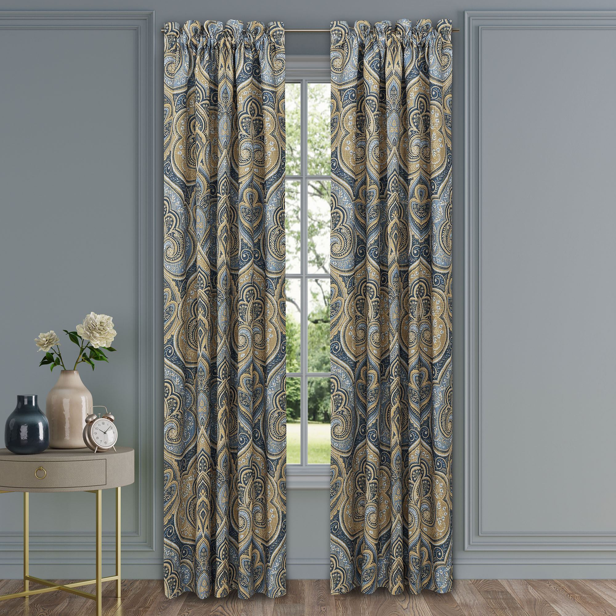 Lined Window Treatments have damask and tailored edges. Wide Curtain Pair has a 3" rod pocket. Tiebacks are included. Each Ascot Valance has a tassel on the end and a 3.25" rod pocket.