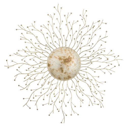 Golden branches with small berries fan out from the circular center on the Metallic Burst Wall Art. This metal wall art sculpture has weather- and fade-resistant finishes in antique gold and silver foil along with antique white/gold undertones. Indoor or outdoor year-round use. Measures 30"dia.x2"D.
