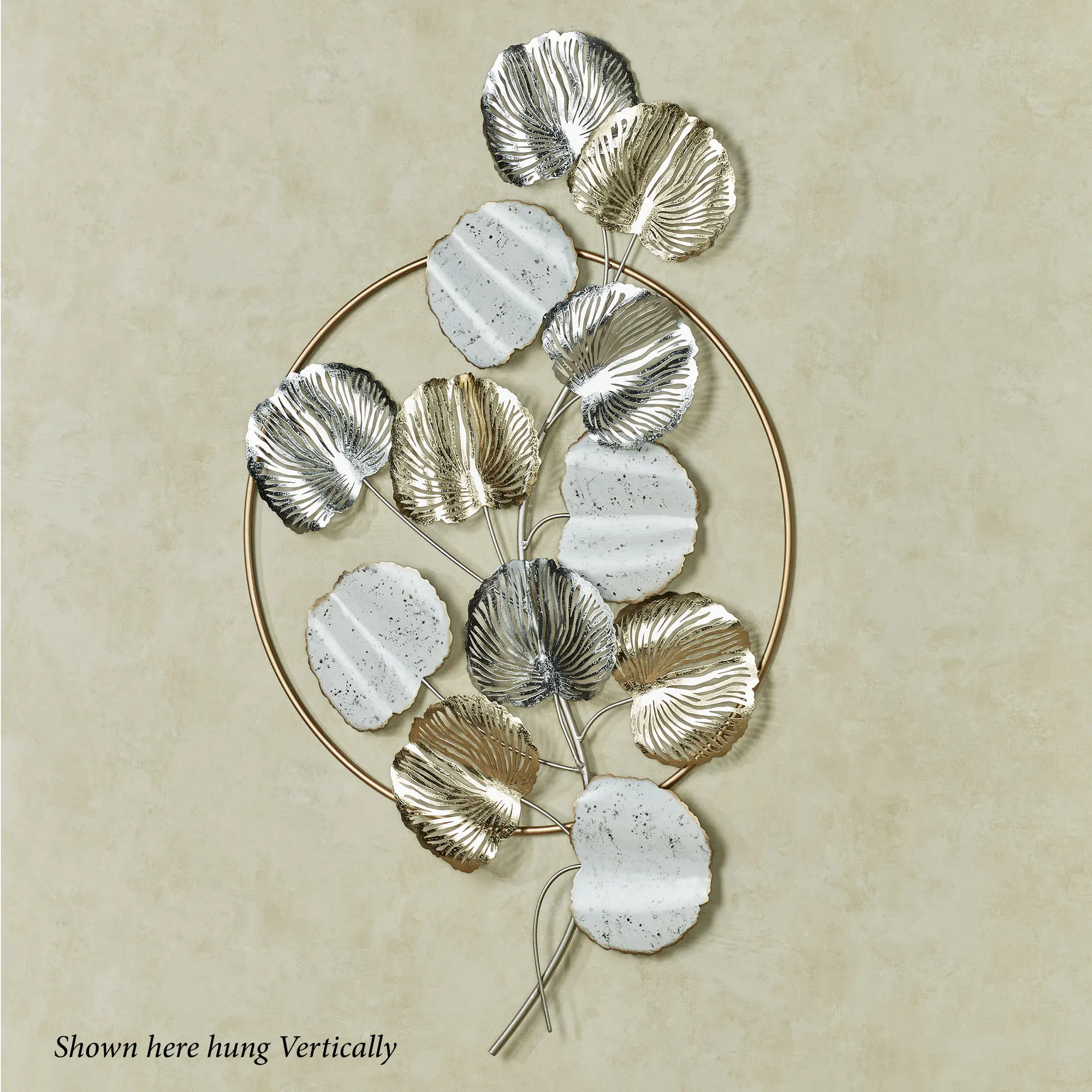 Solid and openwork leaves add a Metallic Splendor to any room. Made of metal, this hand-finished wall art has a circular gold frame with overlapping gold and silver foil leaf designs, as well as speckled white leaves. Wall art may hang horizontally or vertically. Measures 37"Wx3"Dx21.5"H.