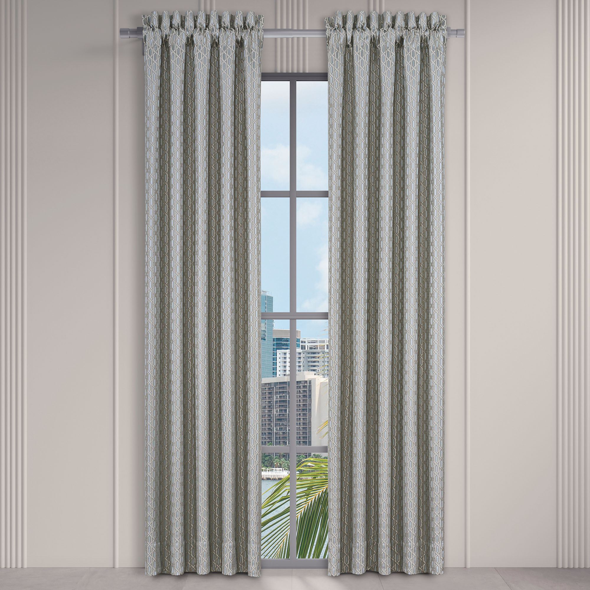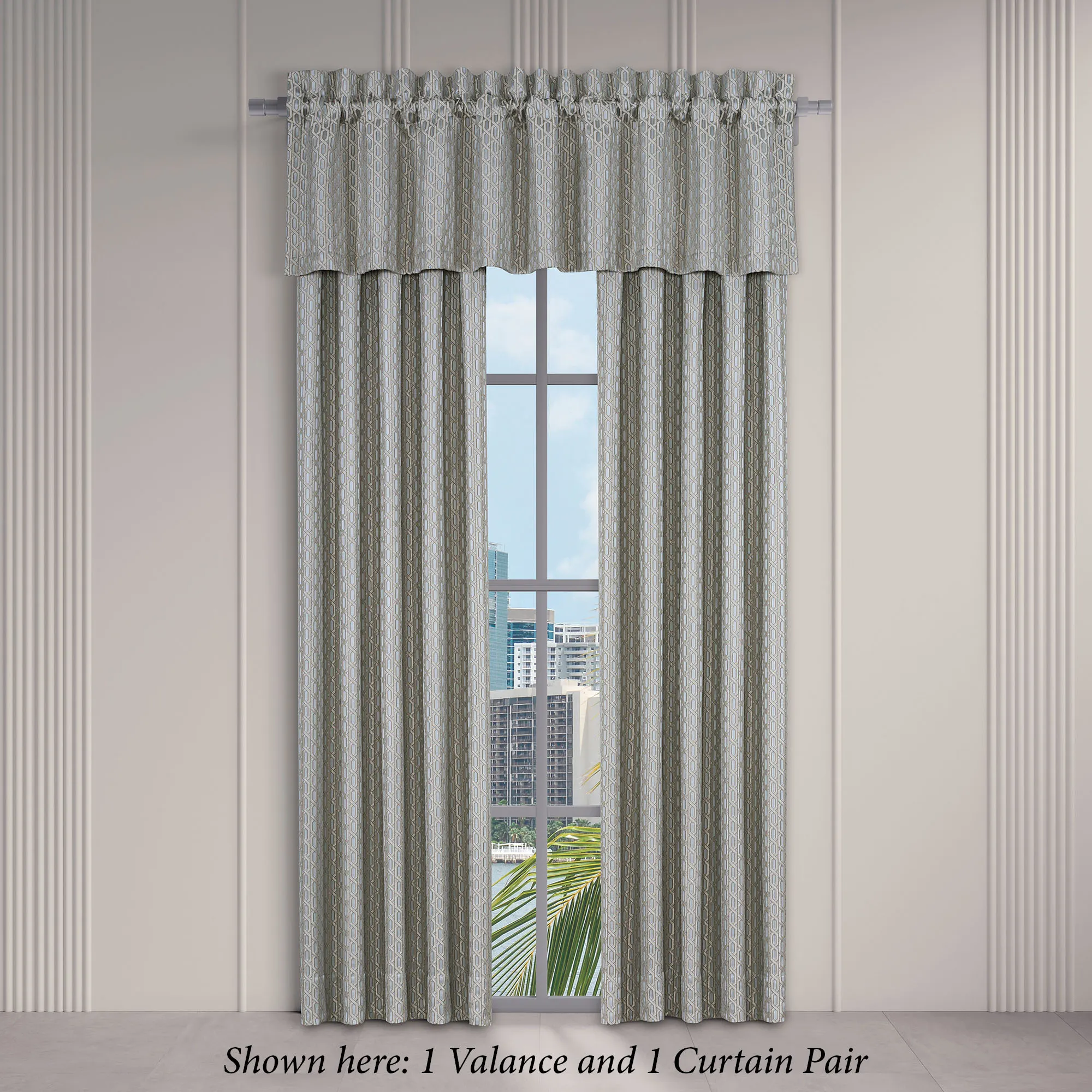 Tailored, lined Window Treatments have woven geometrics and 3" rod pockets. Specify Wide Curtain Pair or Valance. Wide Curtain Pair includes tiebacks. Curtains are available in two lengths.
