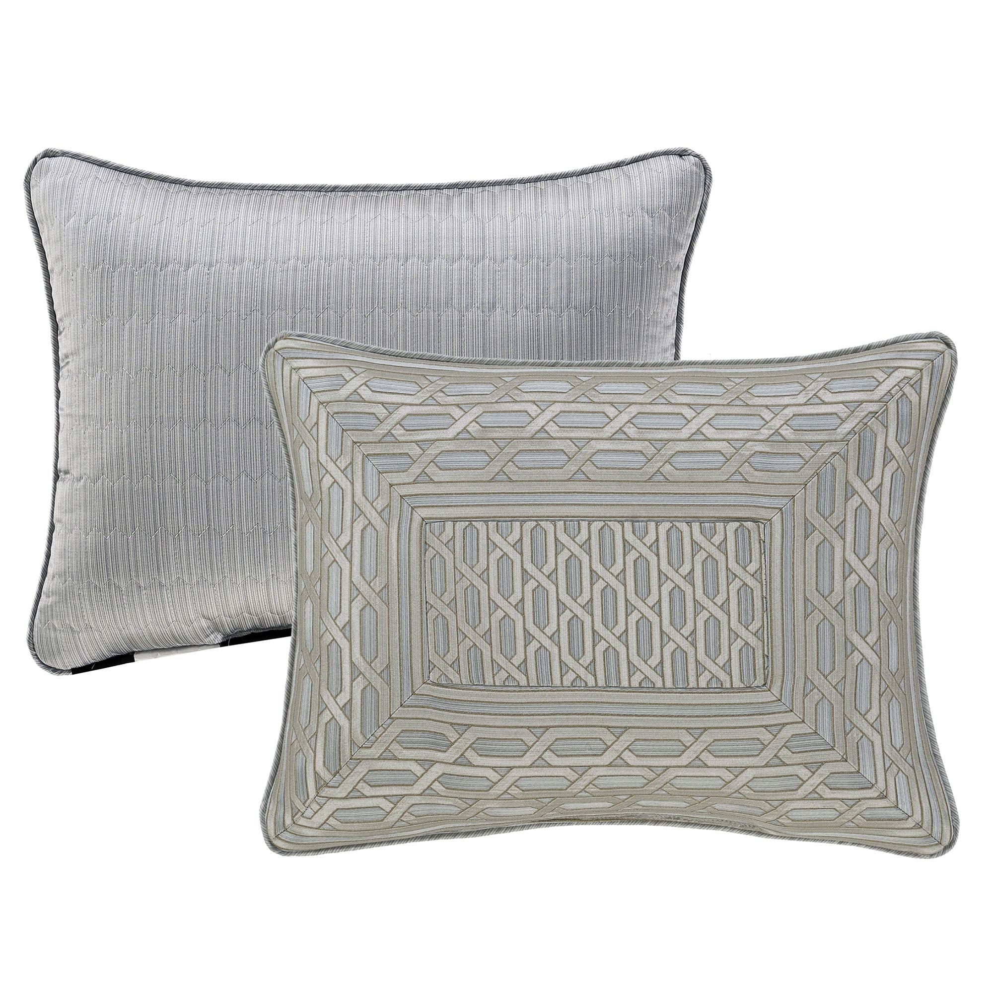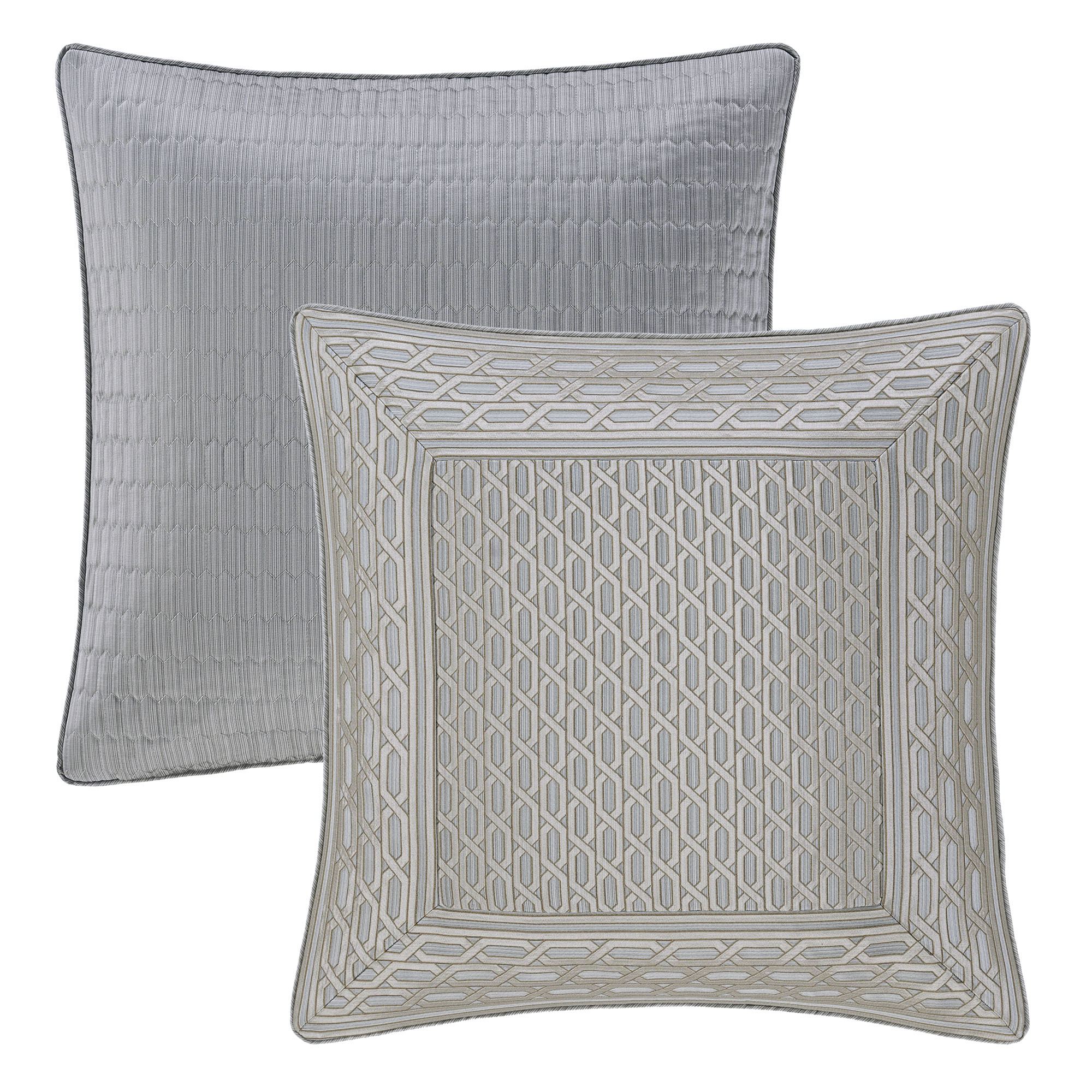 The piped European Sham has mitred corners, woven geometrics, and a zipper closure; reverses to striated polyester satin with geometric quilting.