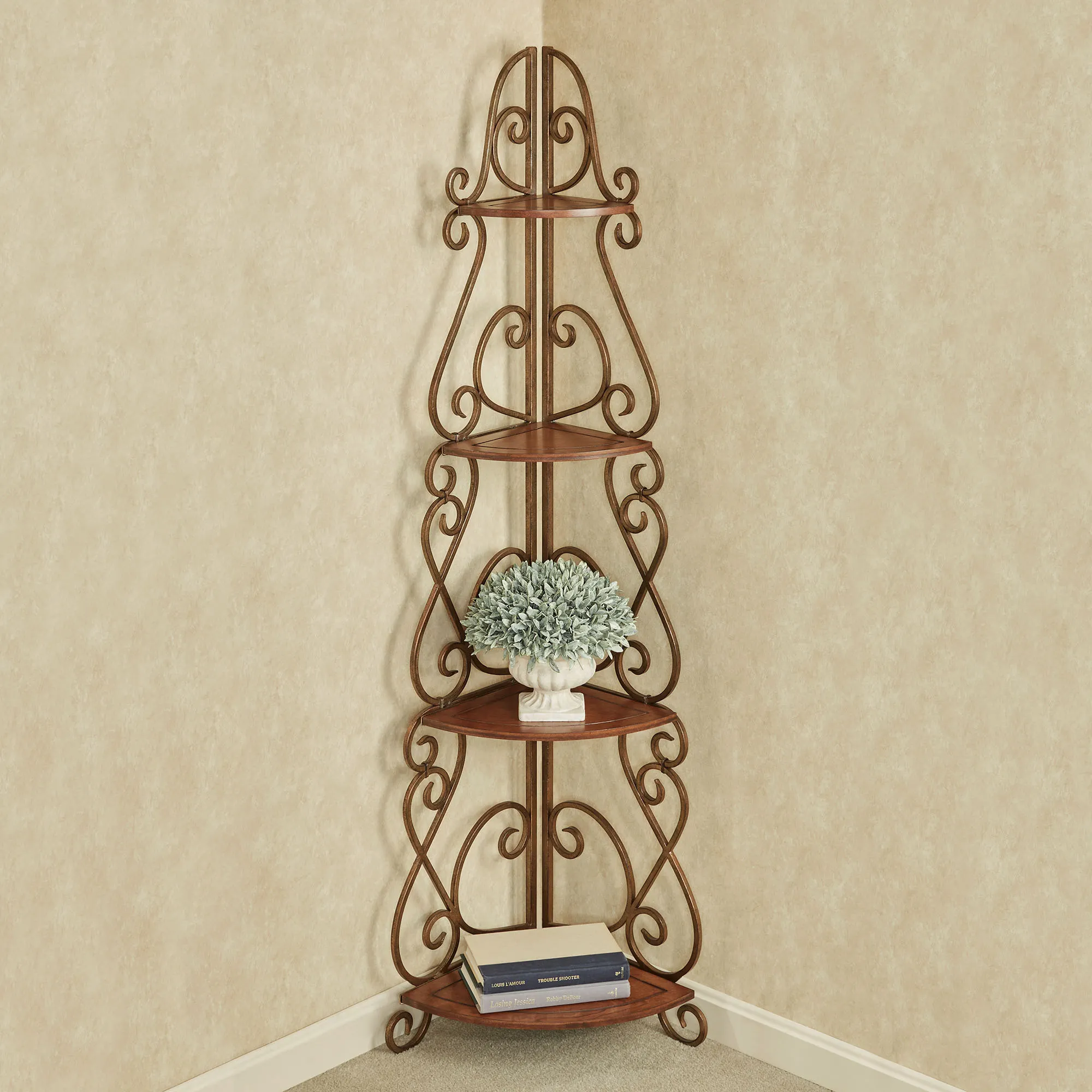 The Meyda Scrolling Corner Etagere is wooden and metal.