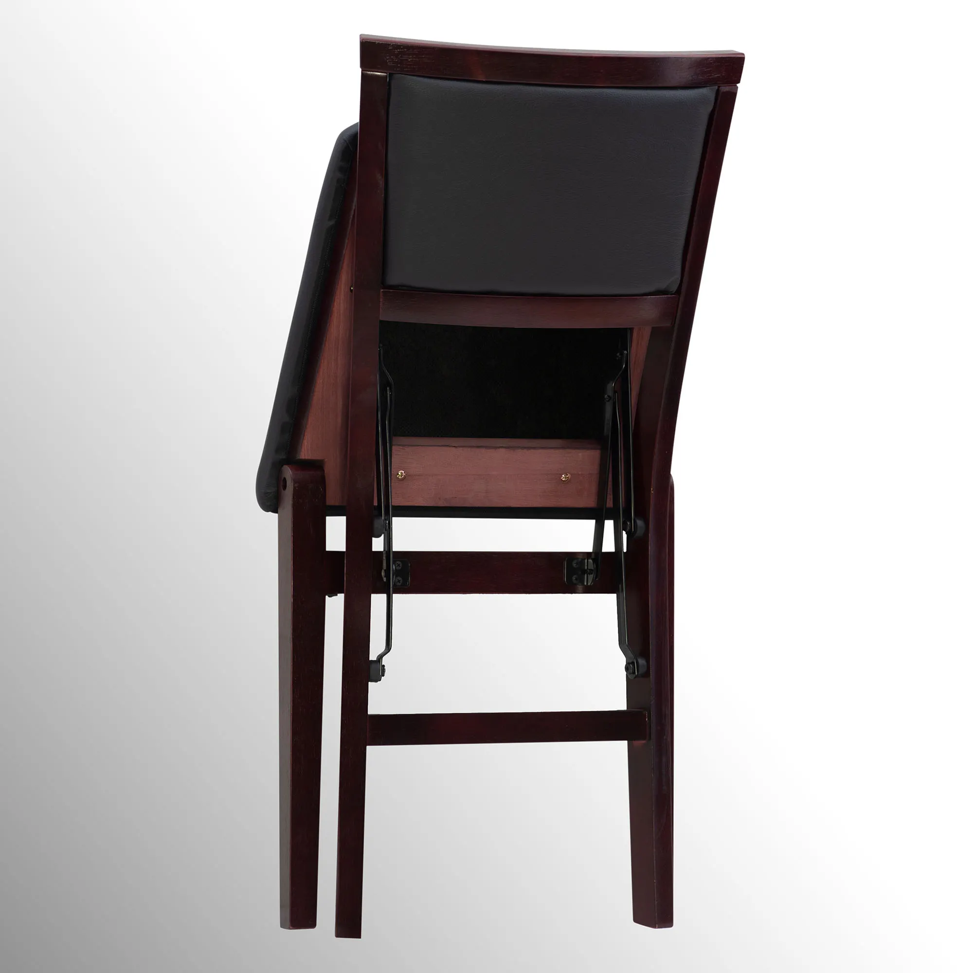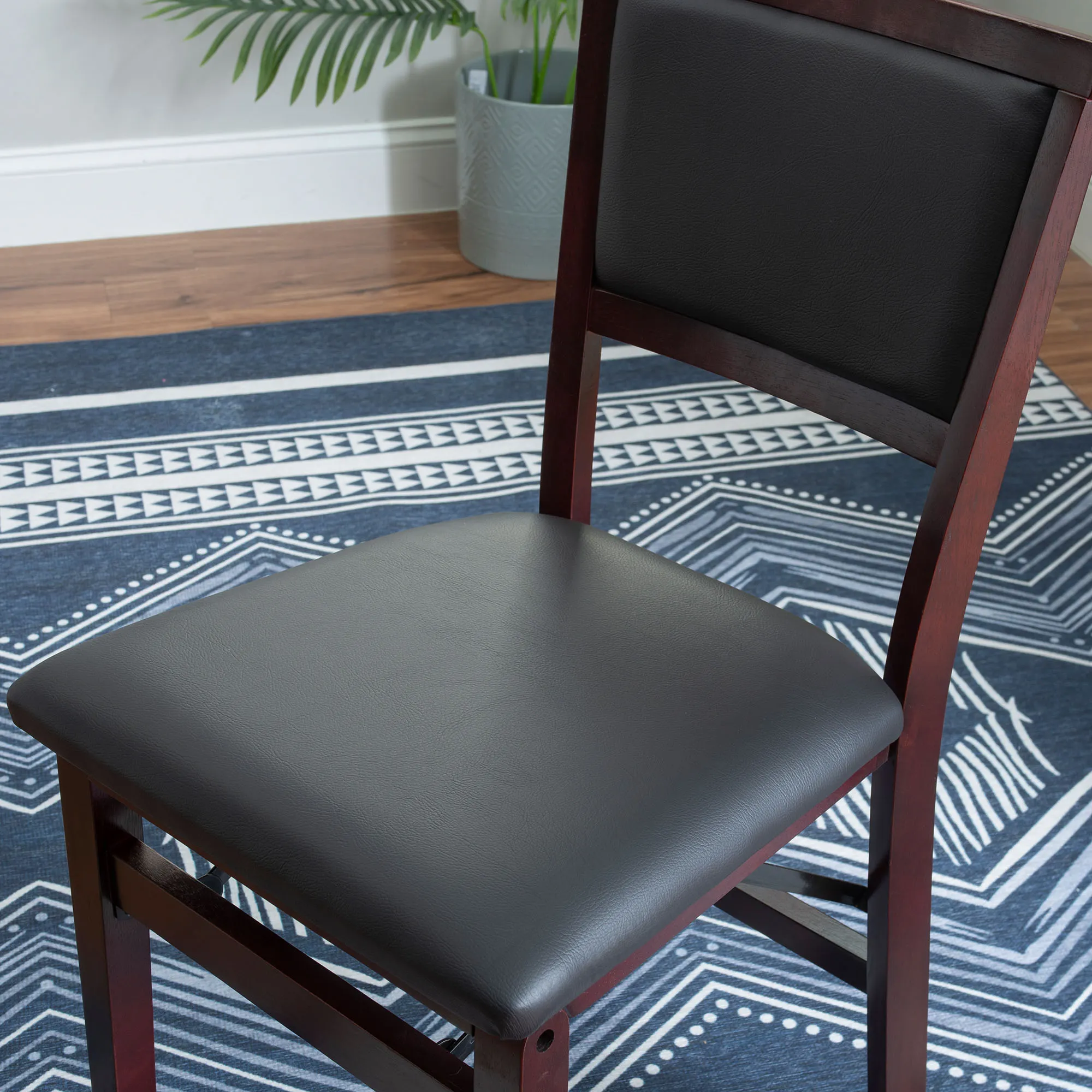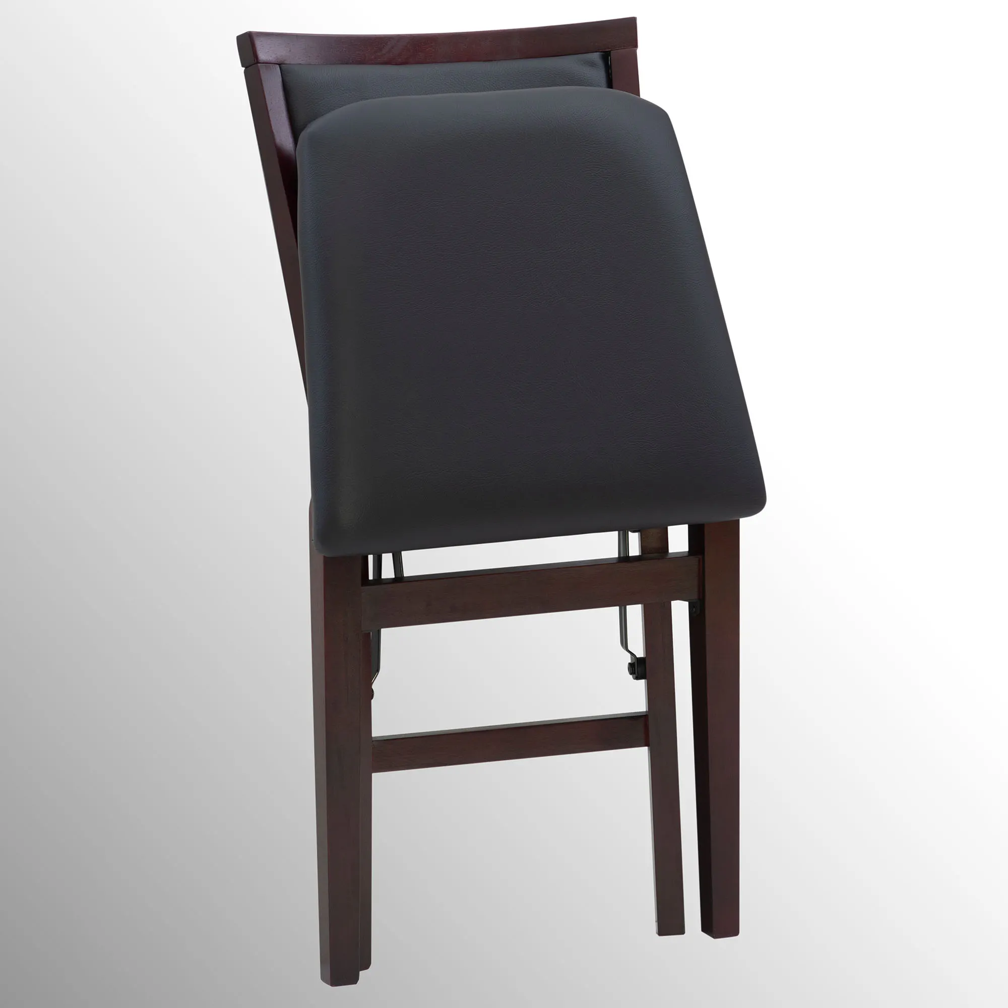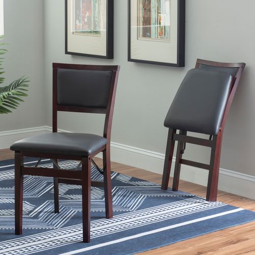 Comfort, style, and convenience converge within the Micah Folding Chair Set. With sleek classic lines, each rich espresso-finished wood chair features an upholstered seat and back with brown faux leather foam-padded cushions. The front and rear steel supports provide extra stability to the chair's folding design. Seat height is 19". Overall, each foldable dining chair measures 17"Wx20"Dx33"H. Set weighs approx. 28 lbs. Wipe the fabric to clean.