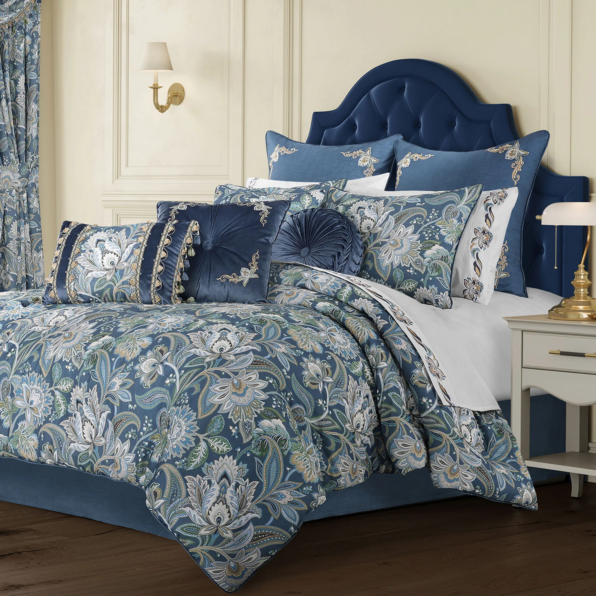 Jacobean florals blossom and bloom throughout the night as you rest with the Michaela Bedding. From Five Queens Court, the printed cotton ensemble features blue, gold, green, chocolate, and white elaborate stylized flowers and leaves on a woven slubbed blue ground. Solid blue elements with velvet and slubbed woven textures complement the designs with a bold contrast.