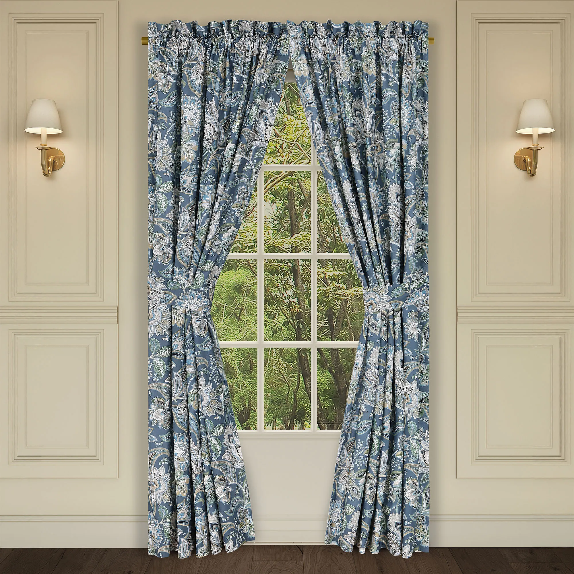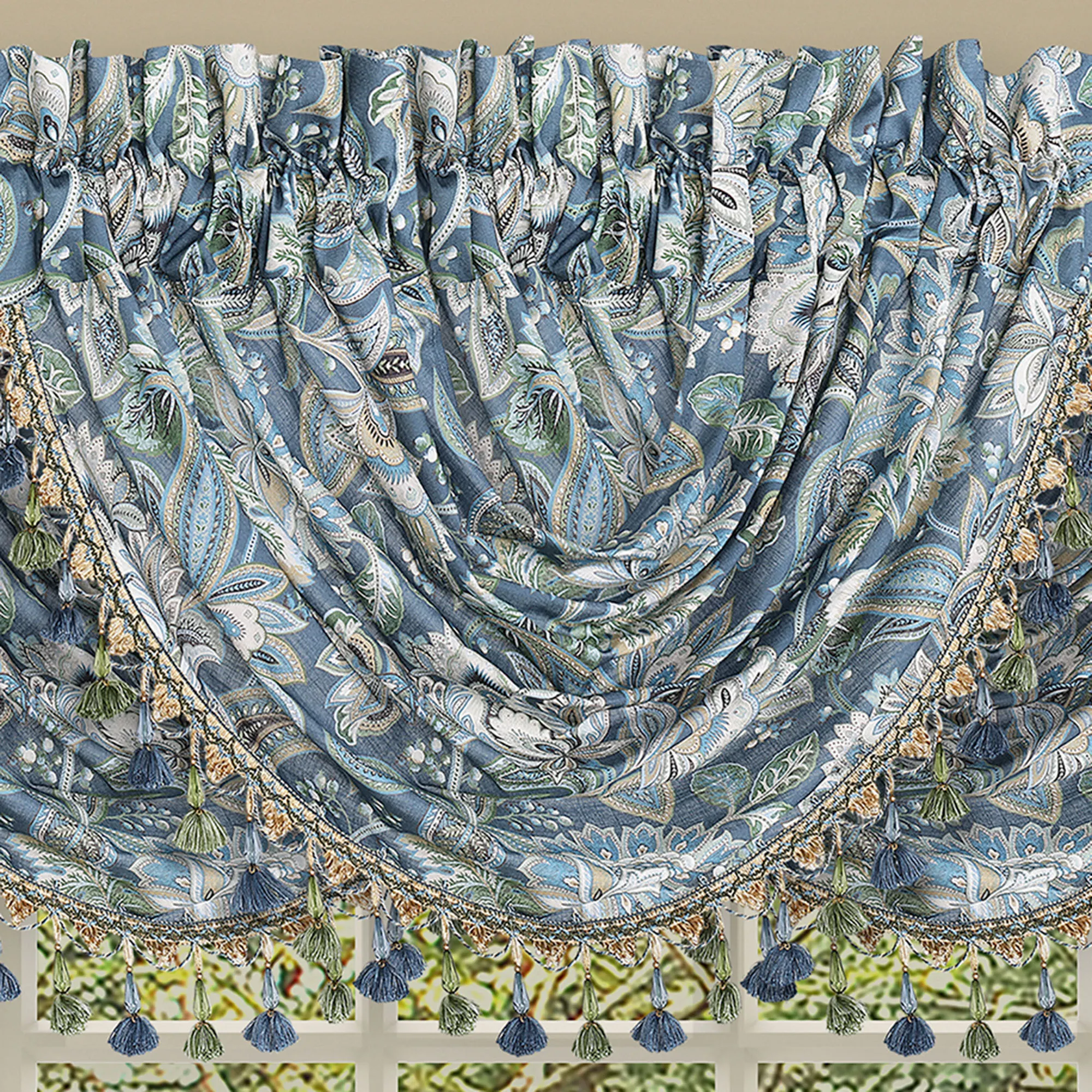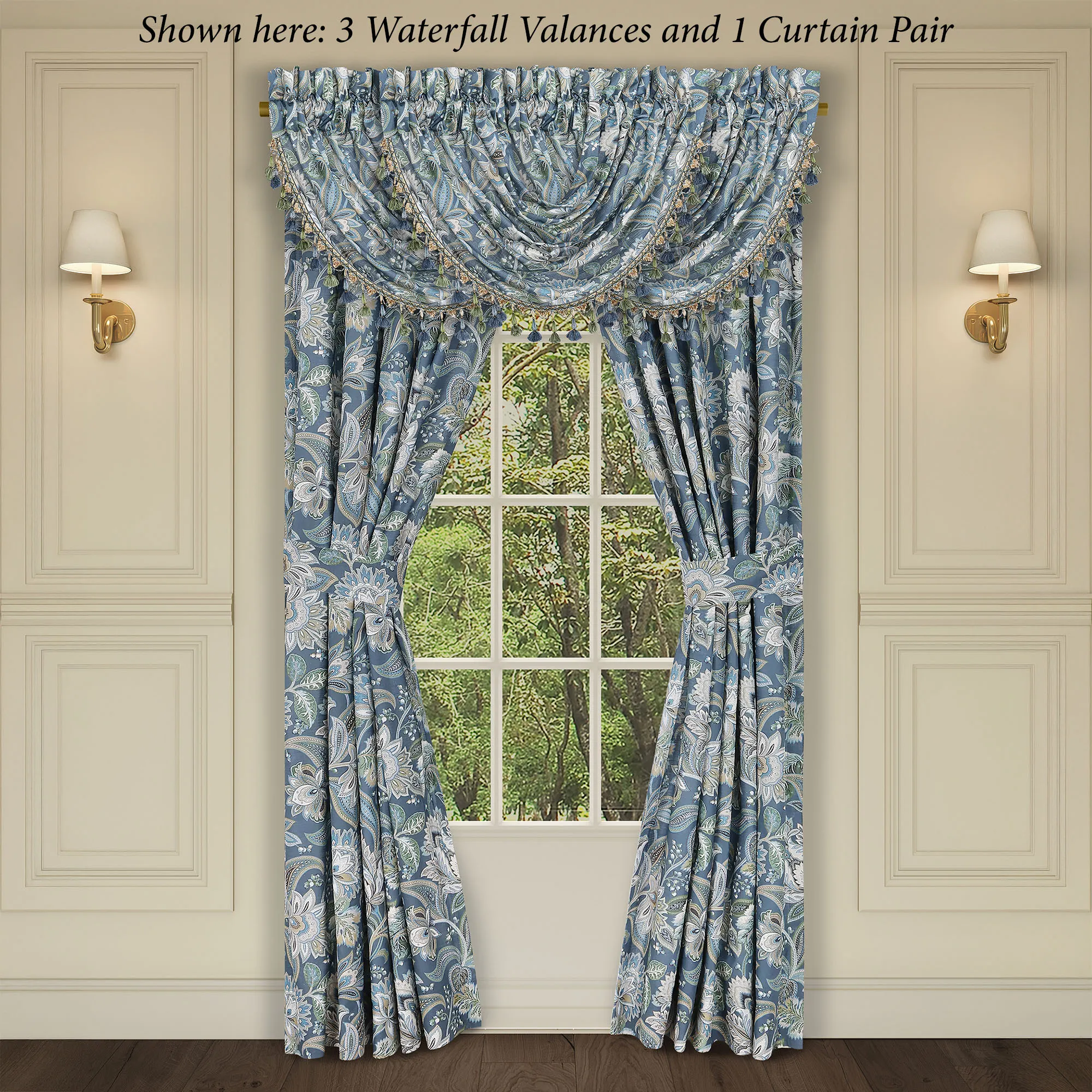Lined Window Treatments have Jacobean florals and 3" rod pockets. Wide Curtain Pair has tailored edges and includes tiebacks. Each Waterfall Valance has a gimp trim and tasseled edge. We recommend one valance for every 12"-15" of window width.
