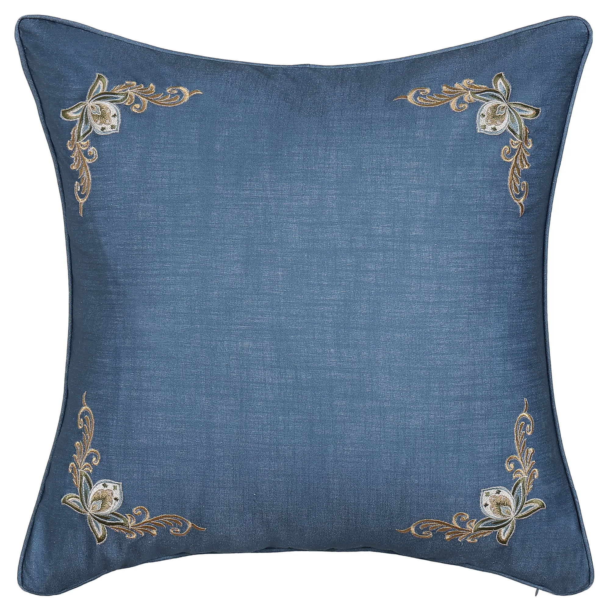 Piped European Sham is slubbed woven blue with corner floral and scroll embroidery; zipper closure.