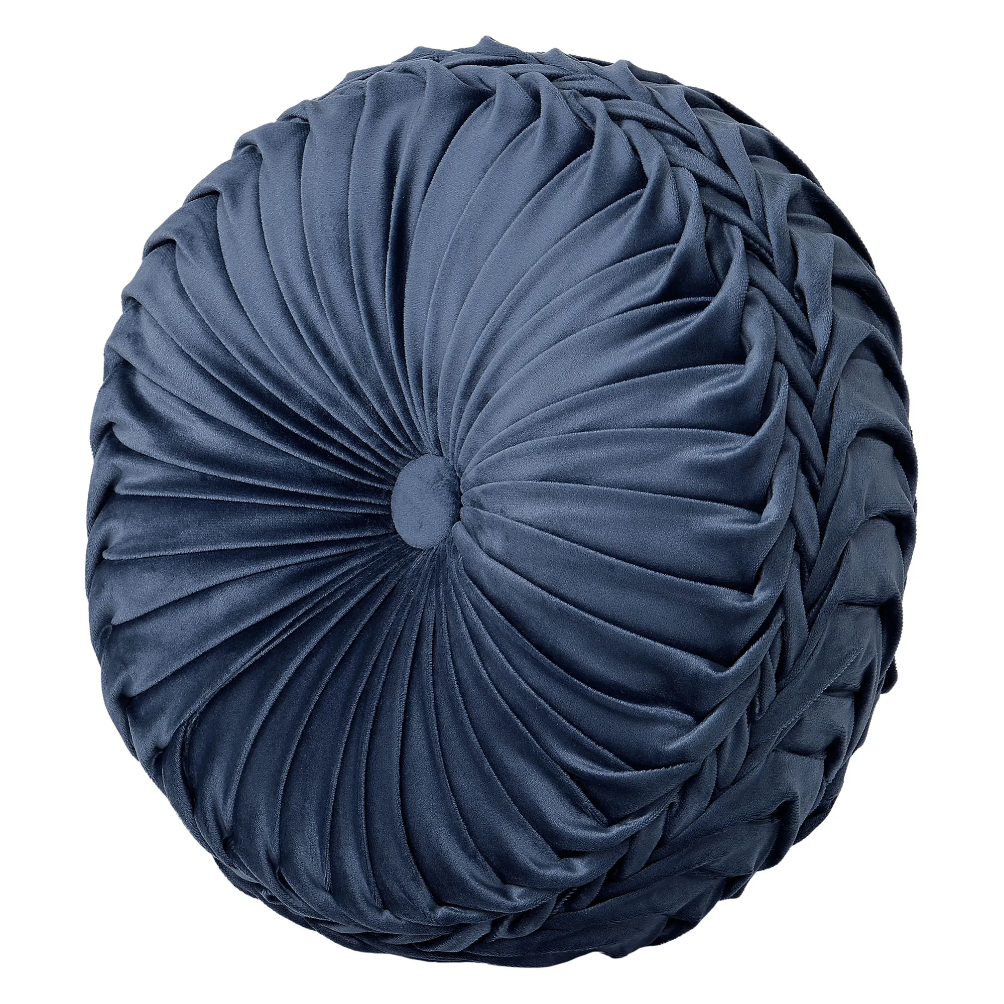 Pillows: Spot clean. The piped 18" Square is blue velvet with corner floral and scroll embroidery and a center button tuft; reverses to solid velvet. The piped 20" Square has Jacobean florals. The reversible, handmade Round is pleated blue velvet with a center button tuft and a 3" side gusset. Pieced Rectangle has a Jacobean floral center, blue velvet sides, gimp trim accents, tasseled ends, and a solid blue velvet reverse.