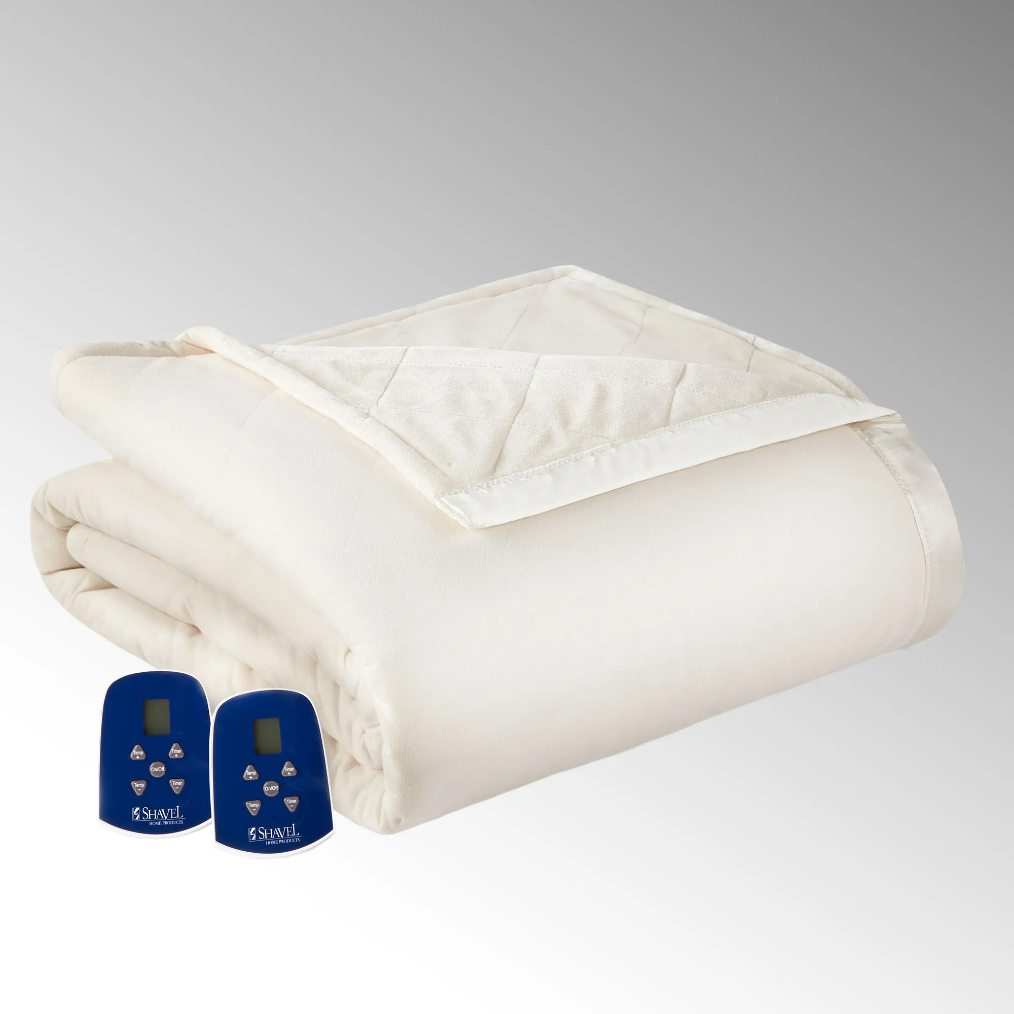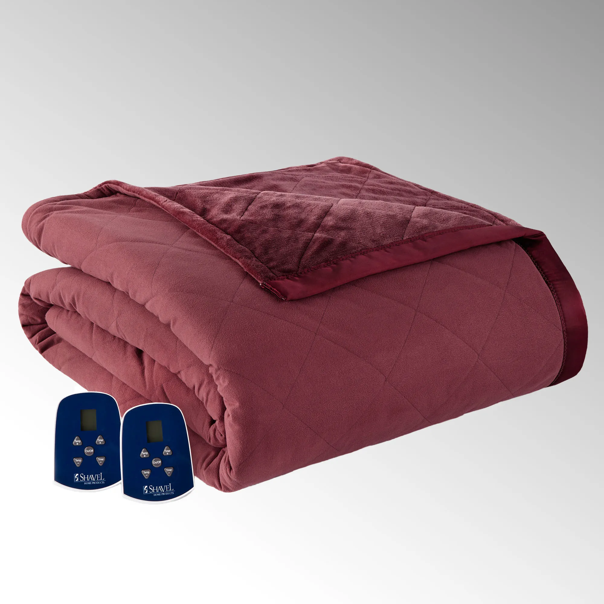 Relax in the cozy comfort of the Micro Flannel(R) Electric Blanket. With a reversible design, the color-lasting solid polyester blanket features a Micro Flannel(R) front and Ultra Velvet(R) reverse with a luxuriously soft design, block quilting, satin flange top edge, and mini-flange edges. The fantastic design also resists sliding on the bed, pilling, wrinkling, and shrinking; provides warmth without the weight and bulk; and saves energy with fast washing and quick drying. The programmable timer provides maximum convenience with a 10-hour safety shutoff, 8 secure heat settings, a 16' cord, detachable plugs, and soft wire technology with no-shift tac-tite(TM) sewing. Queen and King feature dual controls; Full has one. Full is 72"x90". Queen is 90"x90". King is 108"x90". ETL tested and certified. Five-year warranty included. Machine washable. Imported. This item should not be used on a waterbed or an adjustable/mechanical bed.