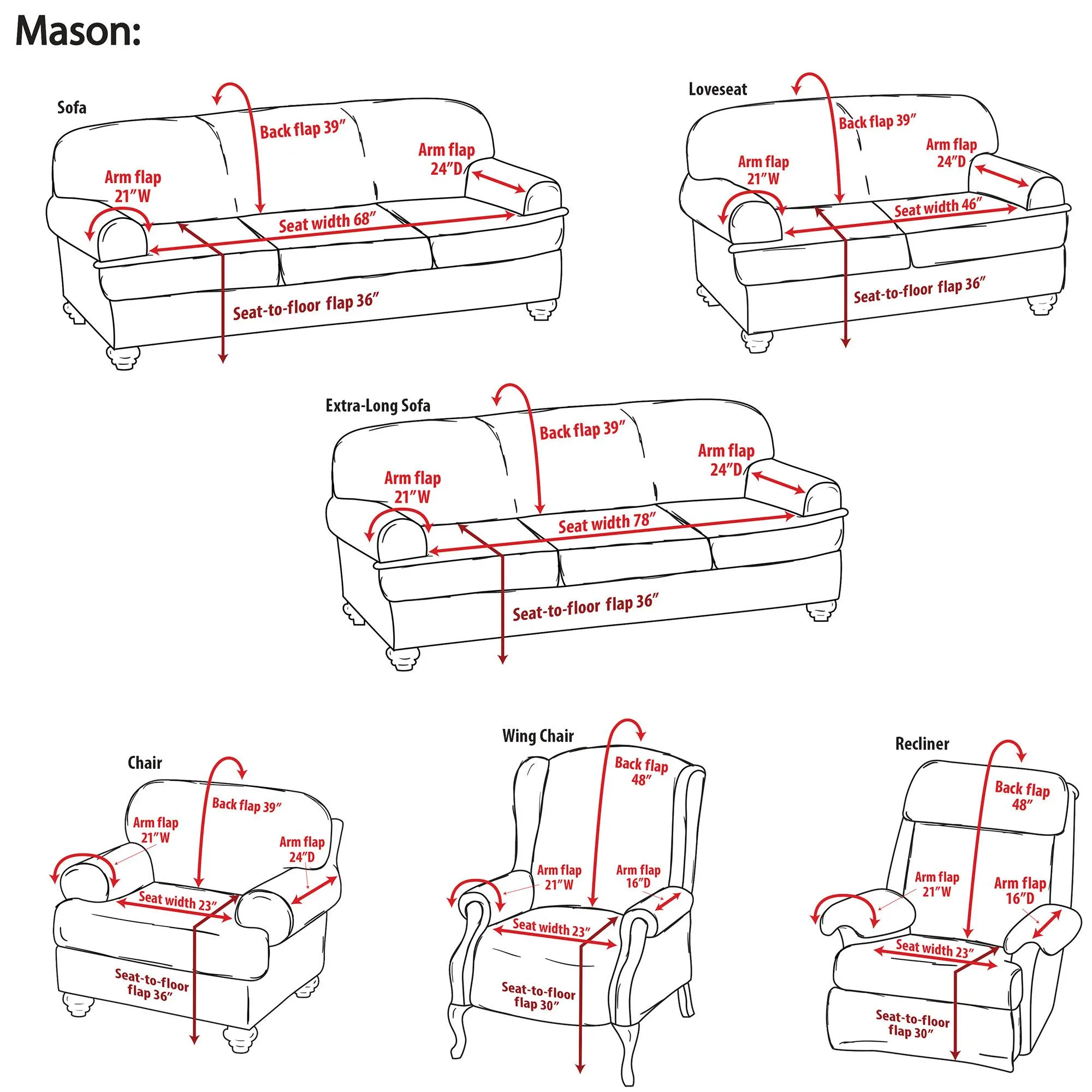 Each arm flap is 21"Wx24"D. Back flap is 39"D. Seat-to-floor flap is 36"D.