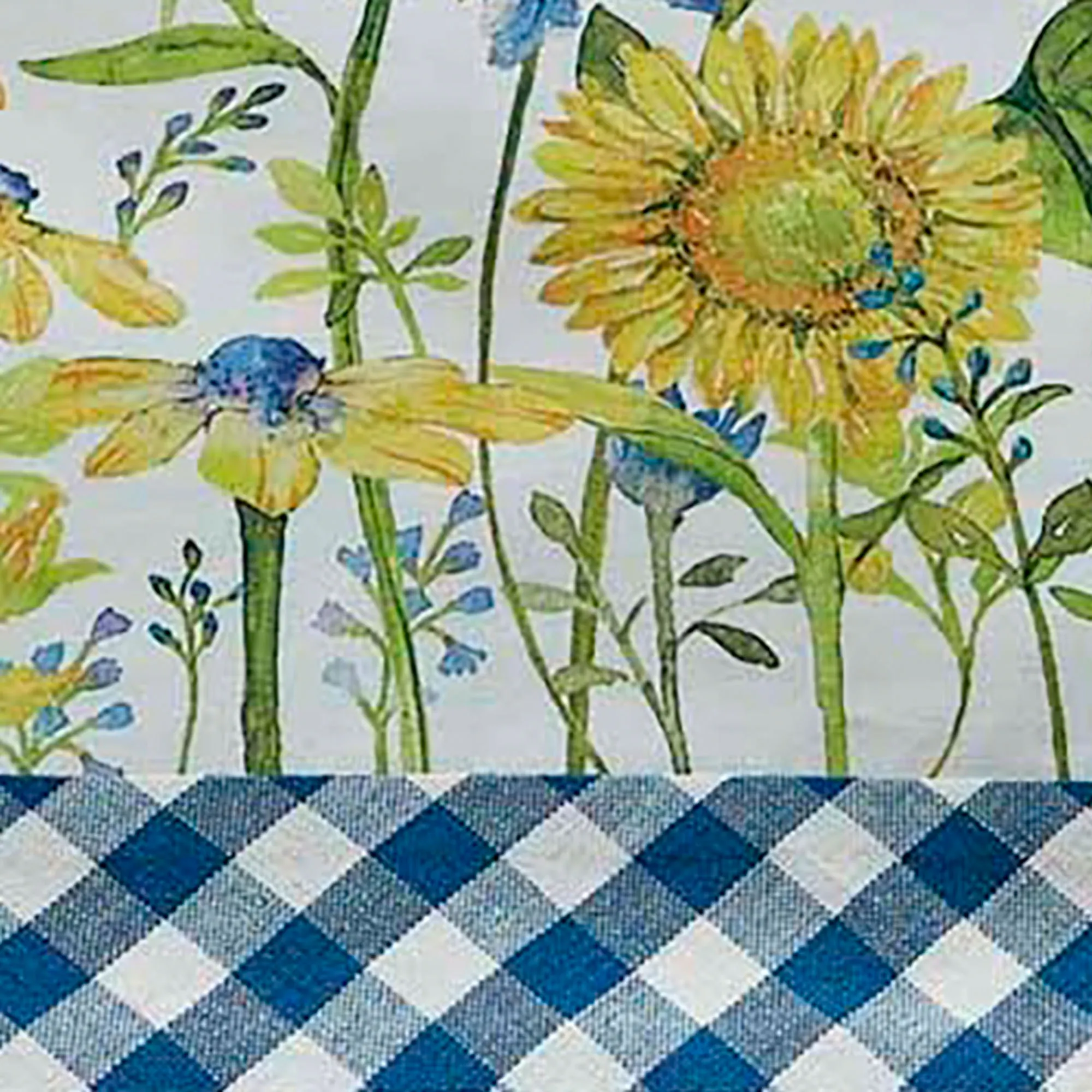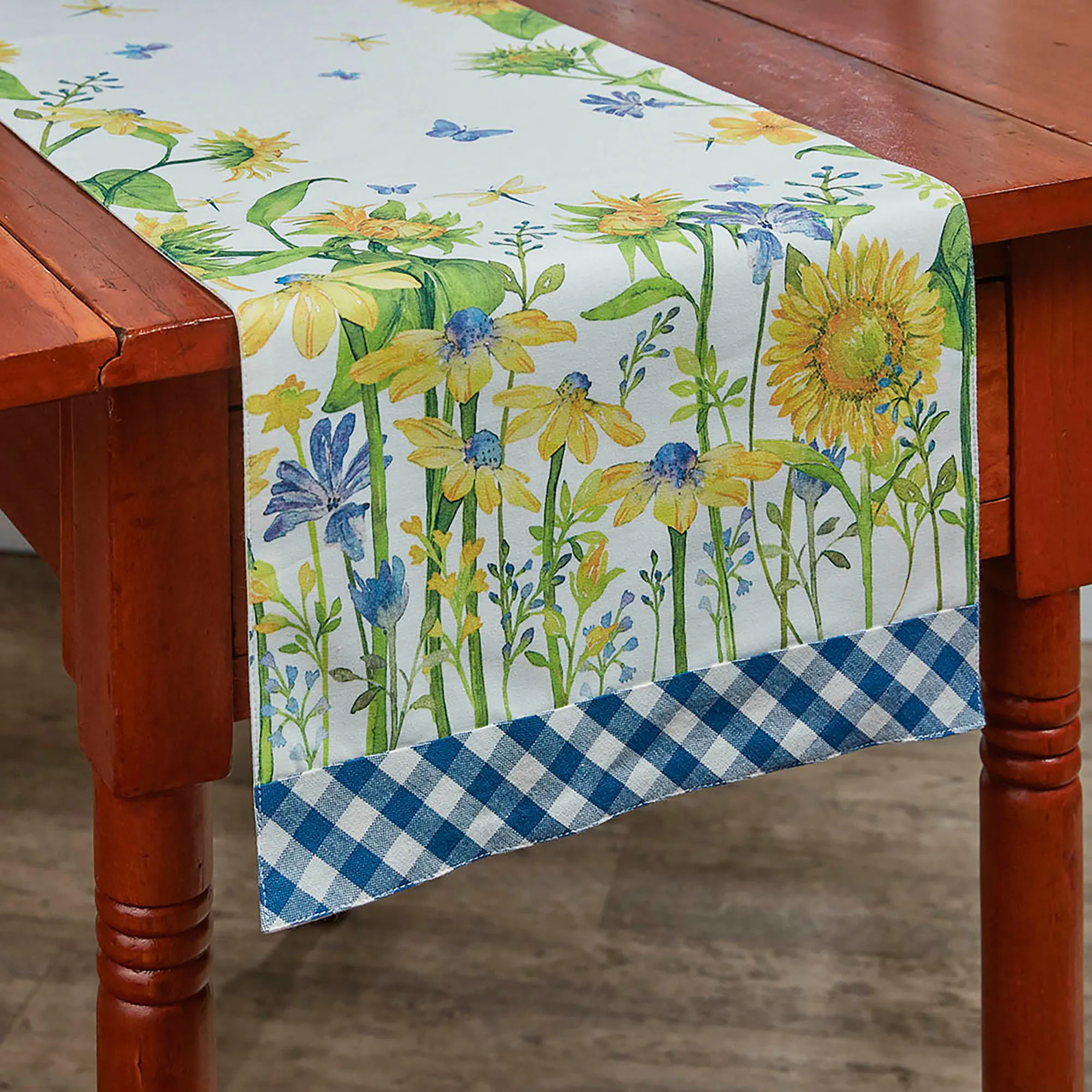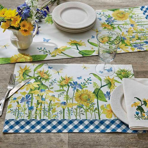 Picnic among a Mid Summer's Day at your dining table with these beautiful floral table linens. Printed with a natural charm, each white cotton table accent blossoms with bold yellow sunflowers, black-eyed Susans, blue wildflowers, and green leafy sprigs. Charming dragonflies and butterflies flit about the blossoms as they tilt toward the sun. A blue and white gingham plaid accent edge adds further whimsy to the ends of the Table Runner and the bottom of each Placemat. Table Runner is 13"Wx54"L. Placemats are 19"Wx13"L each; sold as a four-piece set. Machine washable. Imported.
