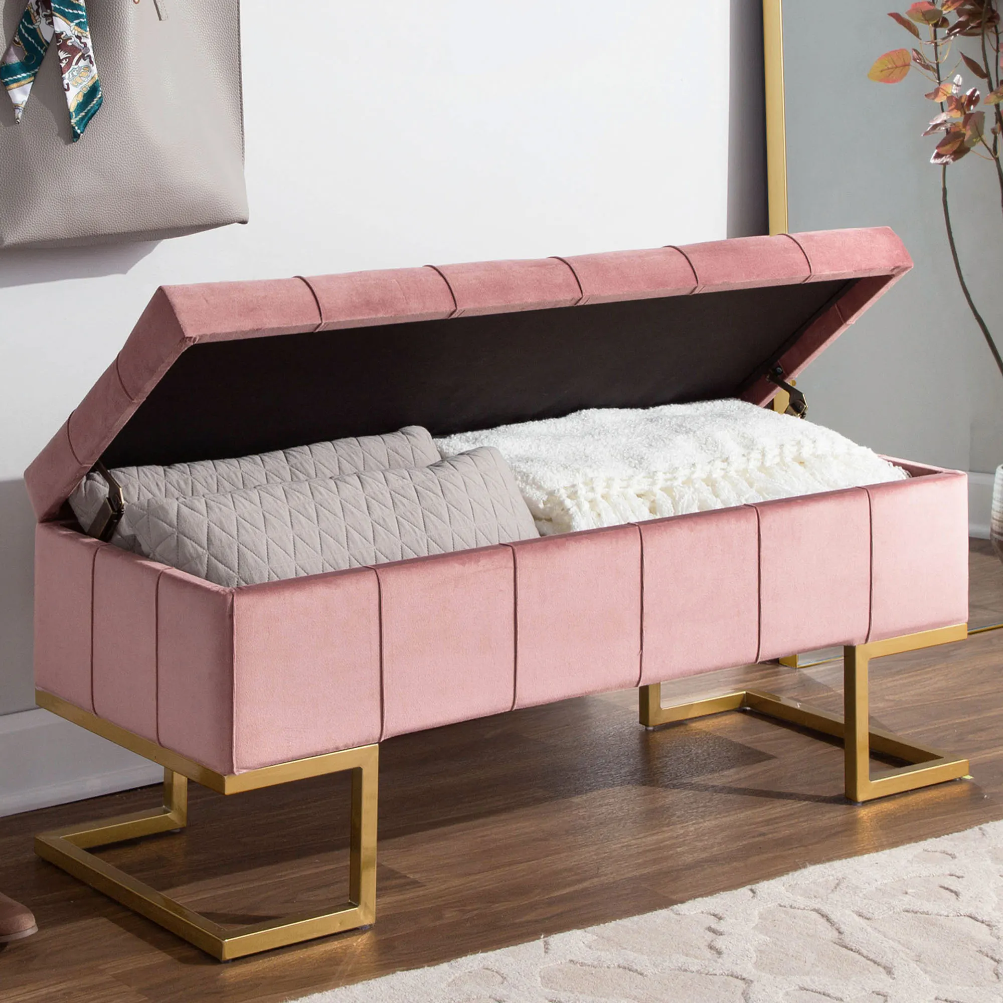 Update the look of any room with the classic yet somewhat modern style of the Midas Pink Upholstered Storage Bench. Perfect for seating and keeping items out of sight, this storage bench has pink velvet fabric, button tufting, a foam cushion, a hinged lid, and geometric metal legs with a gold finish. The black interior storage space measures 39.75"Wx13.25"Dx4.75"H, and the weight capacity is 500 lbs. Overall, the storage bench measures 41"Wx15"Dx17"H; weighs 25 lbs. Spot clean the fabric.