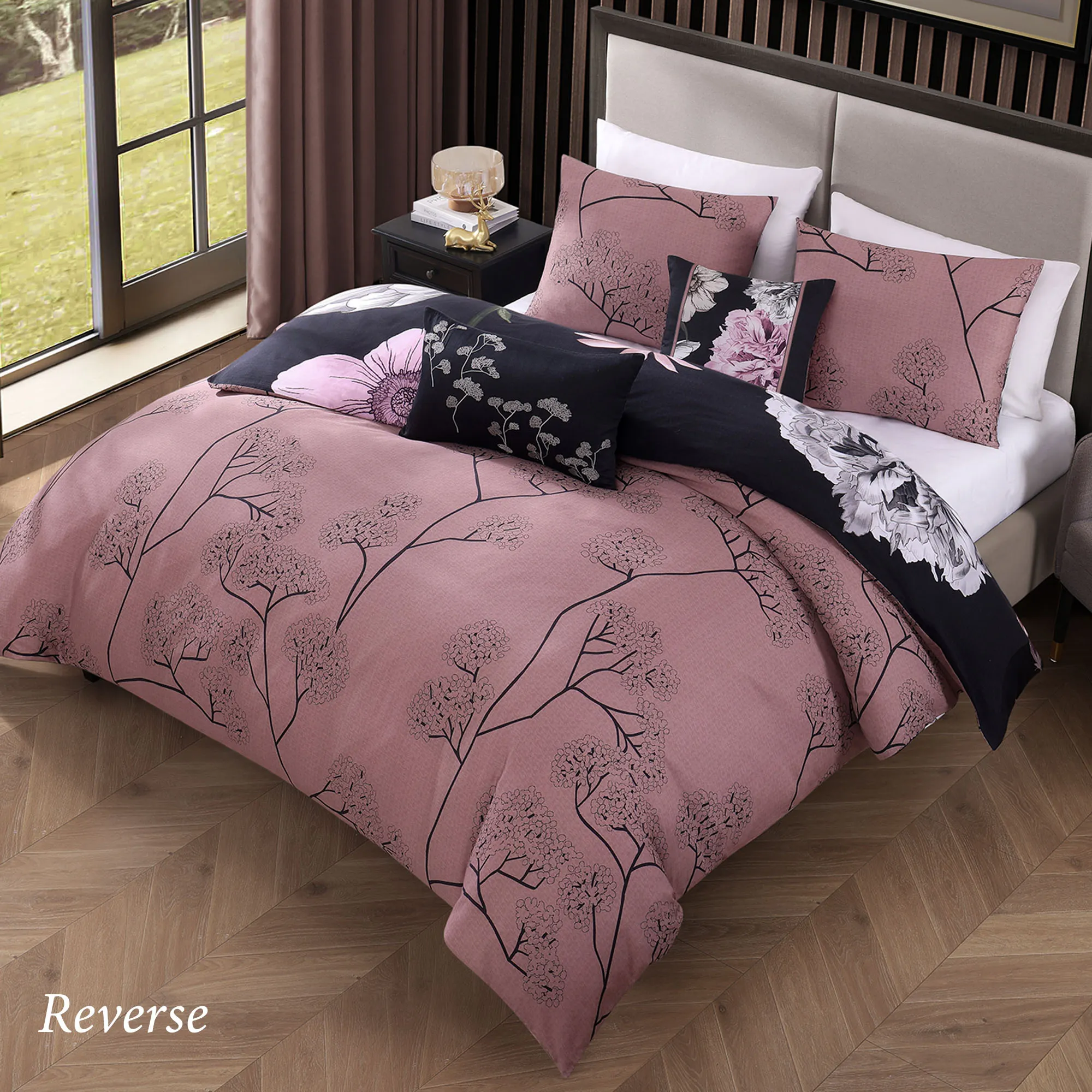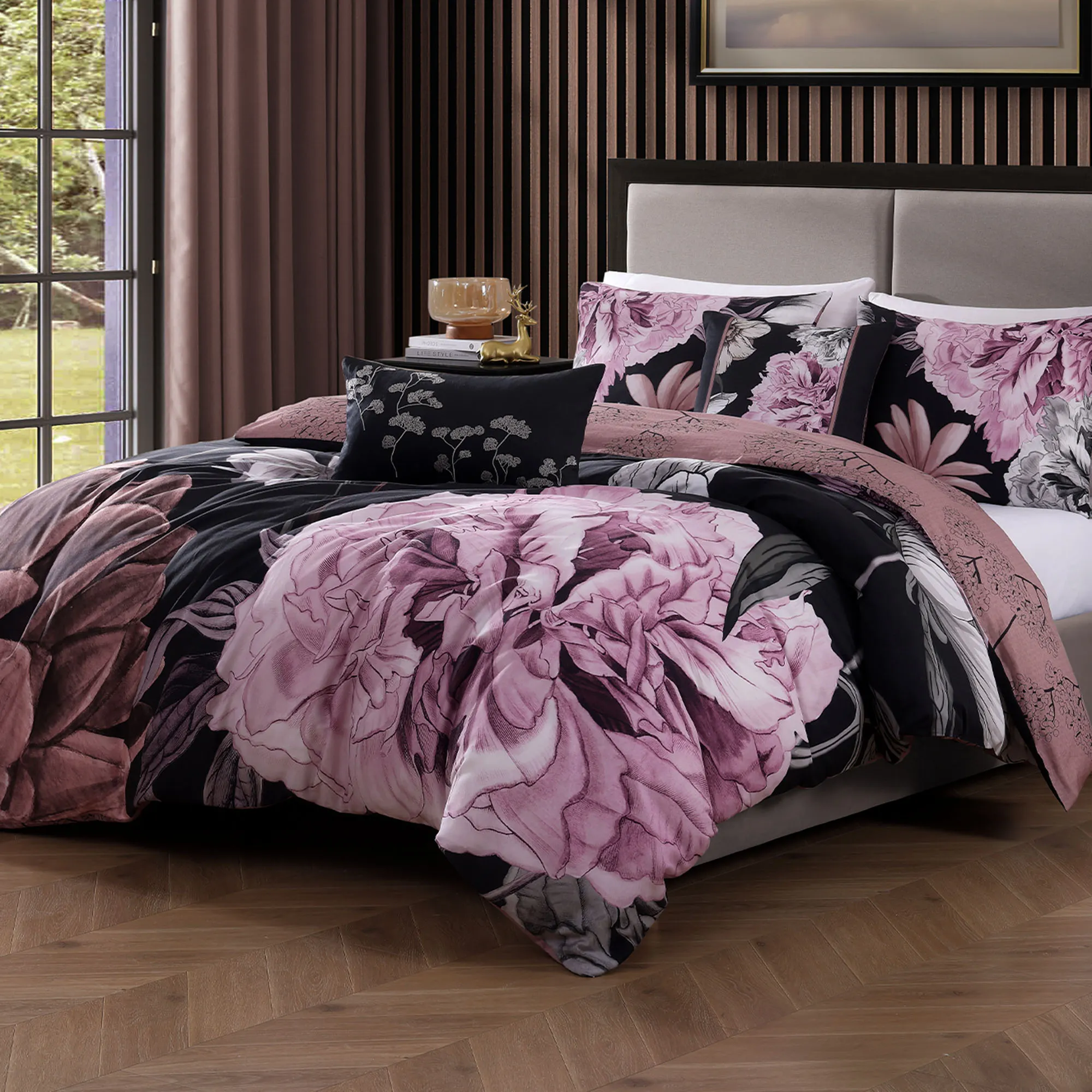 Midnight Meadows Reversible Mauve Purple Black Floral 5 pc Comforter Bed Set