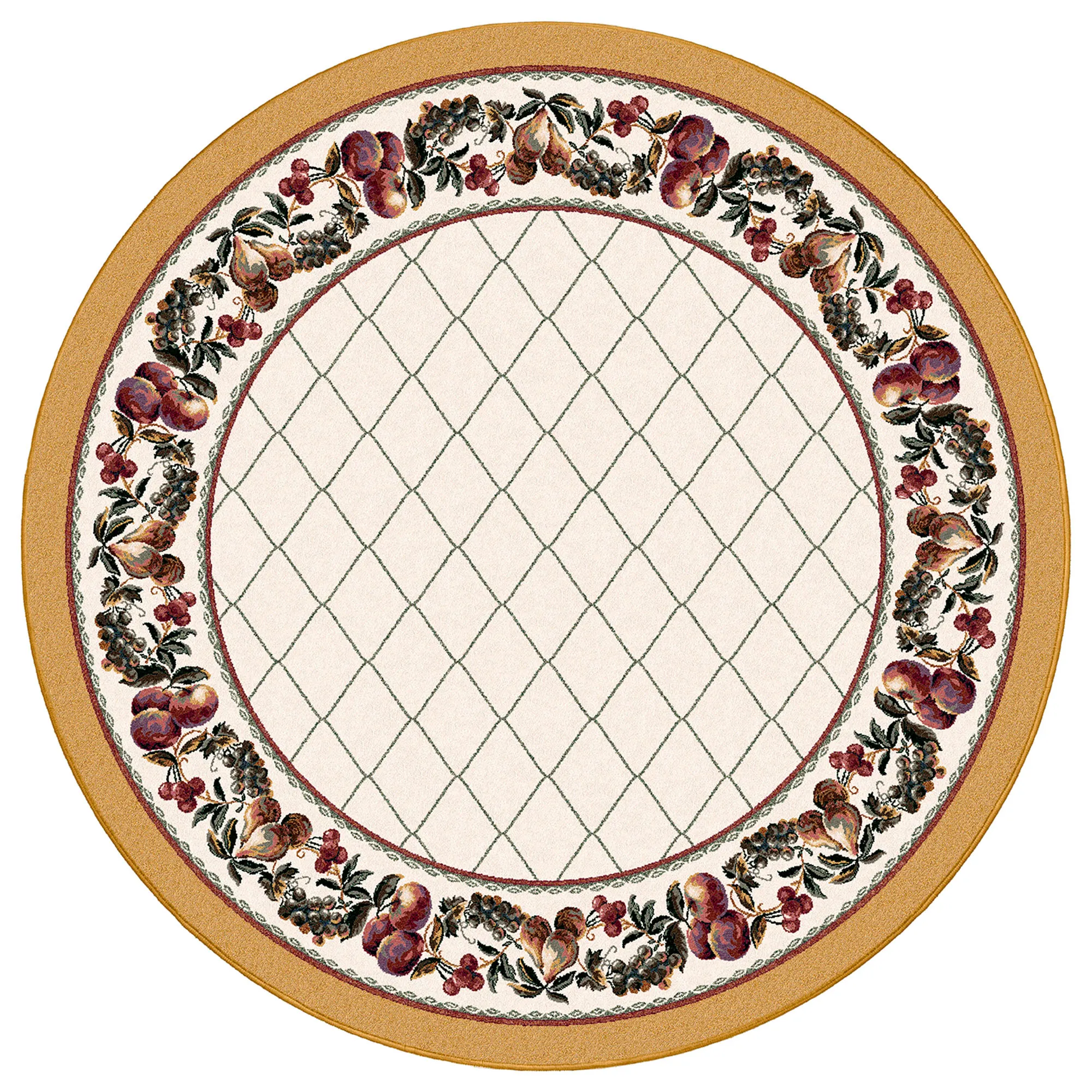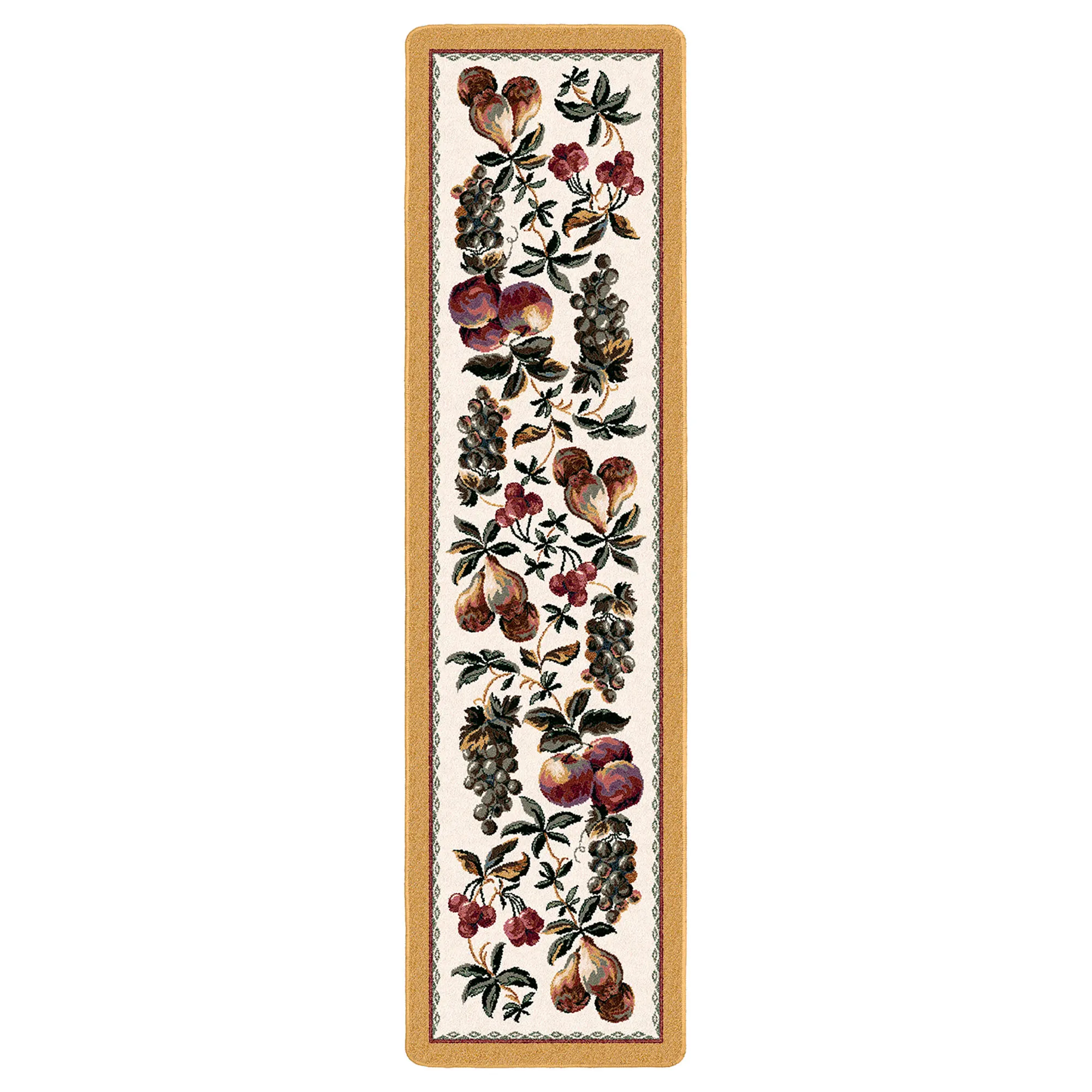 Fruits with leafy vines are ready for harvest on the Milena Rug. This power-loomed nylon area rug, .375" thick, features a central lattice pattern and summer fruit and vine designs on ivory, along with a solid amber outer border. Colors include shades of ivory, amber, dark green, off-white, tan, burgundy, black, gray, and brown. The warp-resistant rug is kid- and pet-friendly and has StainSmart(R) technology that offers protection from water-based spills. The Endura-Loc(TM) backing is polypropylene/polyester/silicone. Please note: The rug runner does not have the lattice pattern. We recommend professional cleaning by a rug cleaner.