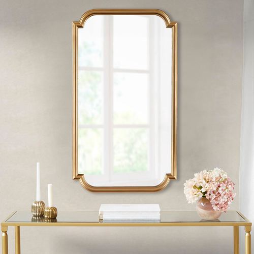 Place the Millicent Scalloped Wall Mirror in a setting where it can be admired often. This wooden wall mirror has a metallic gold finish, a central glass mirror, and scalloped corner designs. Mirror may hang vertically or horizontally. Measures 21"Wx1"Dx38"H.