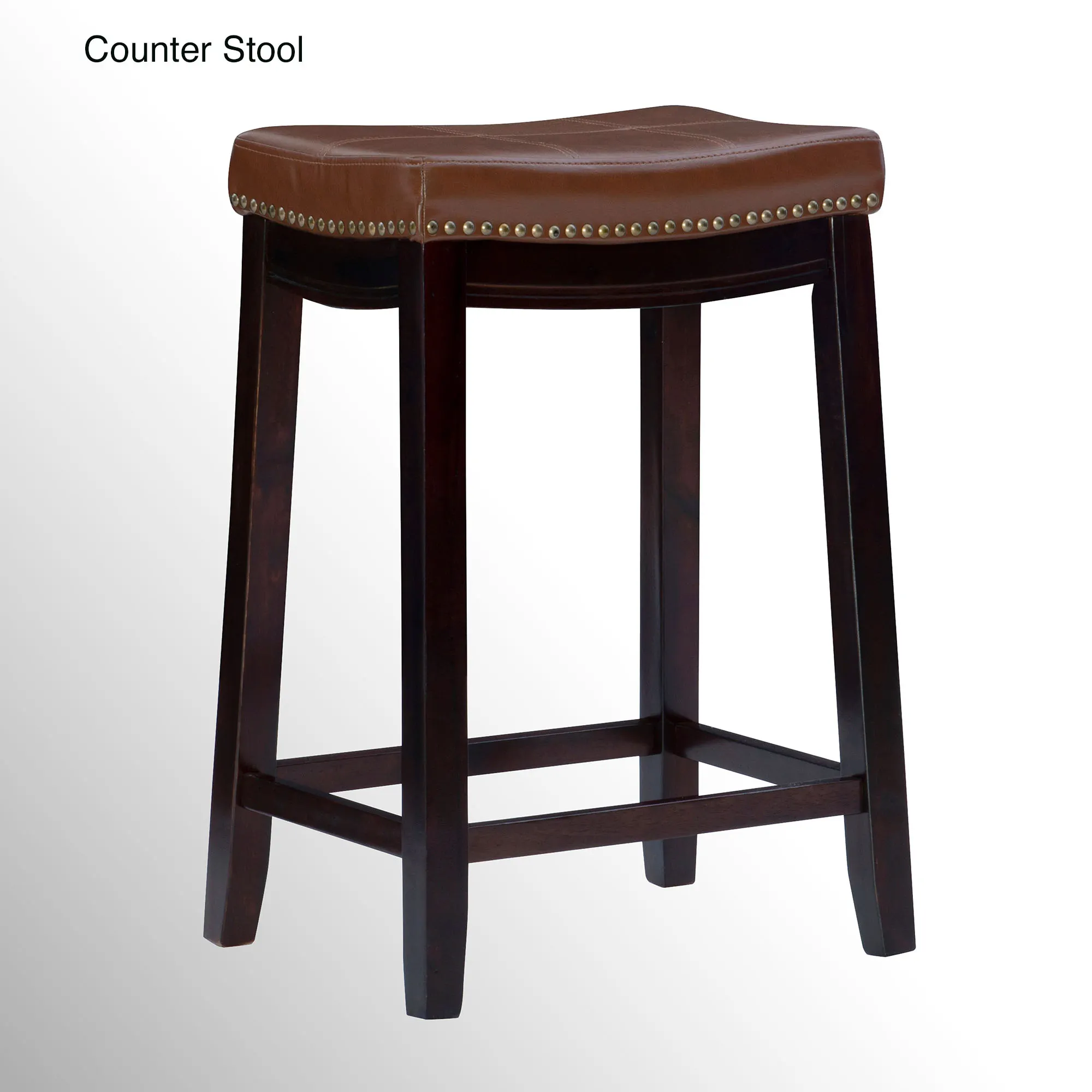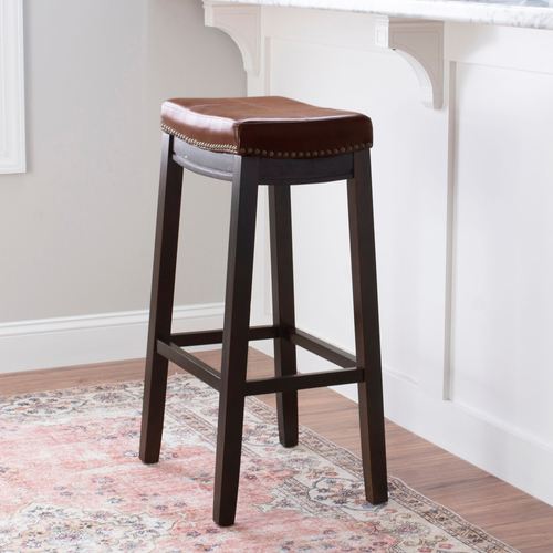 Charm your space with the attractive detailing found on the Milo Kitchen Stool. Finished in autumn cherry, the backless wood stool features sleek lines and a convenient footrest. Antique brass nailhead trim and double needle accent stitching embellish the saddle brown, faux leather, upholstered foam-cushioned seat for lovely finishing touches and added durability. Maximum weight is 275 lbs. Perfect for counter heights of 40" to 43", the Bar Stool measures 19"Wx15"Dx32.5"H and weighs approx. 18 lbs. Perfect for counter heights of 35" to 39", the Counter Stool measures 18.5"Wx14"Dx27"H and weighs approx. 17 lbs. Wipe the fabric clean.