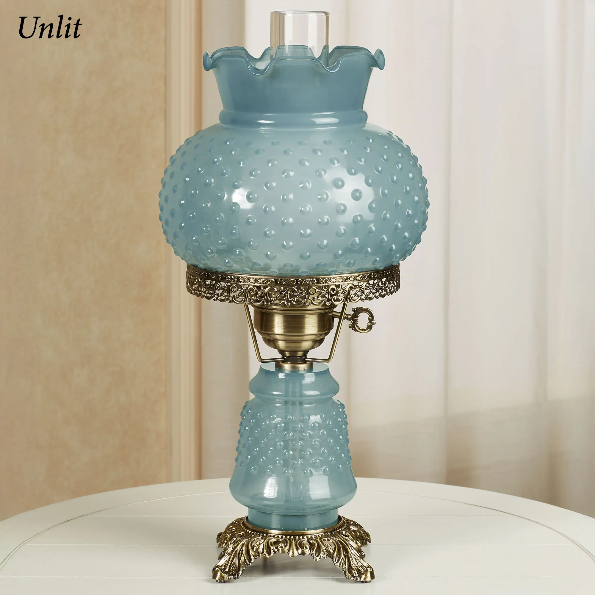 The Mindy Blue Hobnail Table Lamp displays vintage elegance with antique style. The handcrafted and handblown glass globe and font have an old-fashioned hobnail pattern. Metal accents on the font, base, and shade have an antique brass finish. The 10"H frosted glass chimney has a clear top. Key switch on socket operates three-way lighting on the top, bottom, or both. UL listed. Requires one 60W max. bulb (not included) and one 7W nightlight bulb (included). Measures 9"dia.x20.5"H.